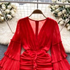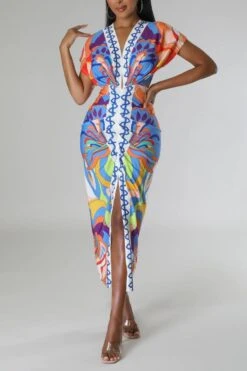 Sexy Plus Size Non-stretch Multicolor Printing Deep V Slit Pleated Midi Dress Wholesale Sexy Dresses