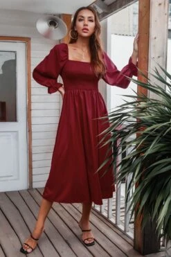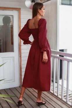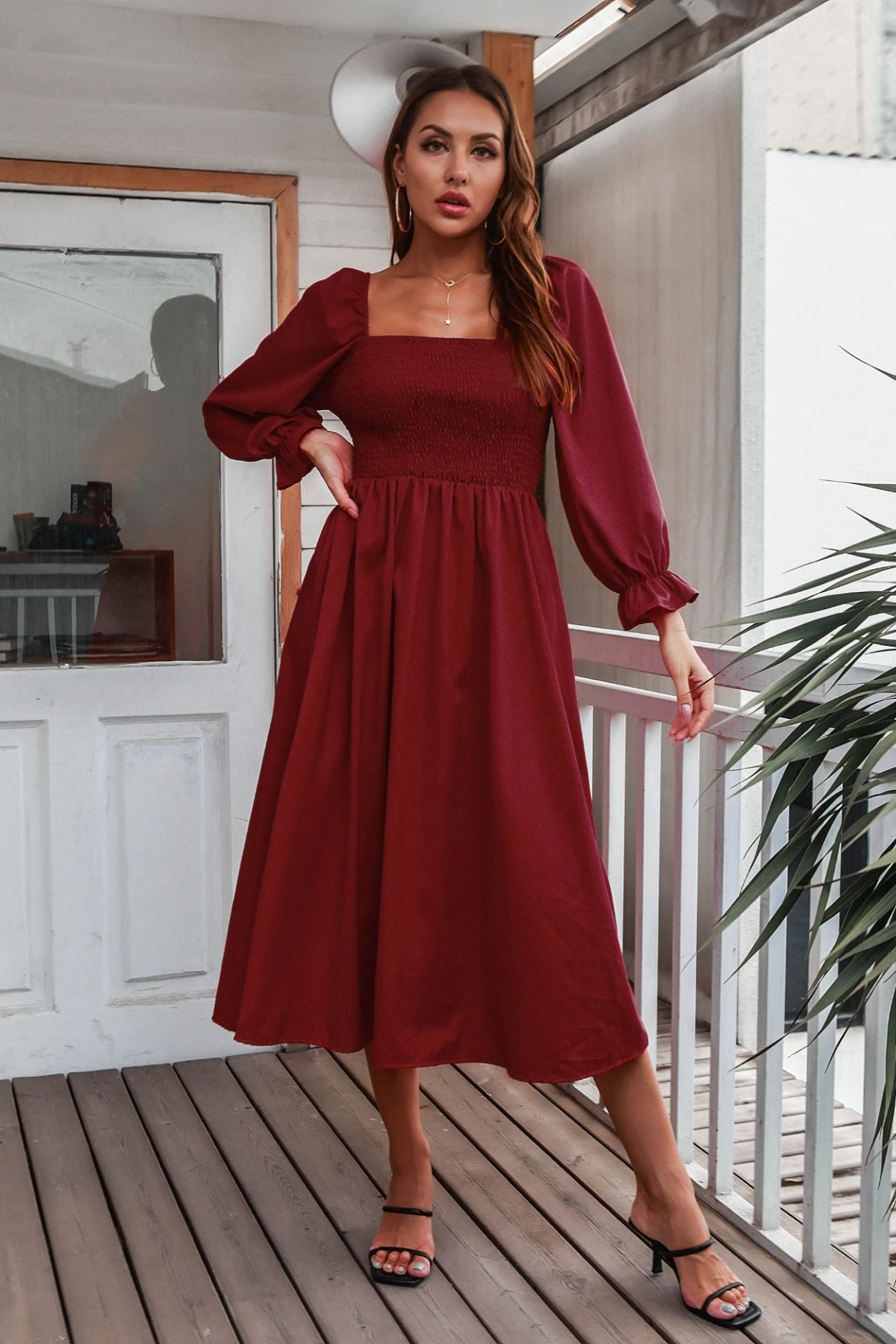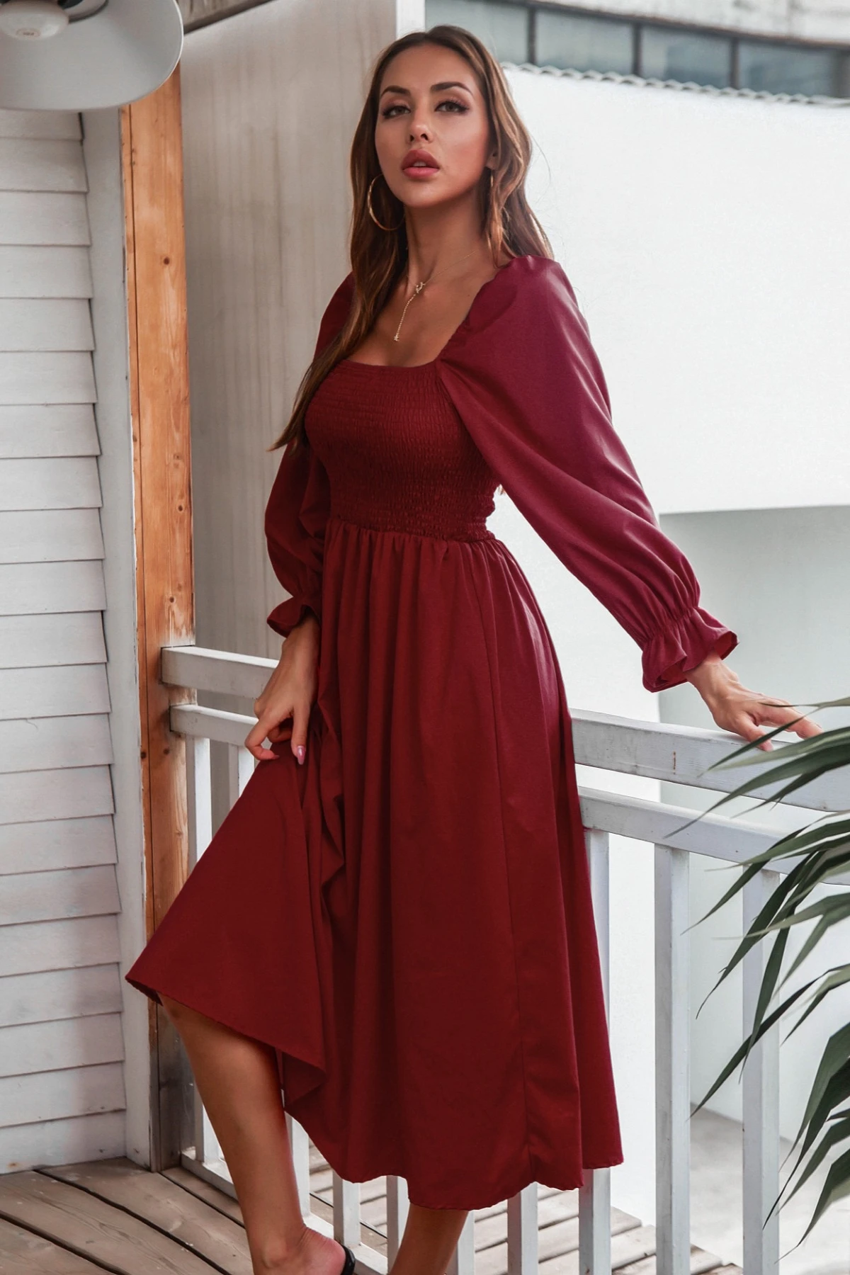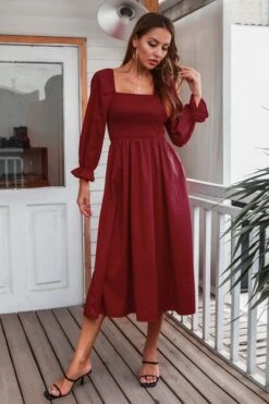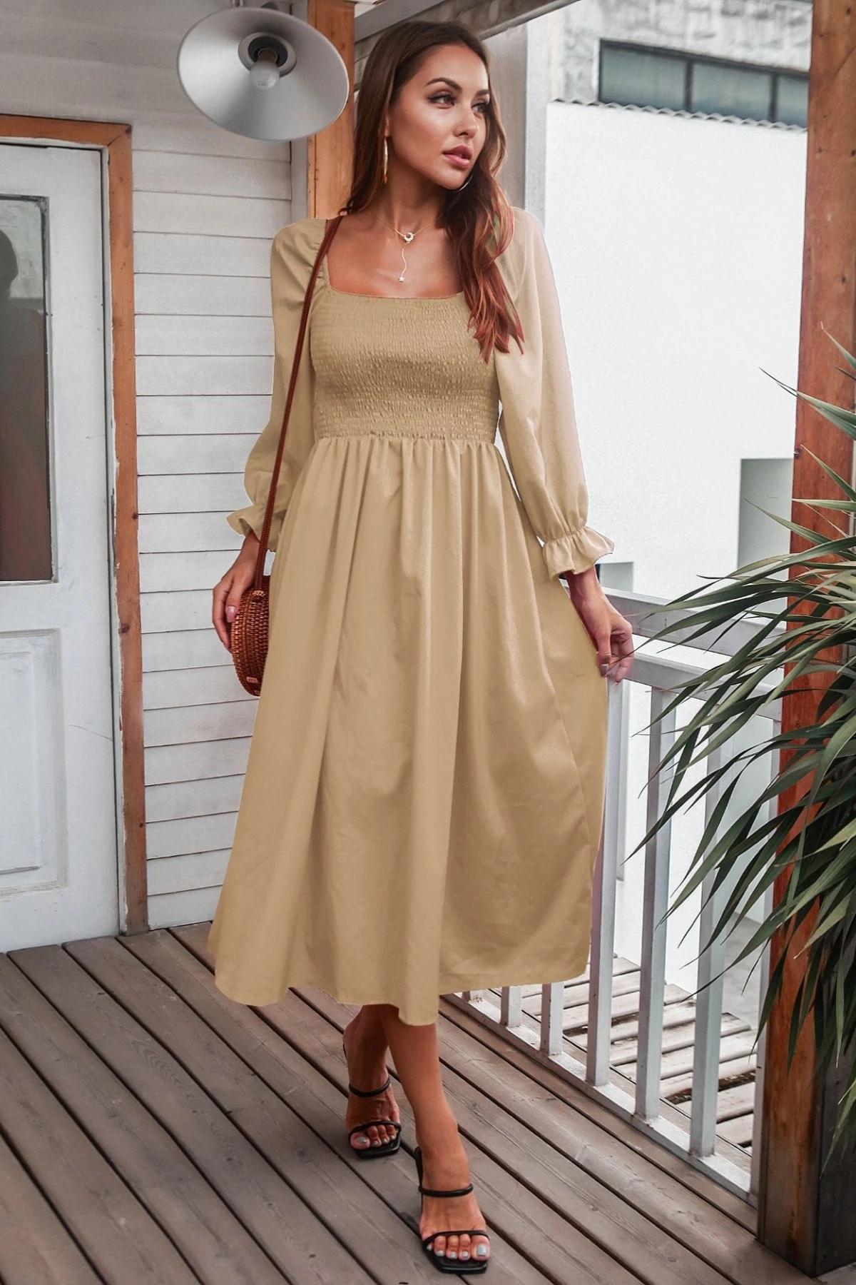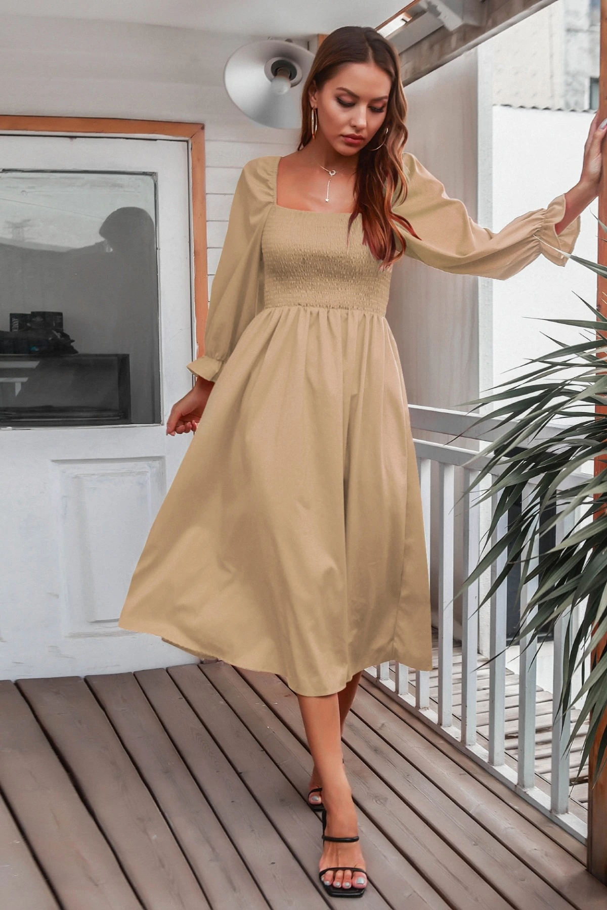 Autumn new solid color inelastic square-neck backless stylish casual midi dress