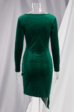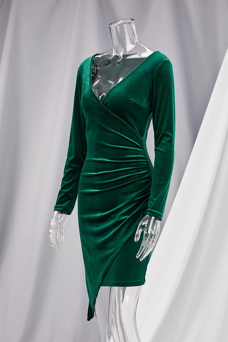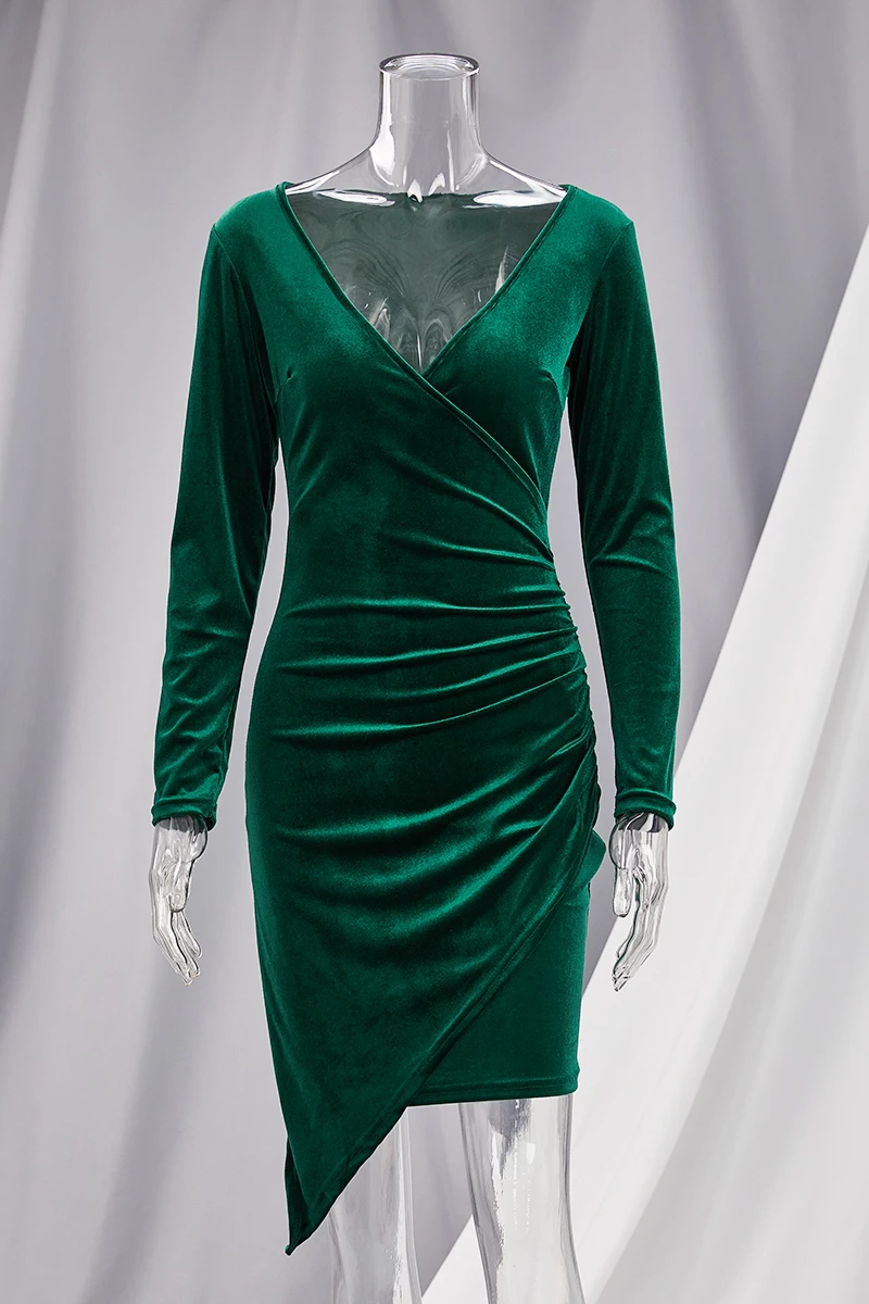 Autumn new solid color pleuche fabric stretch V-neck irregular hem sexy bodycon mini dress