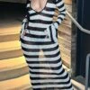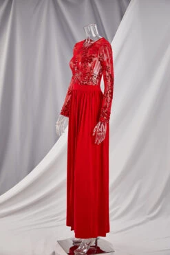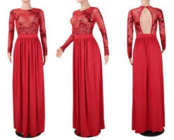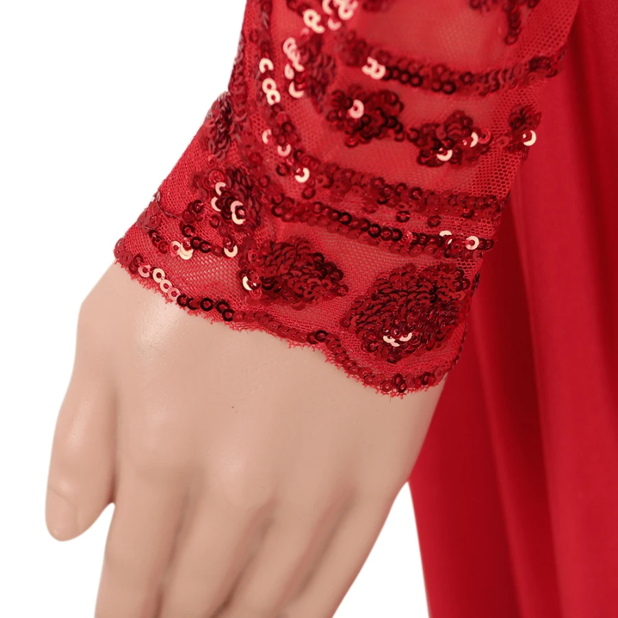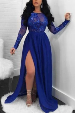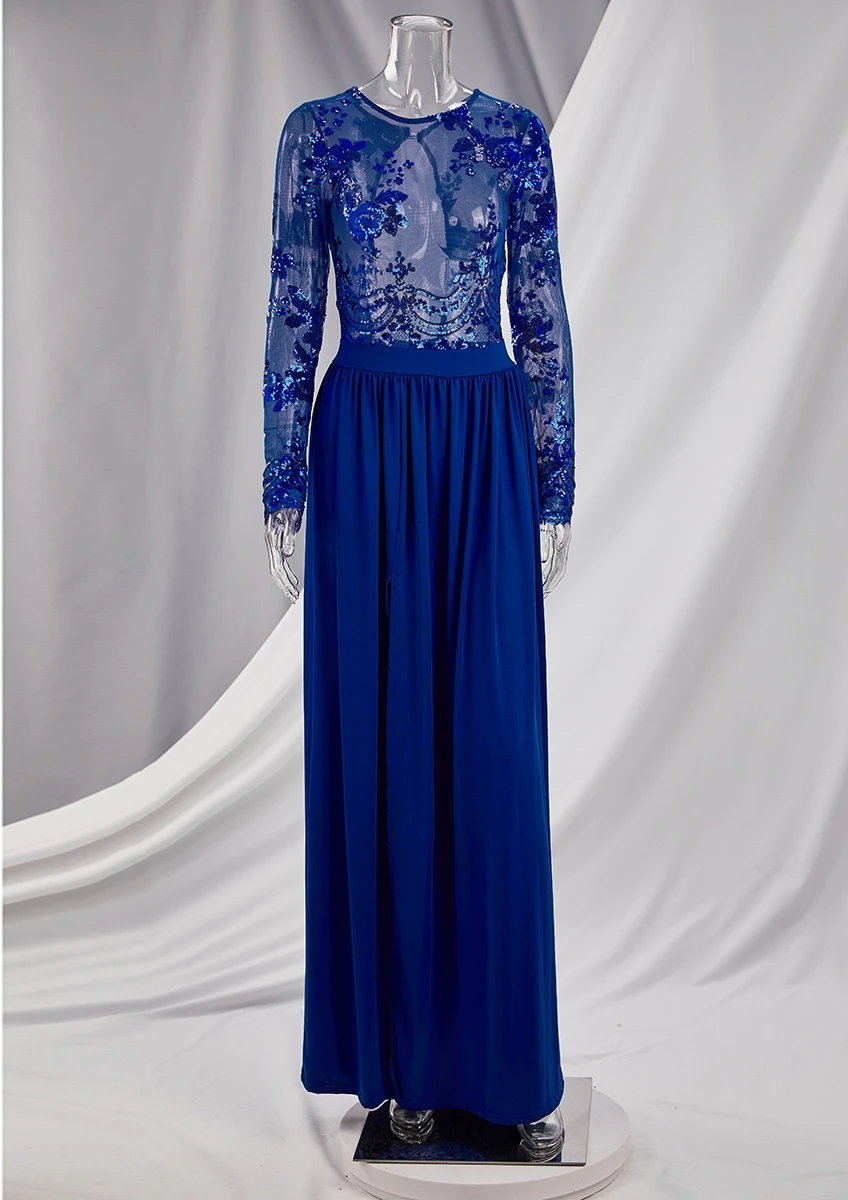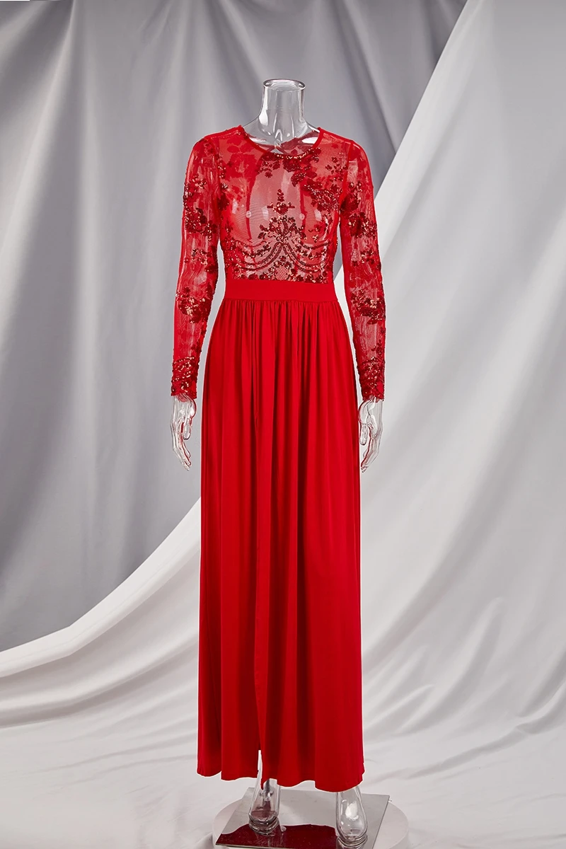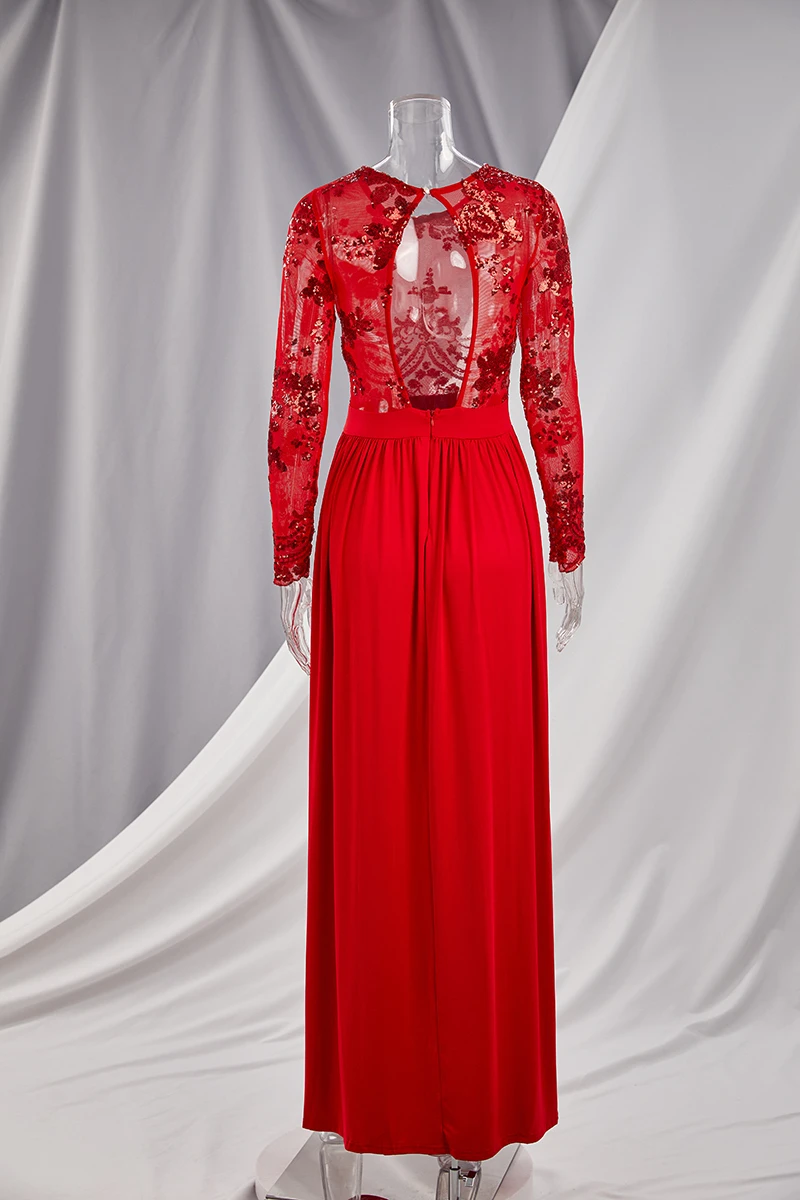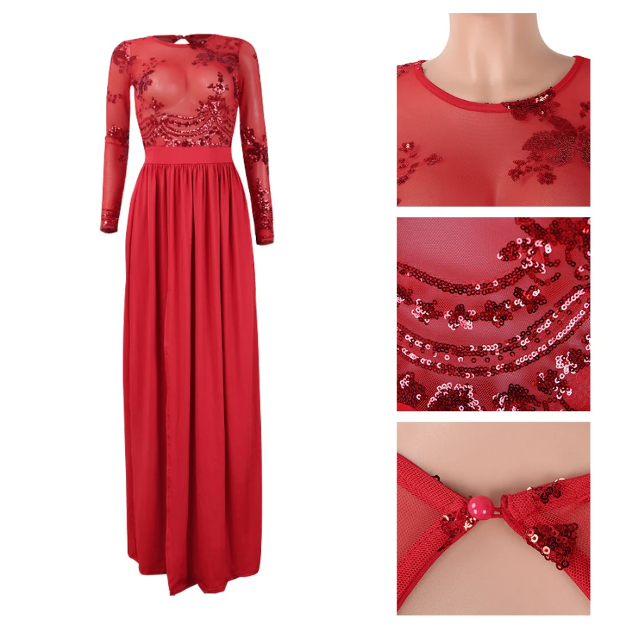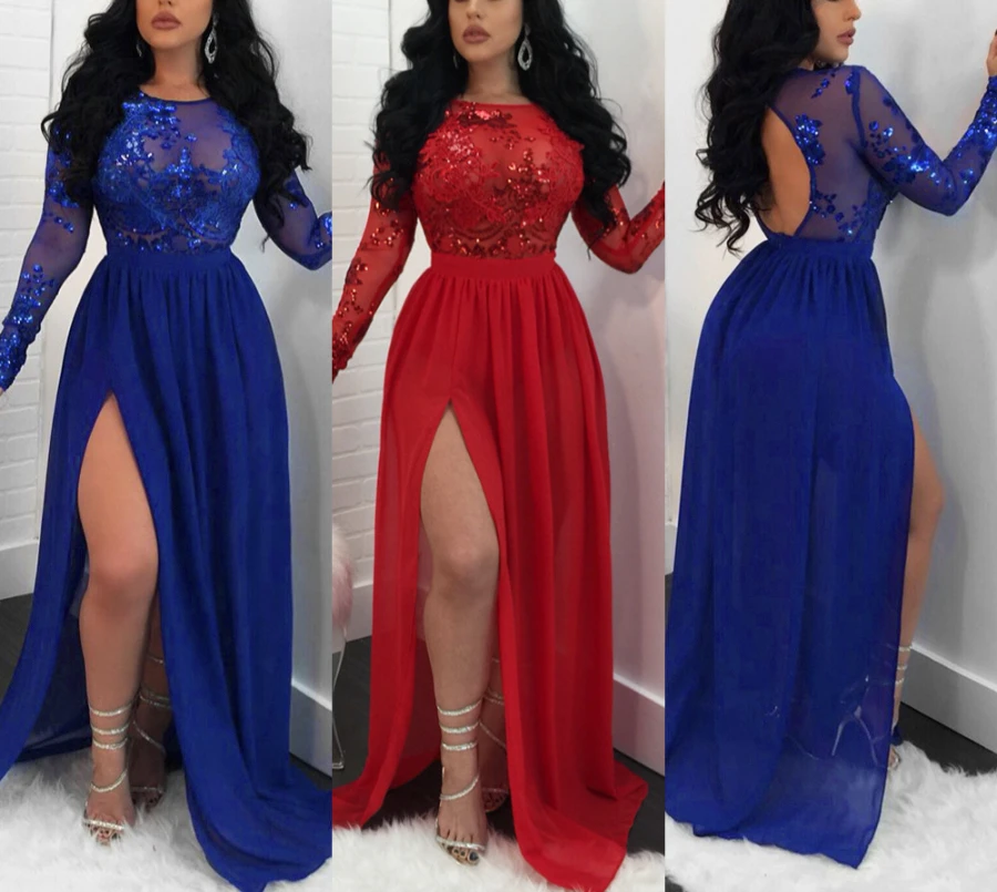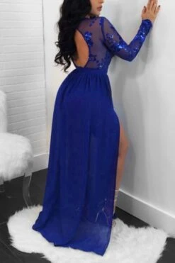 Autumn new stylish mesh see through stitching sequin backless micro elastic slit maxi dress