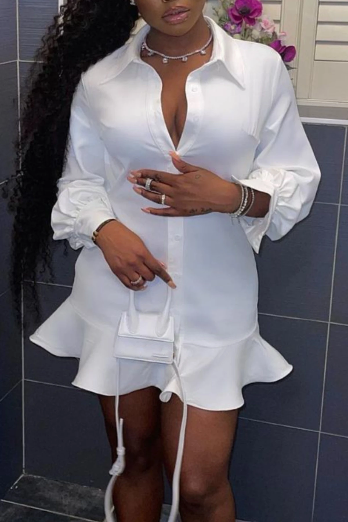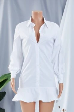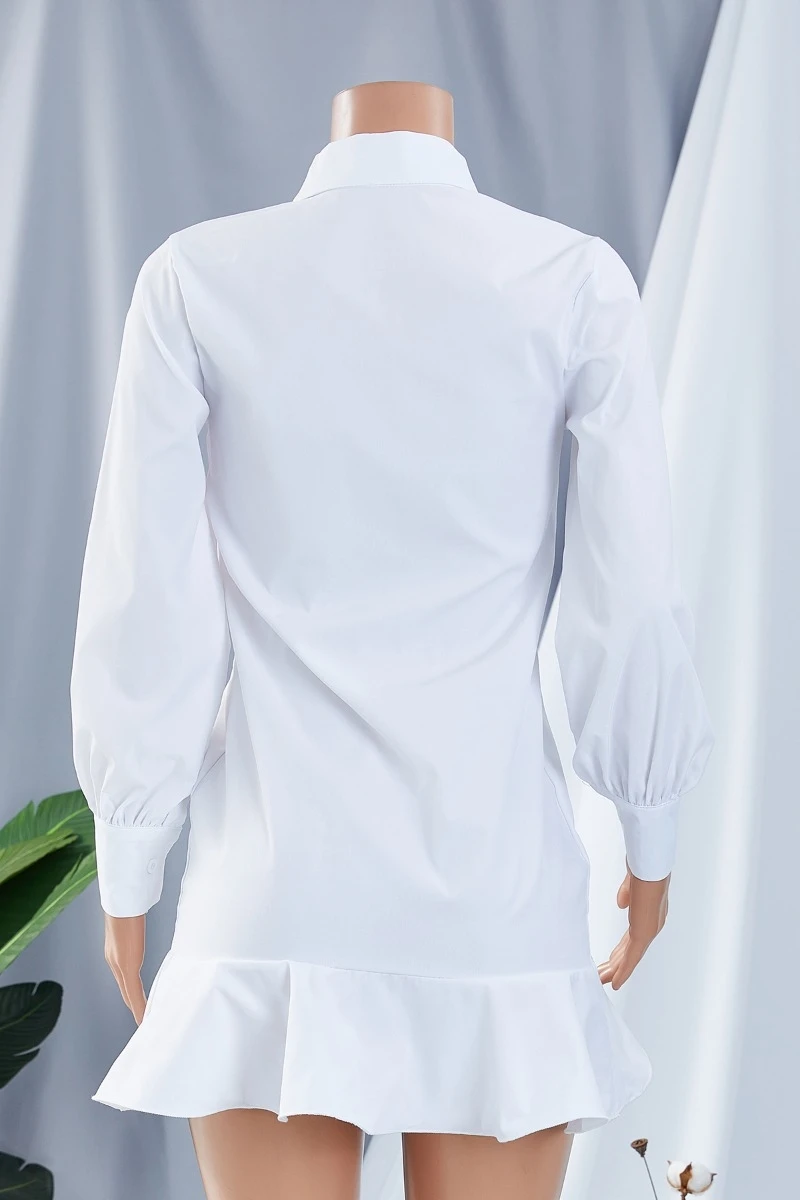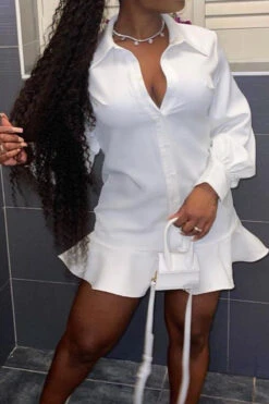 Autumn solid color single breasted turndown collar new style inelastic ruffle mini dress