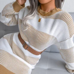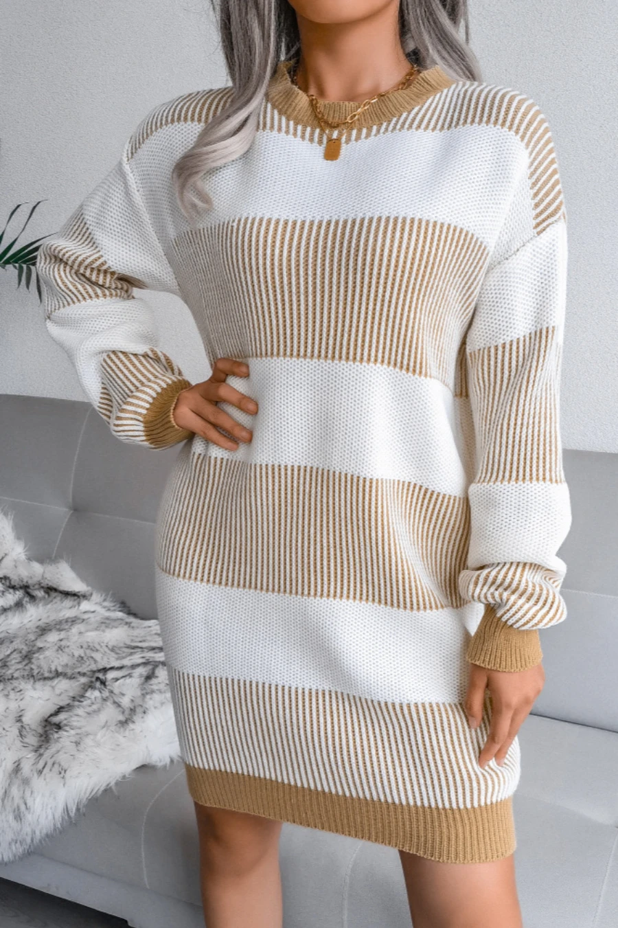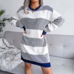 Autumn three colors new stripe contrast color knitted casual loose mini dress (without belt)