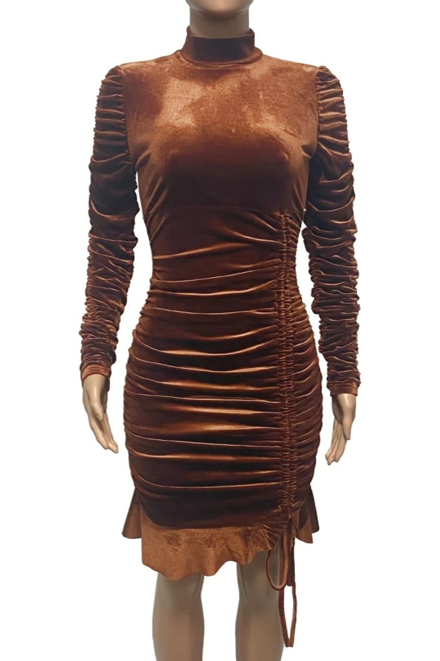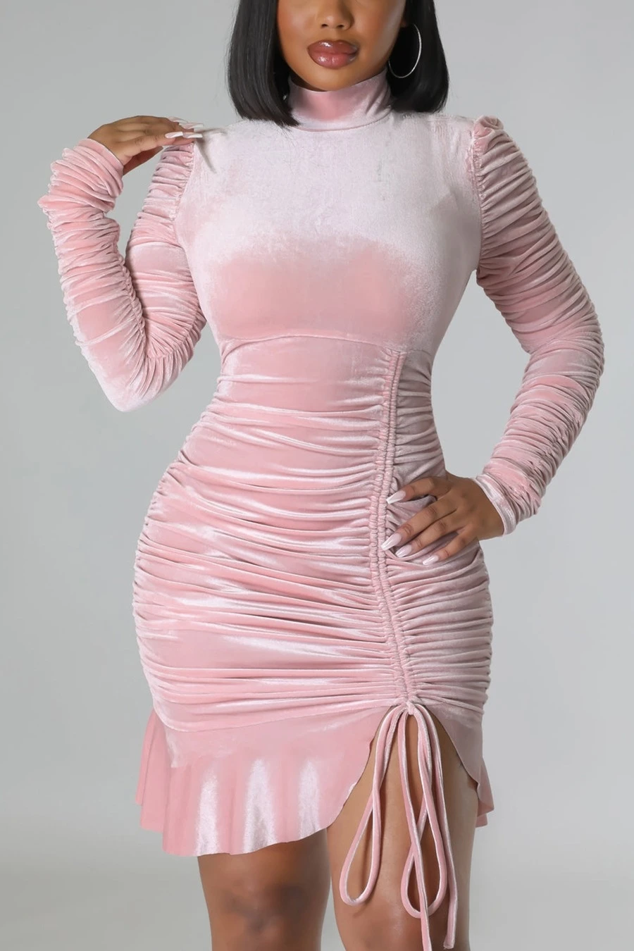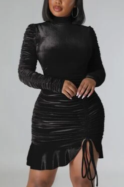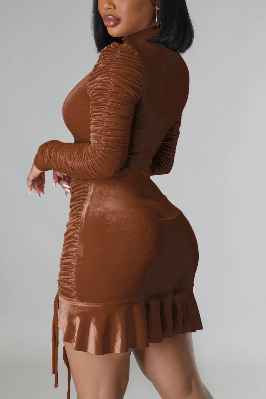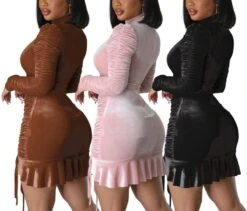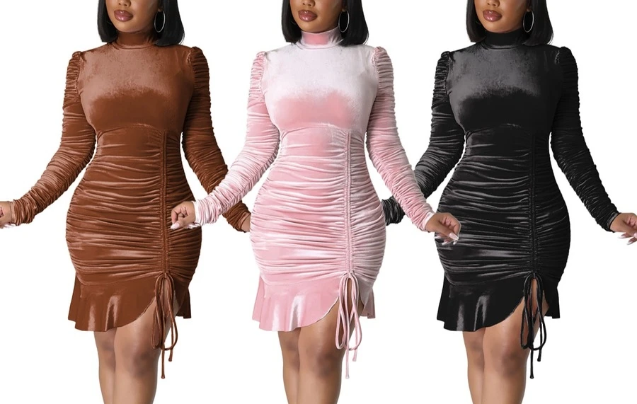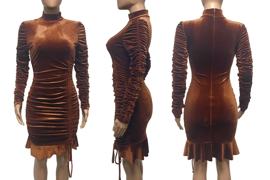 Autumn winter new stylish 3 colors solid color slight stretch velvet drawstring shirring zip-up ruffles plus size slim sexy mini dress