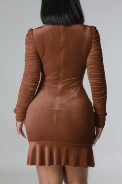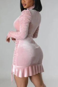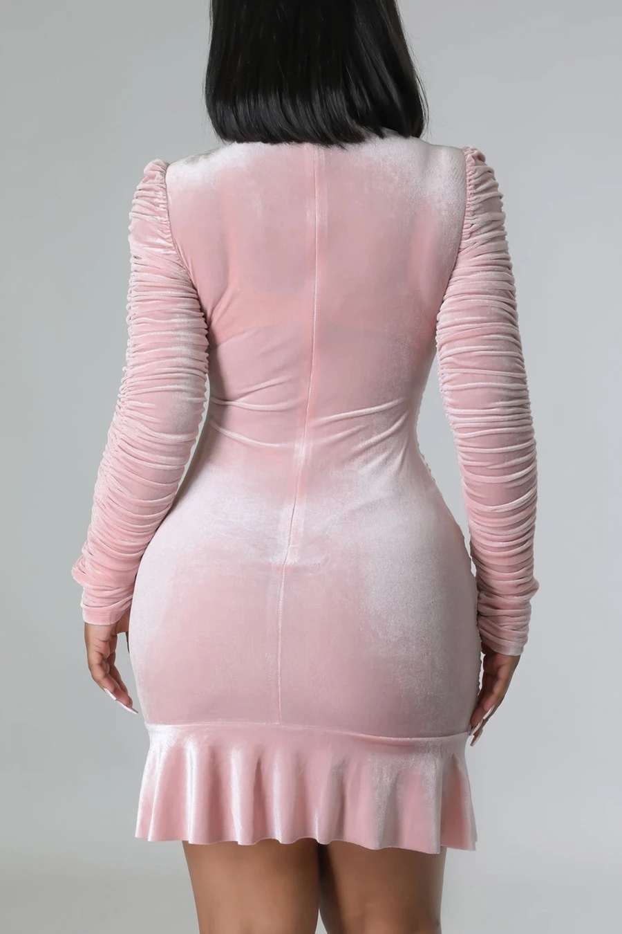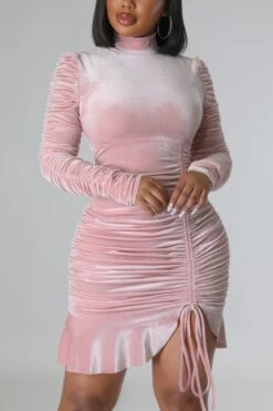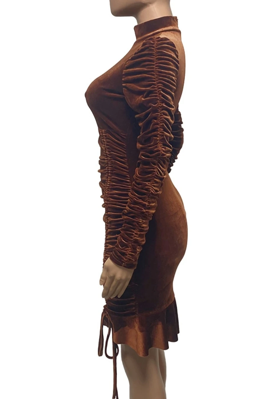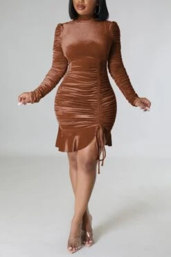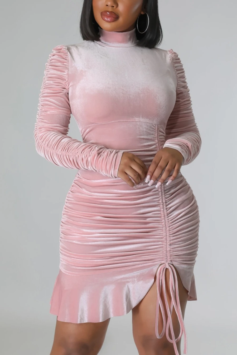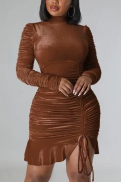 Autumn winter new stylish 3 colors solid color slight stretch velvet drawstring shirring zip-up ruffles plus size slim sexy mini dress