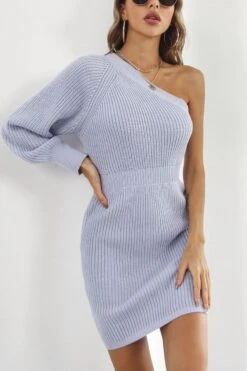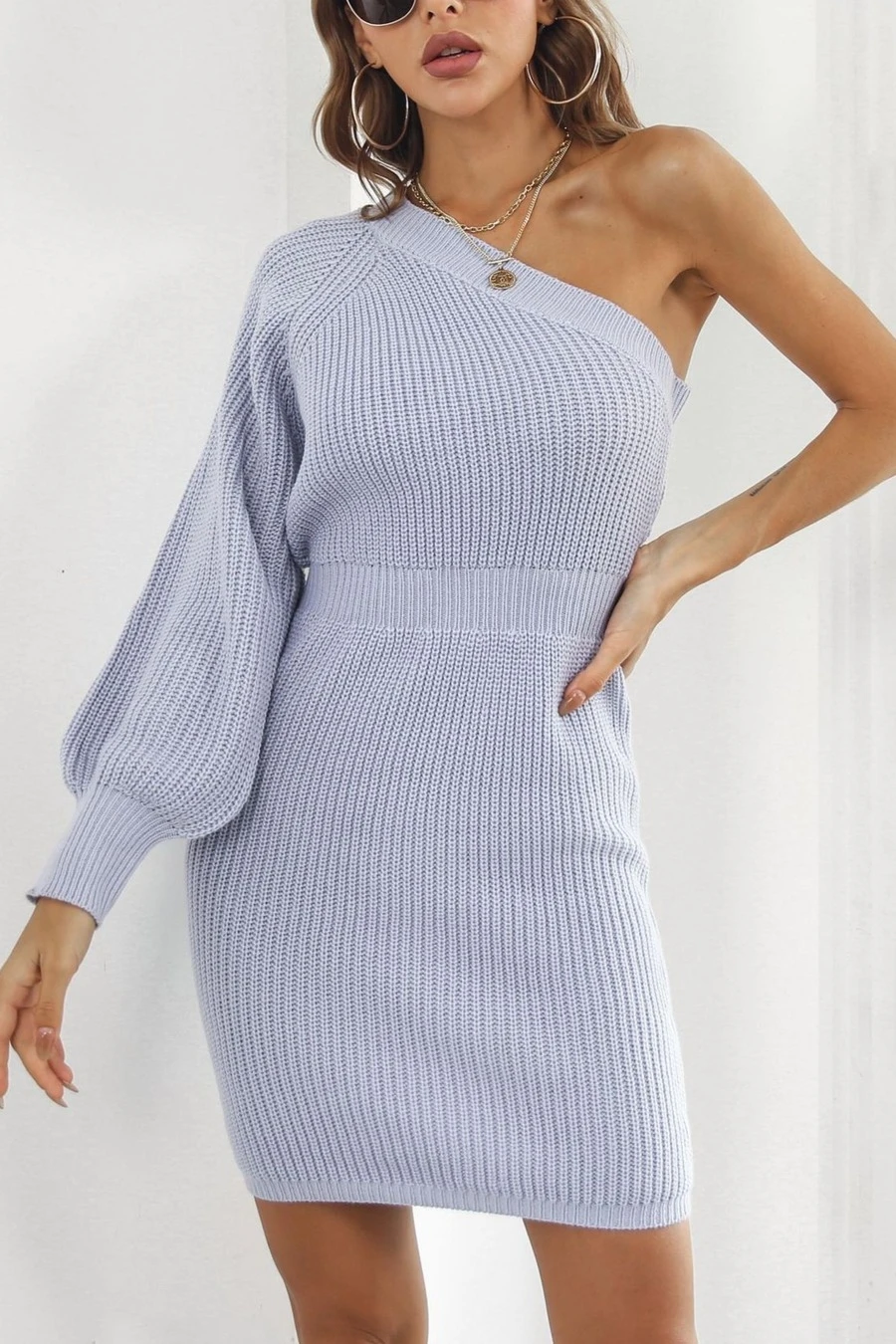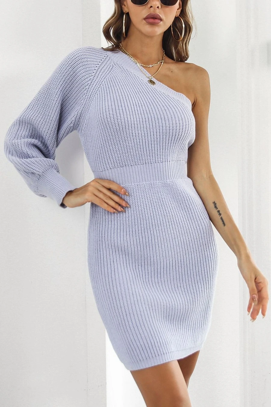 Autumn & winter new two colors pure color slight stretch one shoulder stylish sexy bodycon knitted mini dress