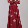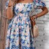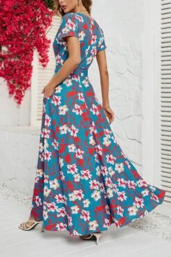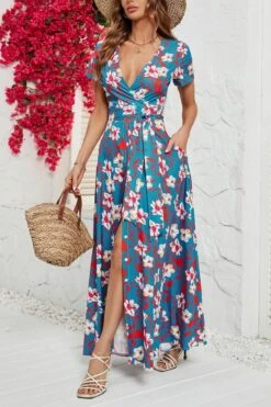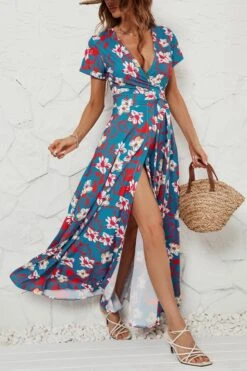 Bohemian non-stretch floral batch print v-neck high split maxi dress with belt