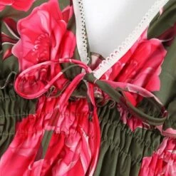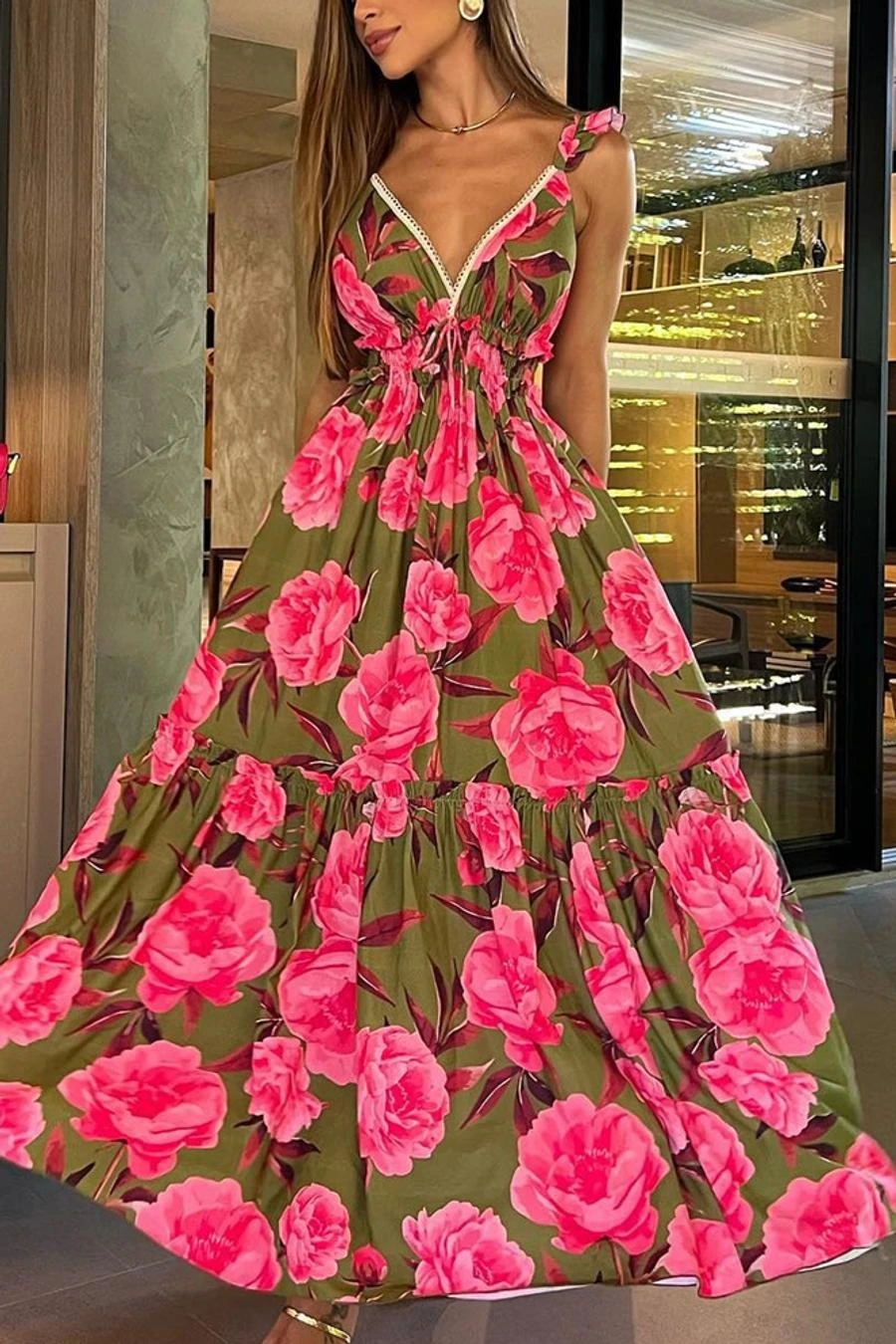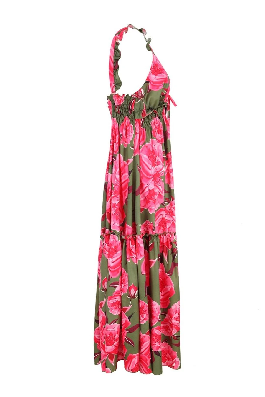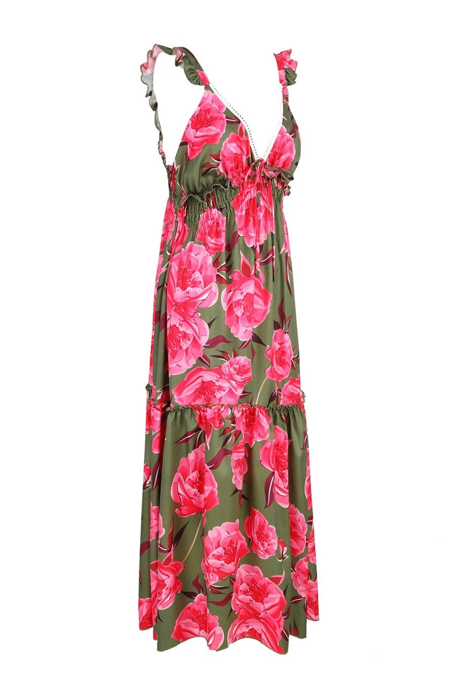 Bohemian slight stretch floral printing deep v ruffle backless maxi dress