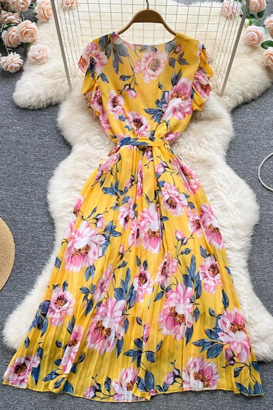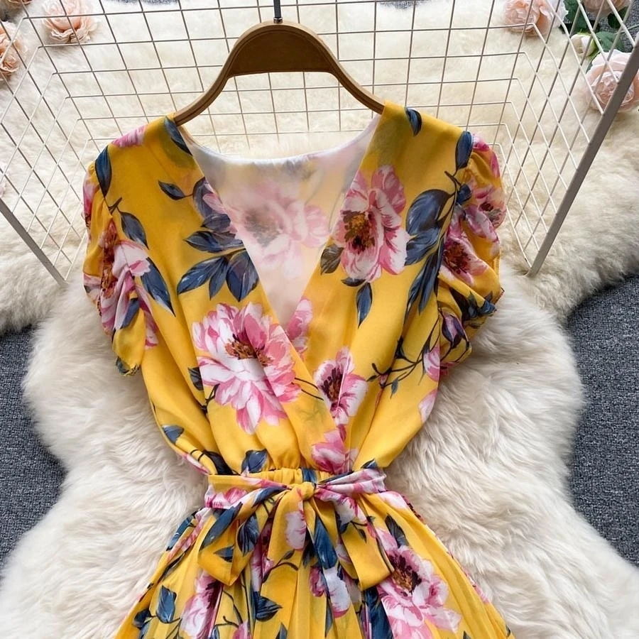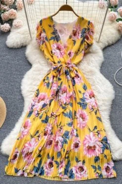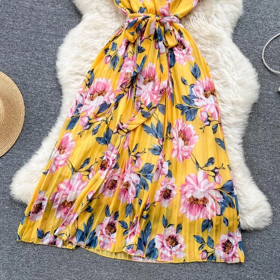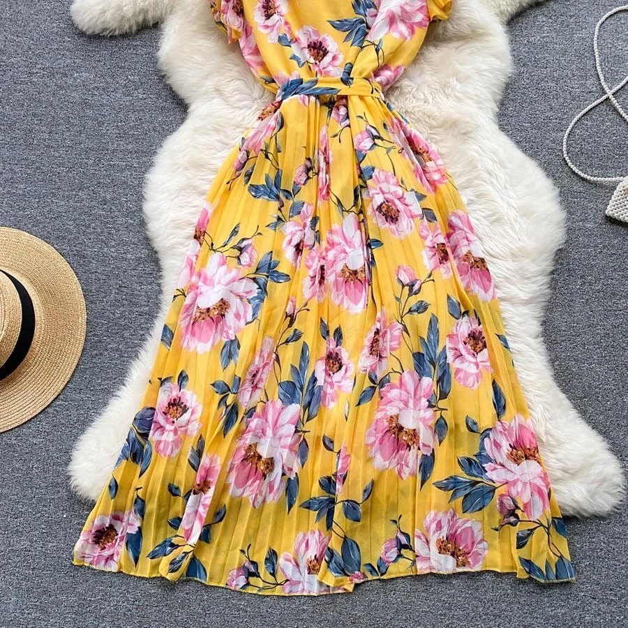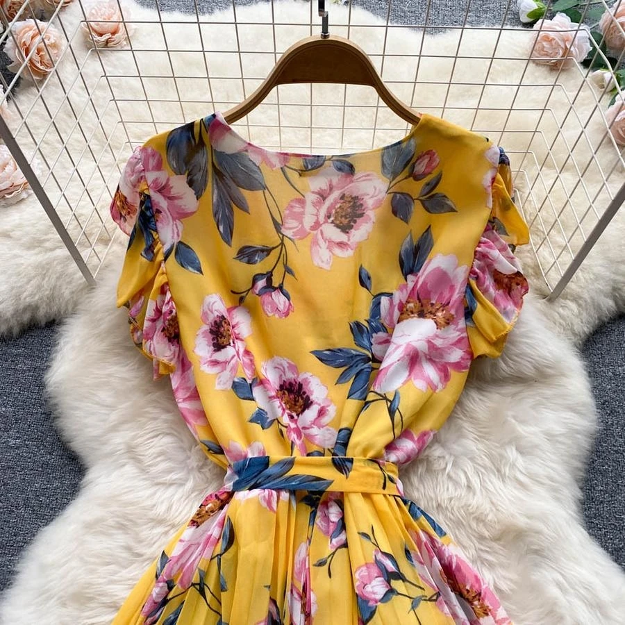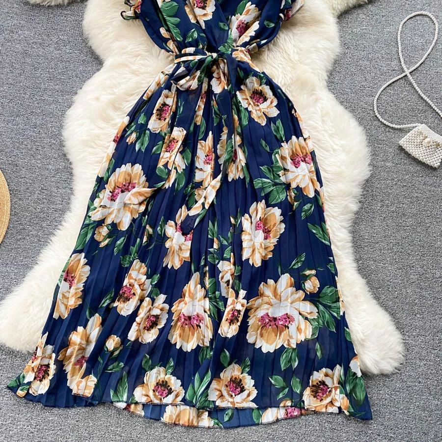 Casual non-stretch flower batch printing v-neck with belt pleated midi dress#2