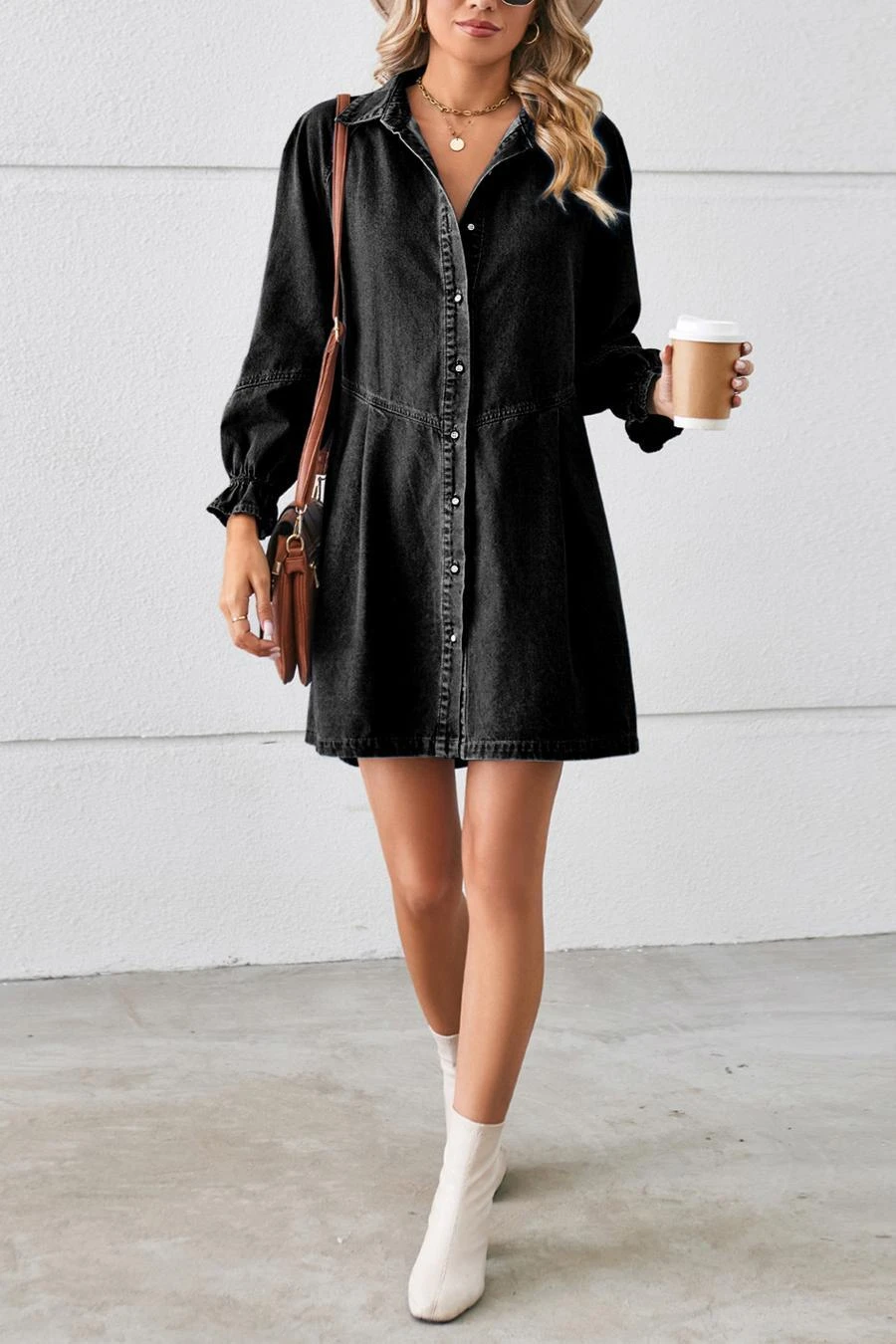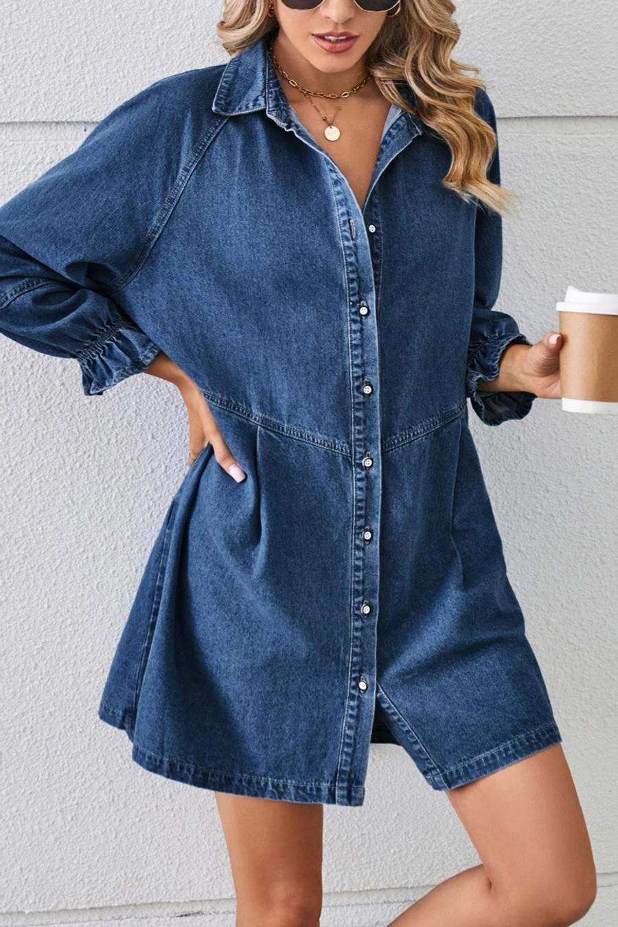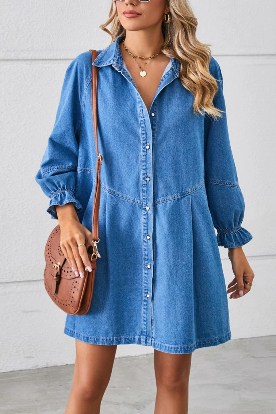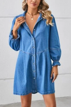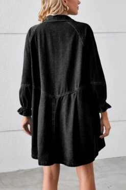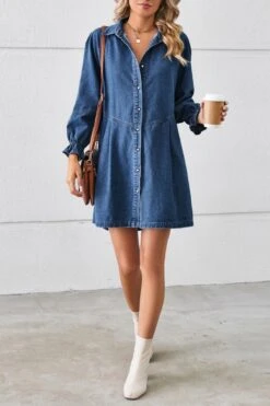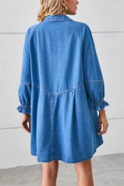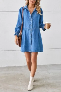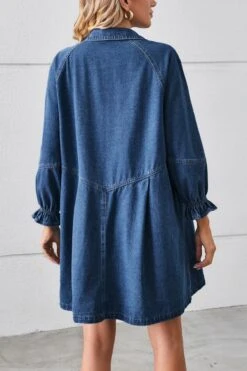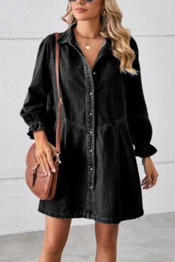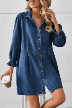 Casual non-stretch solid color loose single breasted mini denim dress
