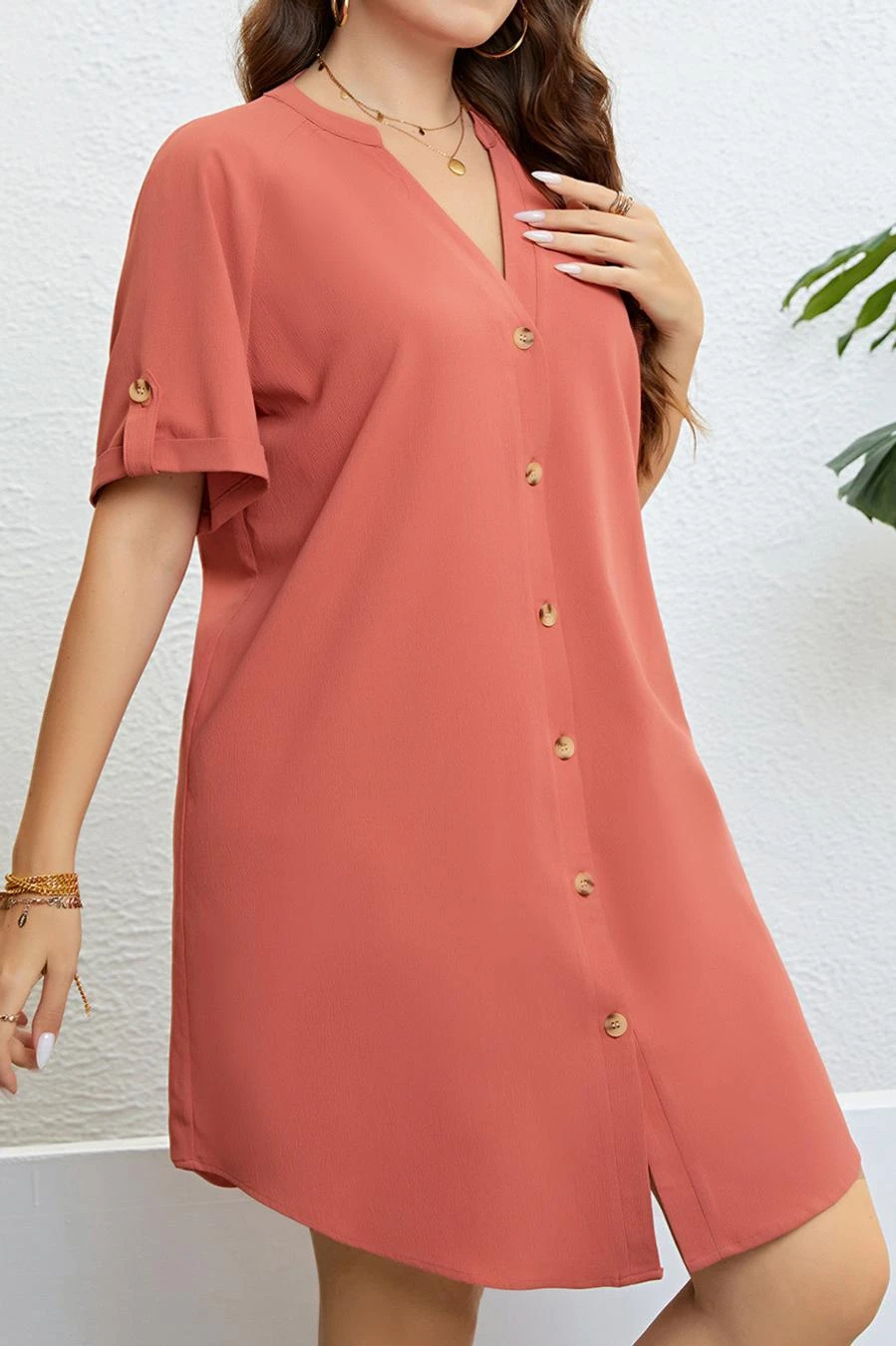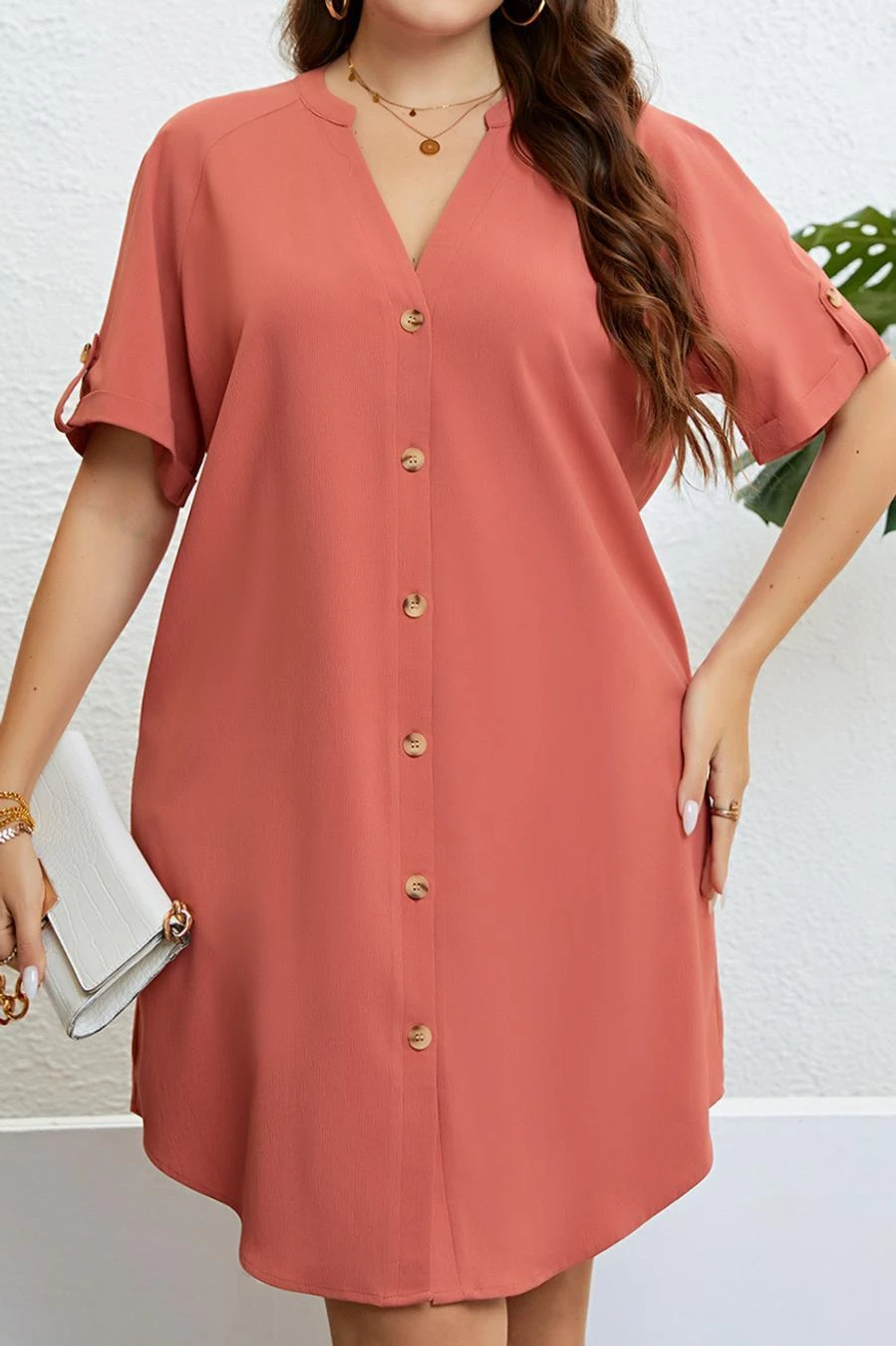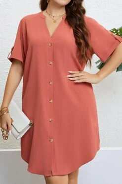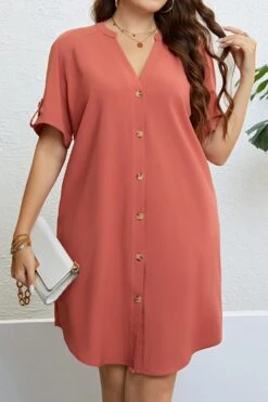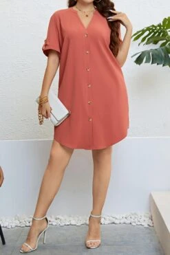 Casual plus size non-stretch solid color single breasted loose midi dress