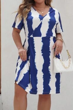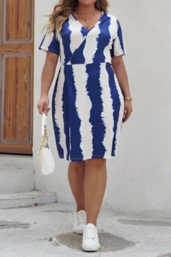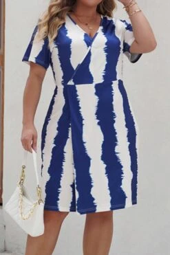 Casual plus size non-stretch striped printed v-neck short-sleeved midi dress