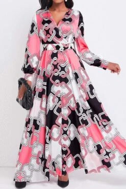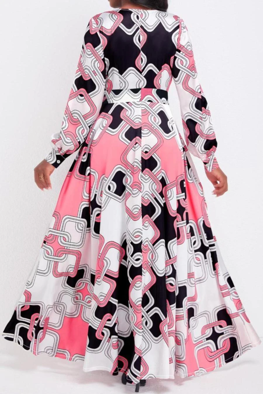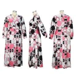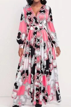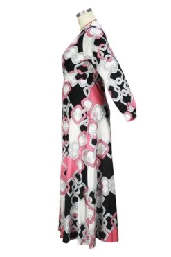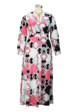 Casual plus size slight stretch batch printing v-neck zipper maxi dress