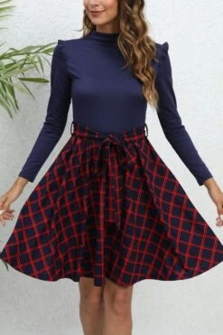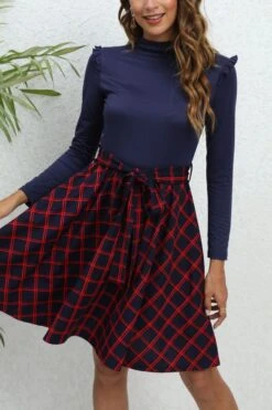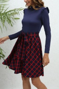 Casual plus size slight stretch lattice printing ruffle midi dress with belt