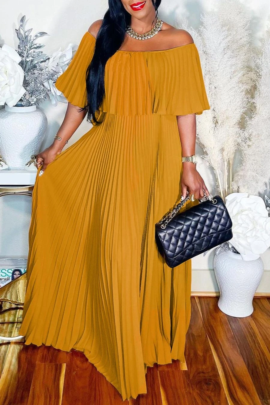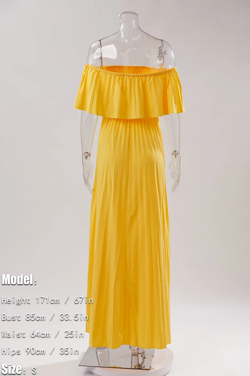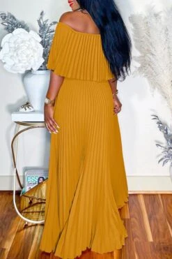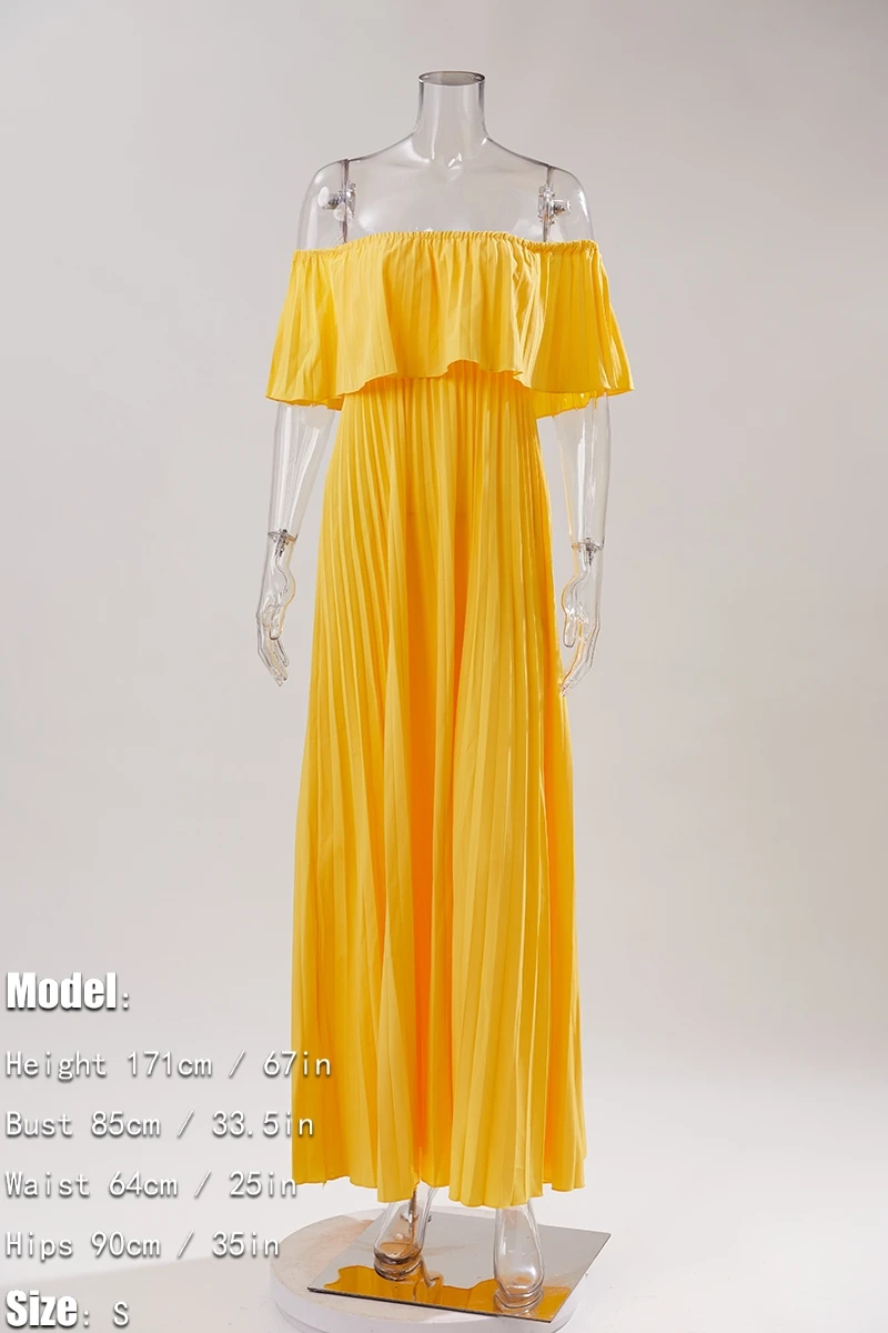 Casual plus size slight stretch solid color pleated off-shoulder maxi dress