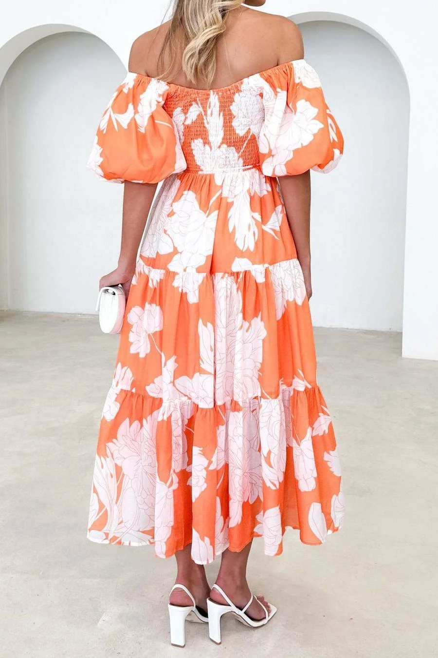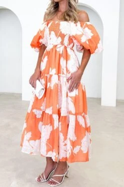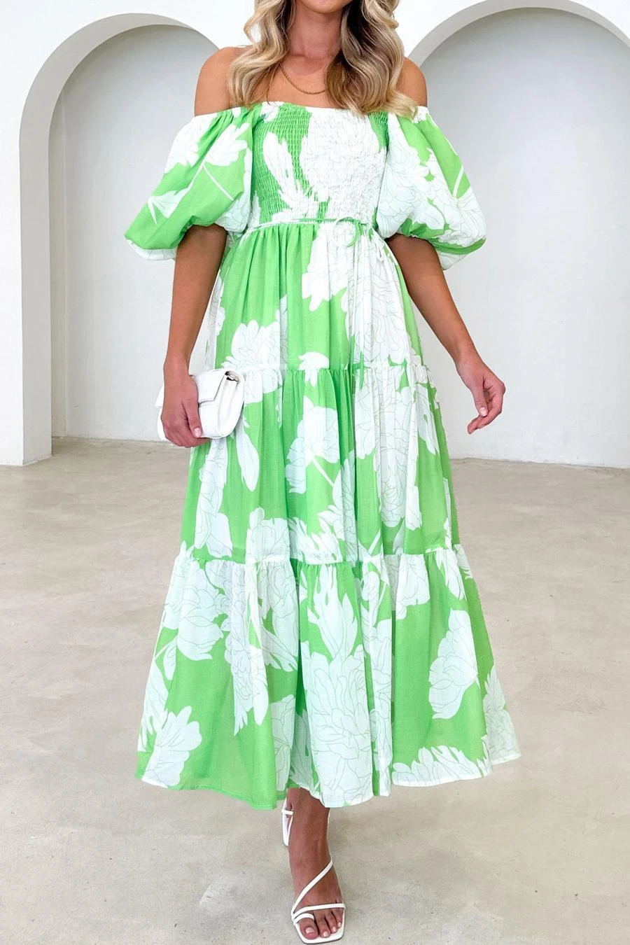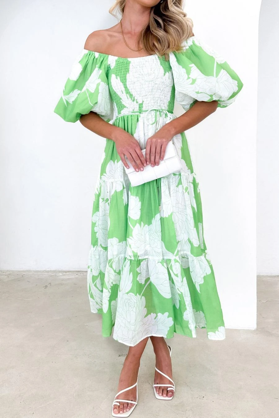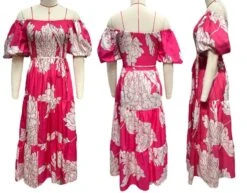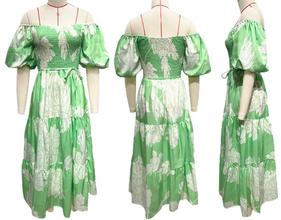 Casual slight stretch 3 colors flower batch printing off shoulder midi dress