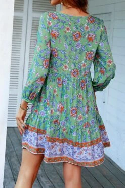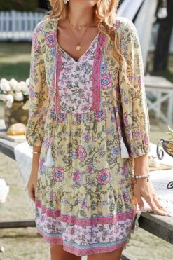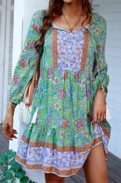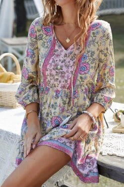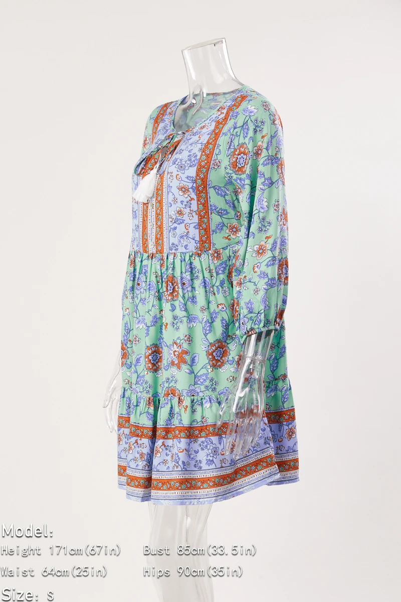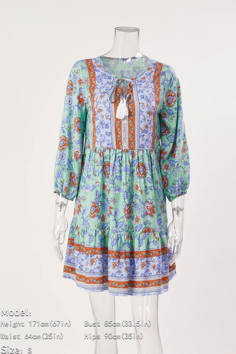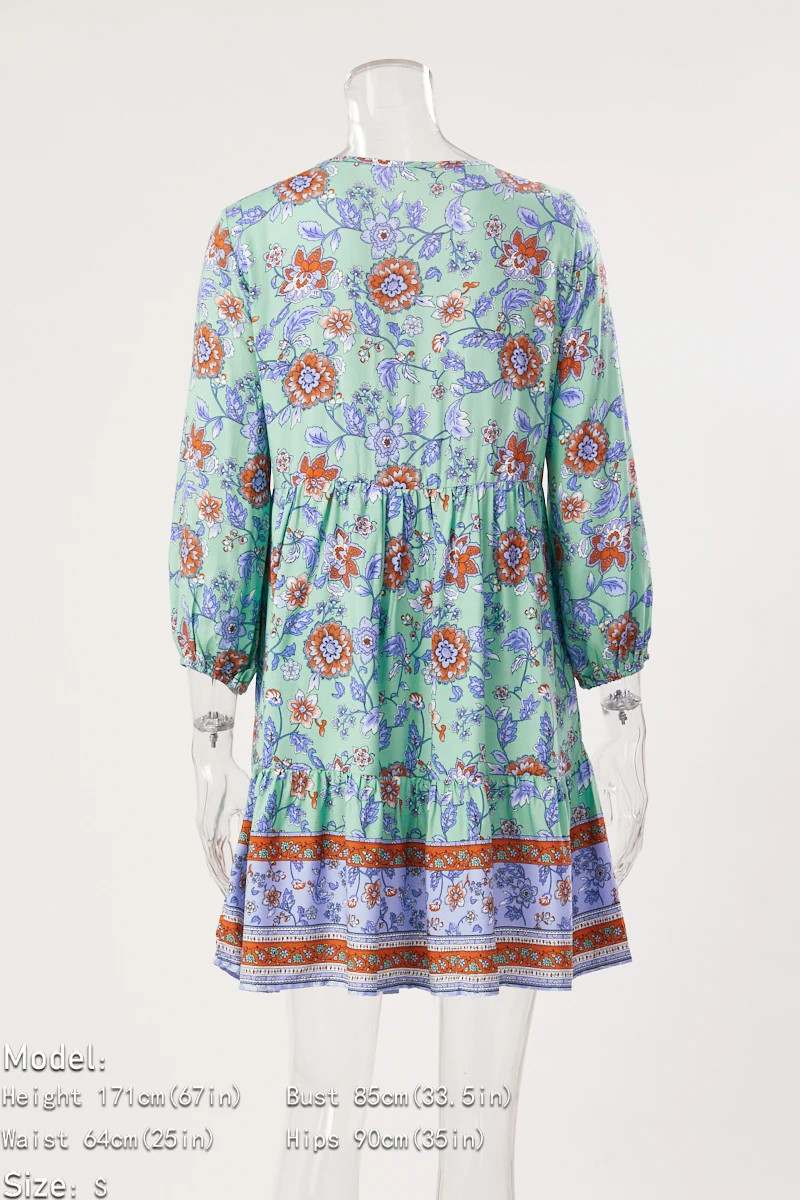Casual slight stretch bohemia flower batch printing v-neck mini dress