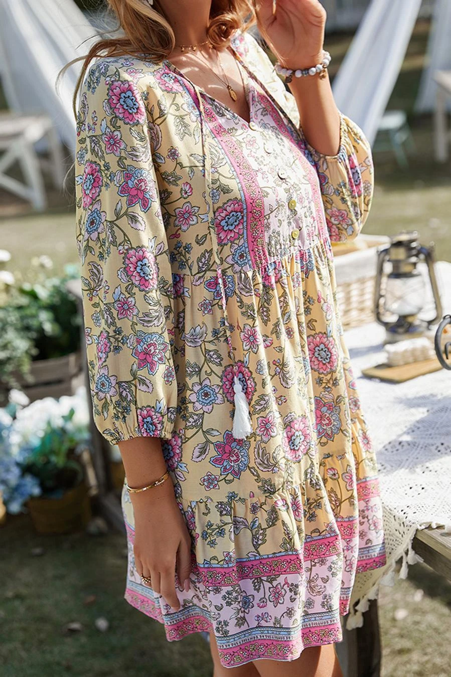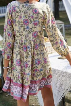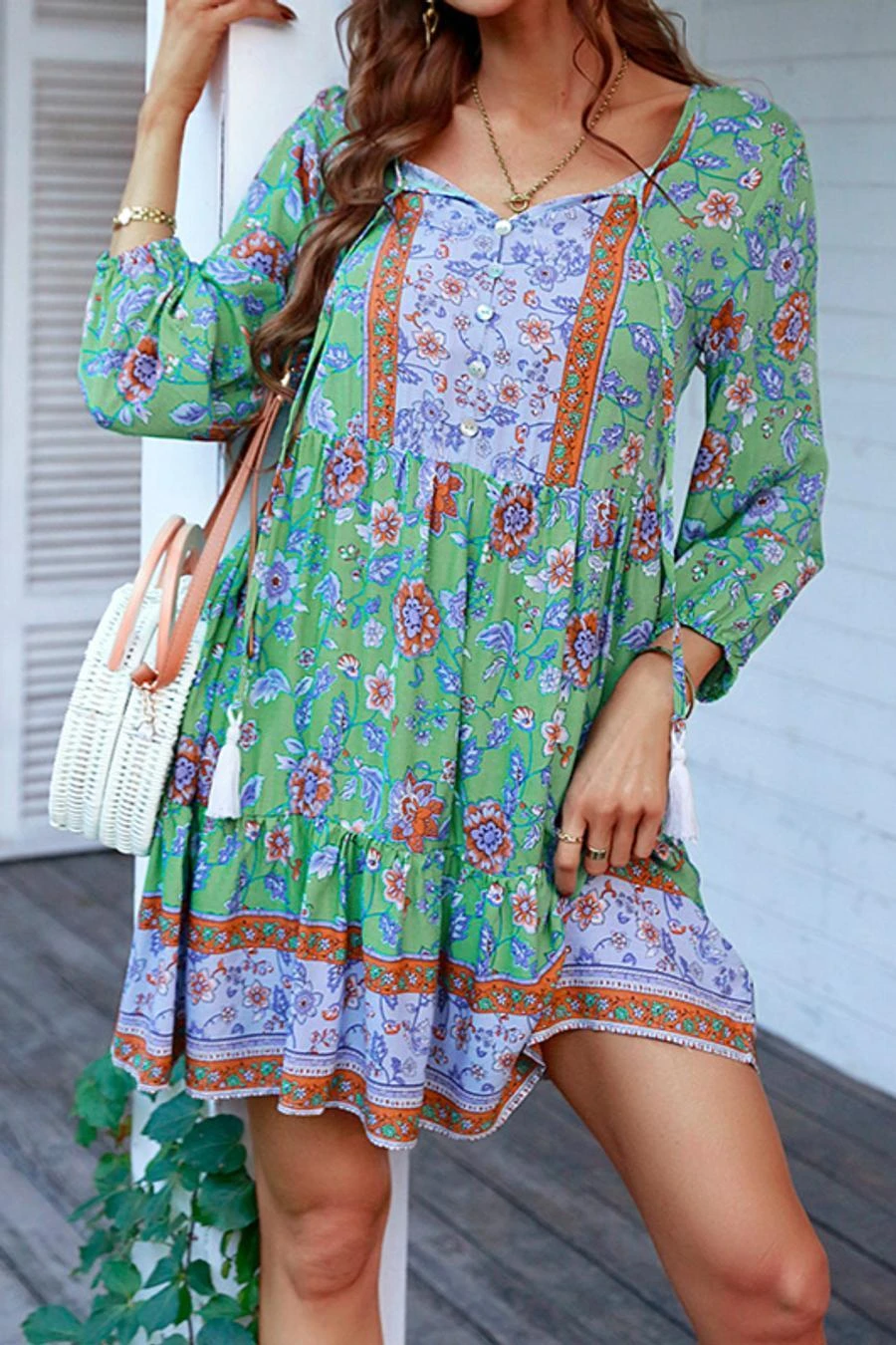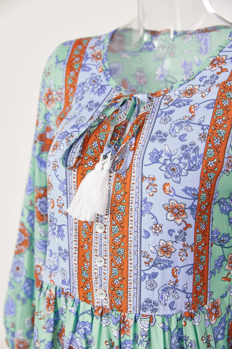 Casual slight stretch bohemia flower batch printing v-neck mini dress