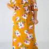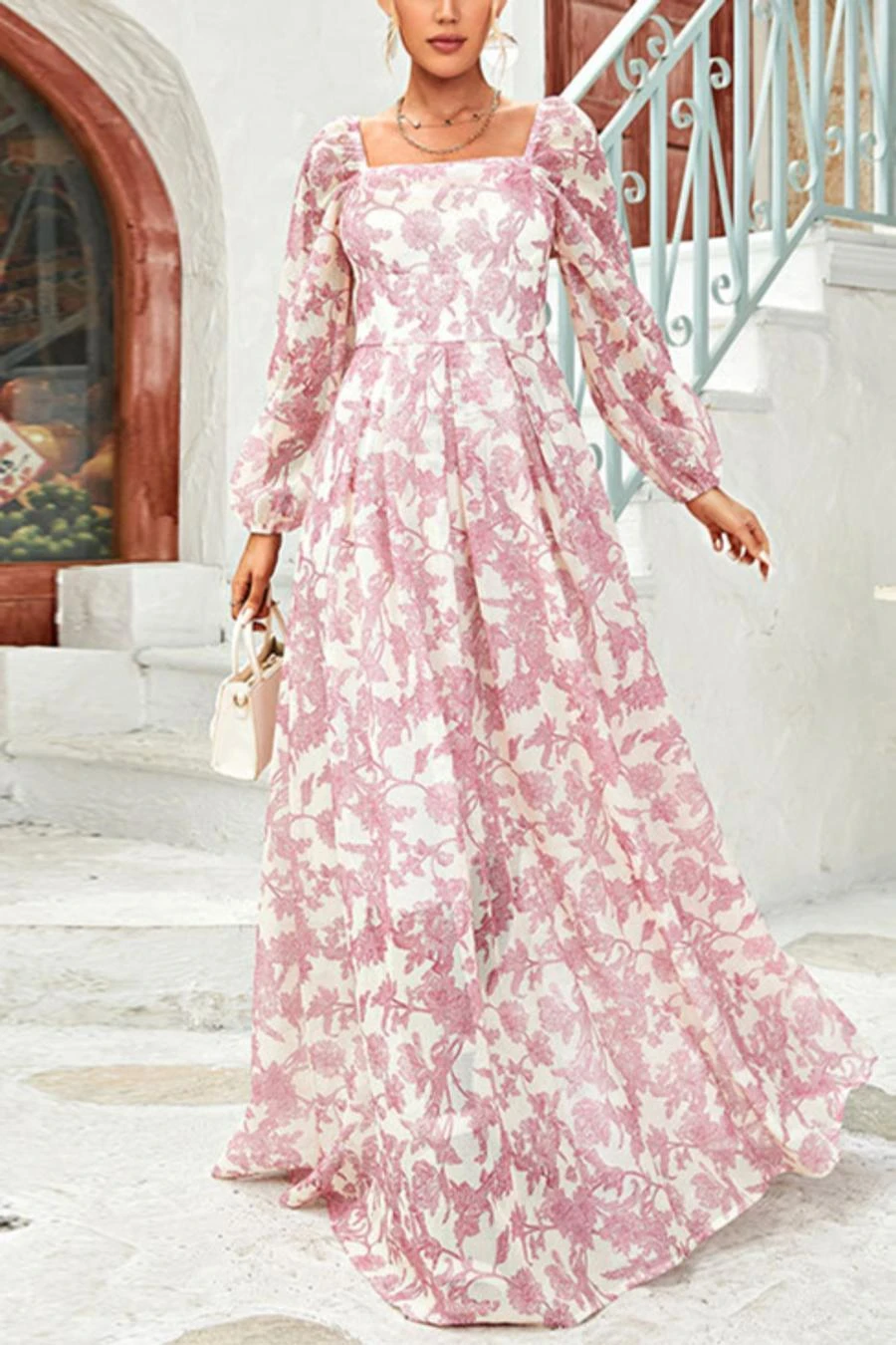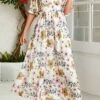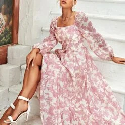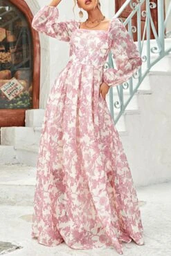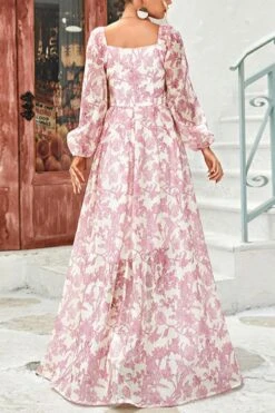 Casual slight stretch floral printing square neck with lined maxi dress