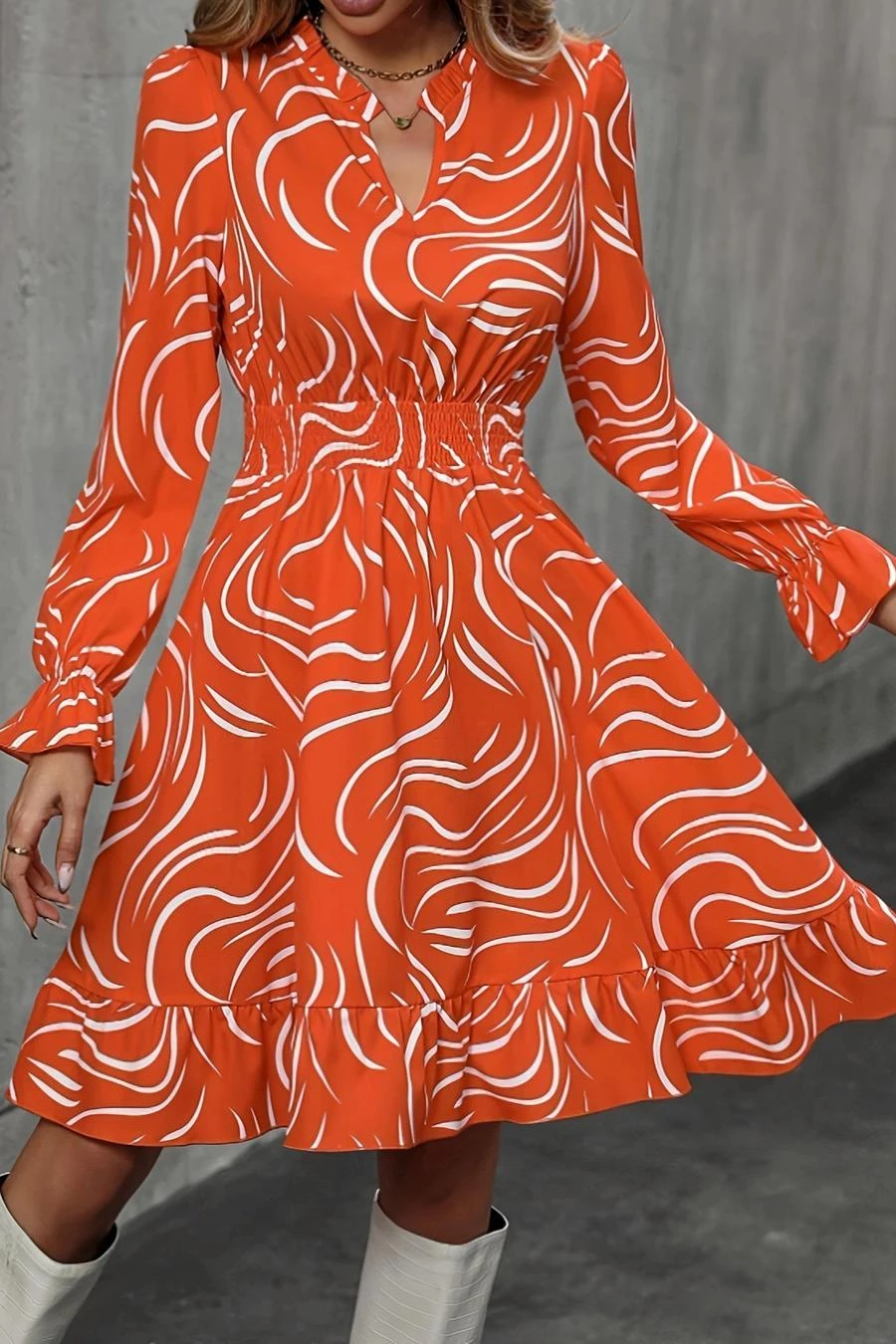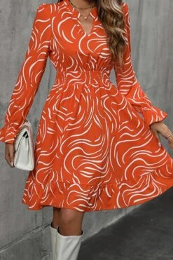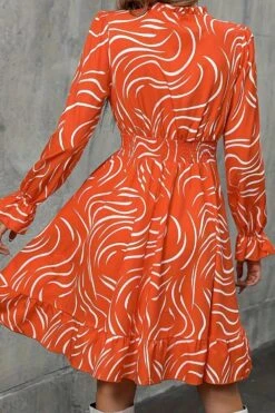 Casual slight stretch orange batch printing v-neck mini dress