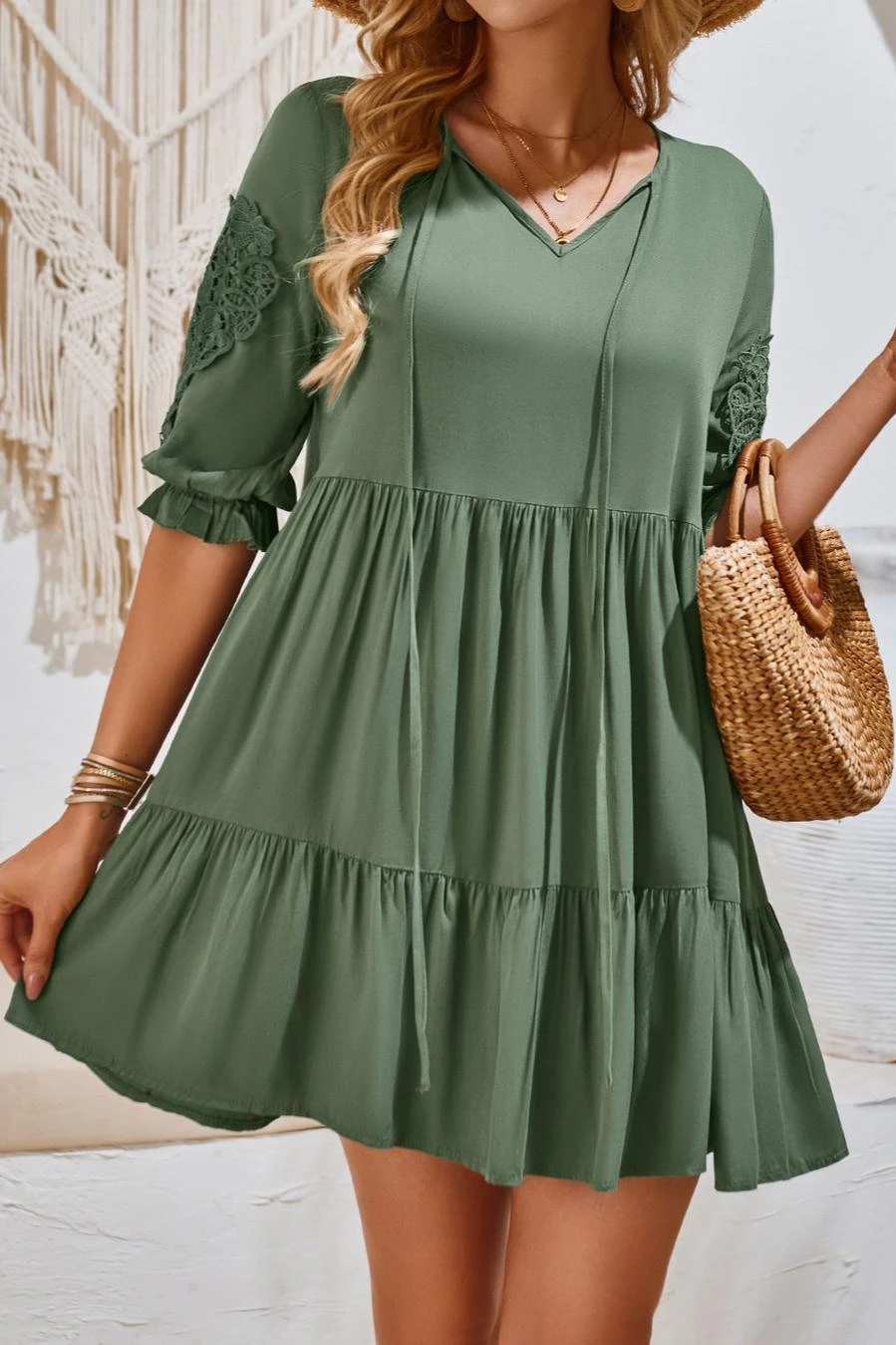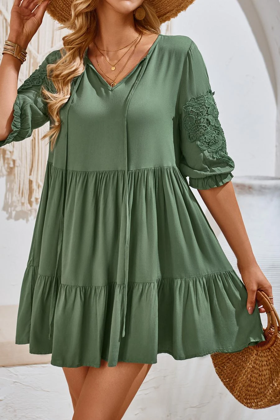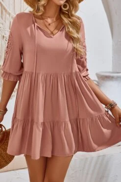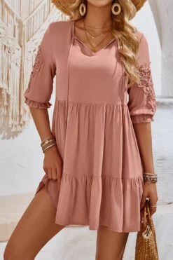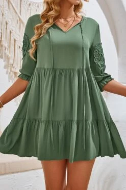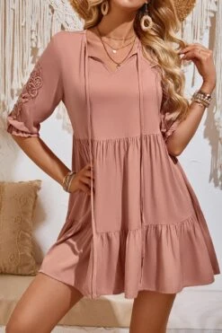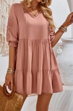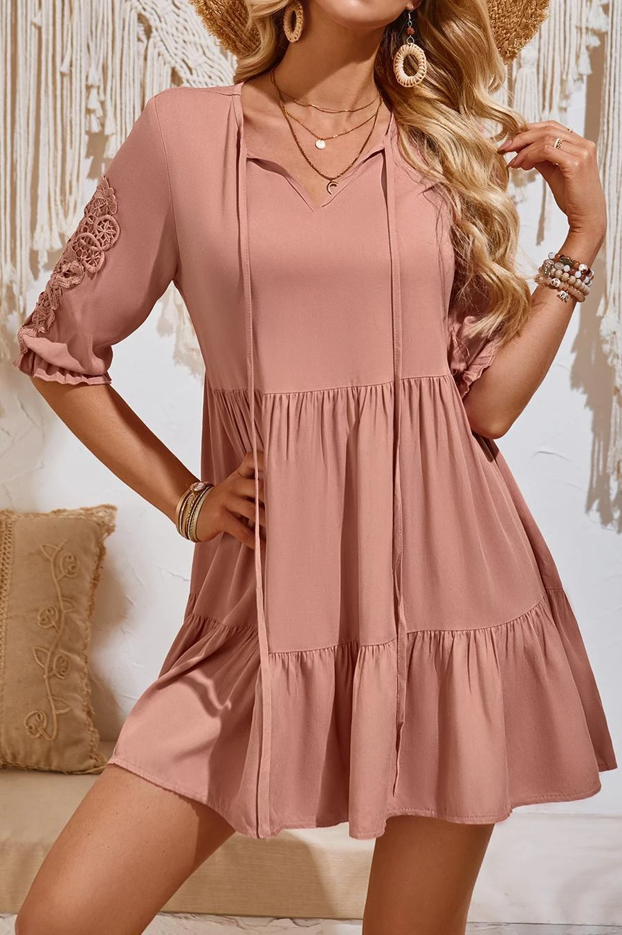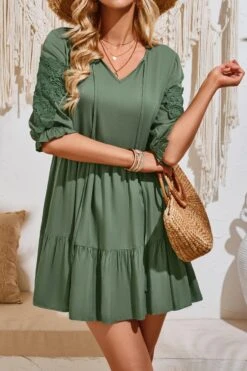 Casual slight stretch solid color embroidery pattern pinch pleated mini dress