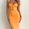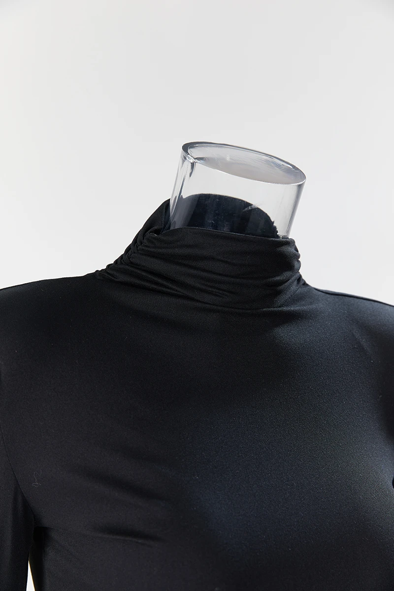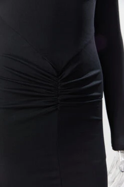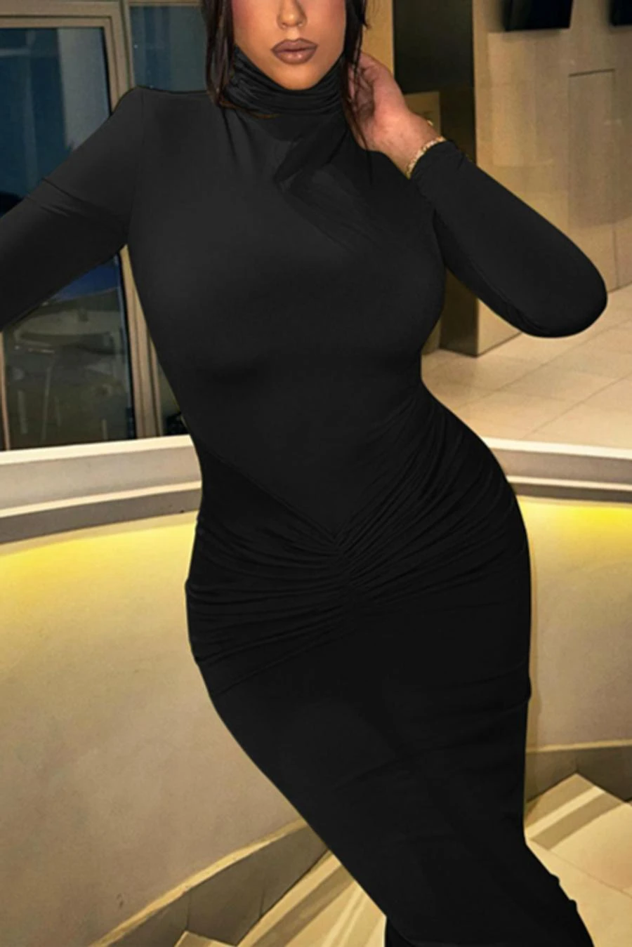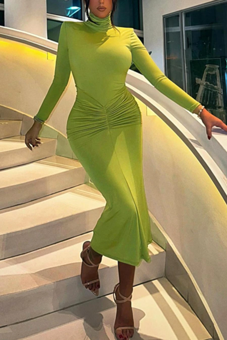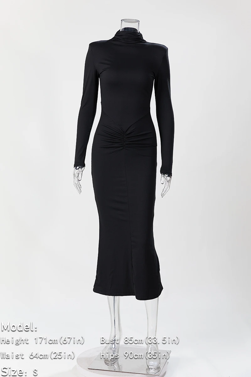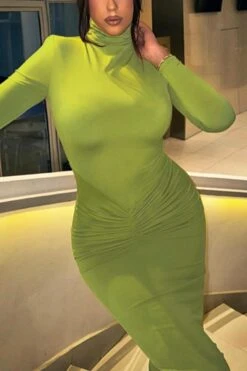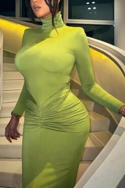 Casual slight stretch solid color shirring with shoulder pads midi dress
