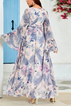 Casual slight stretch v-neck flower & leaf printing slit maxi dress