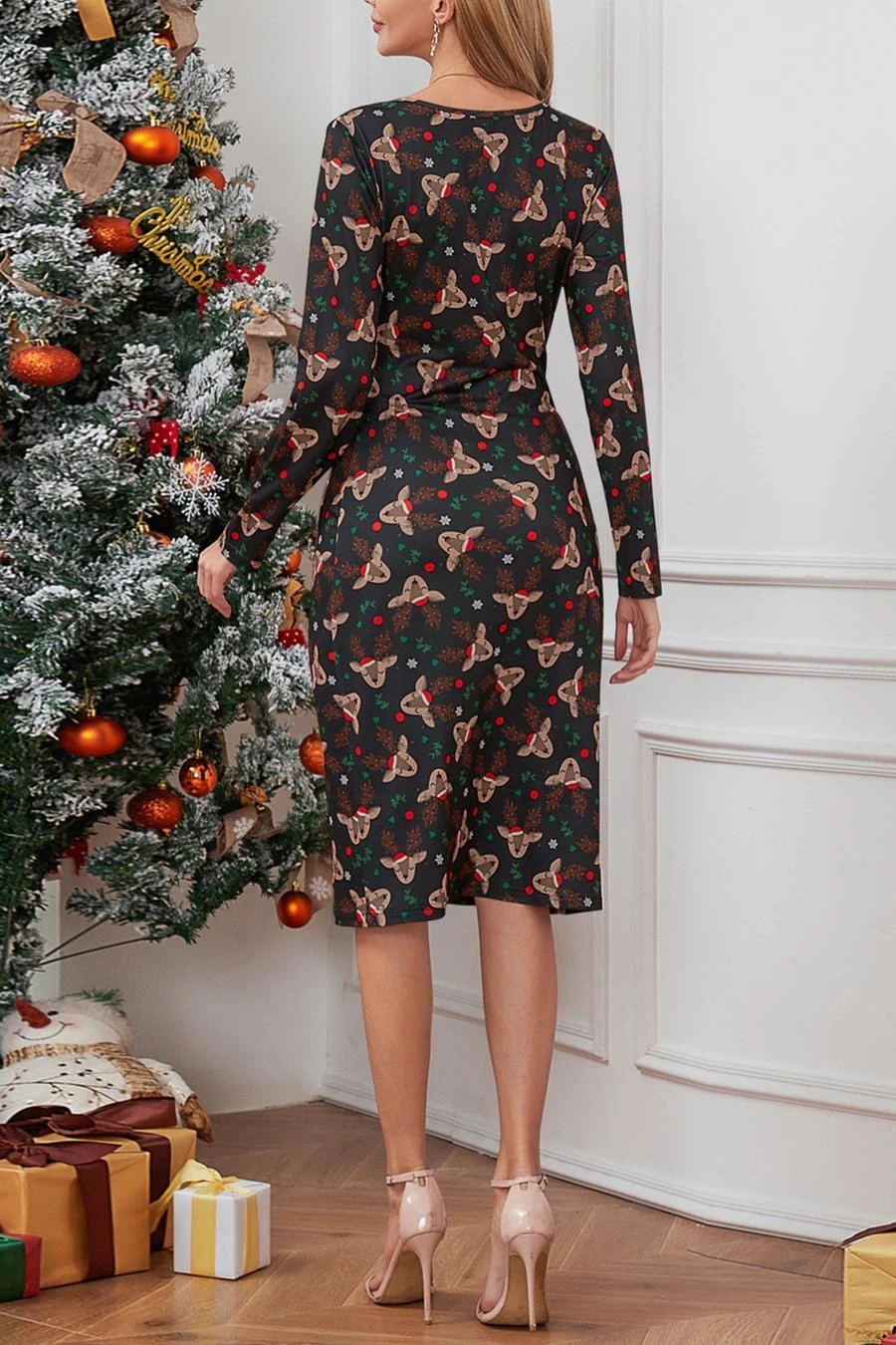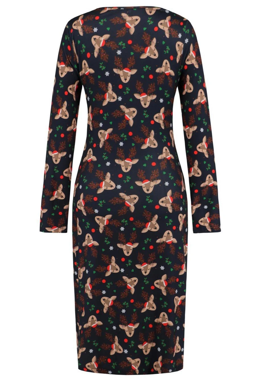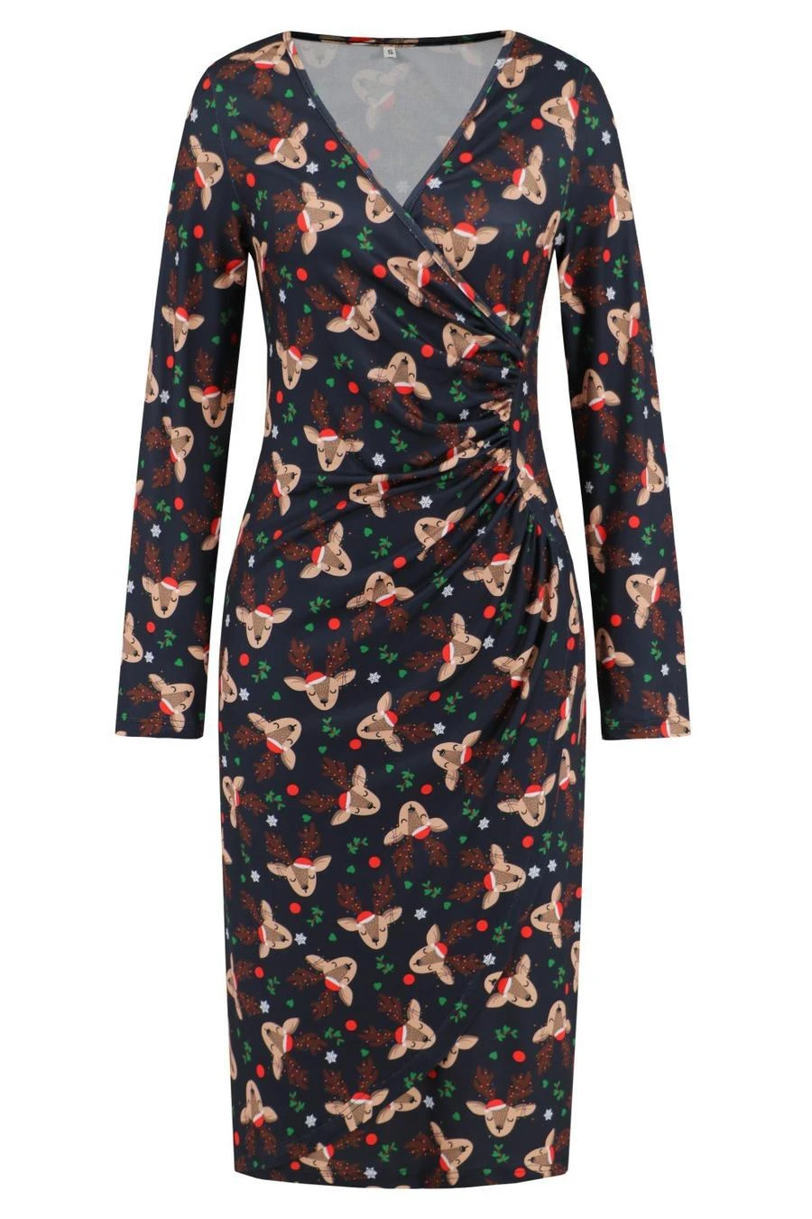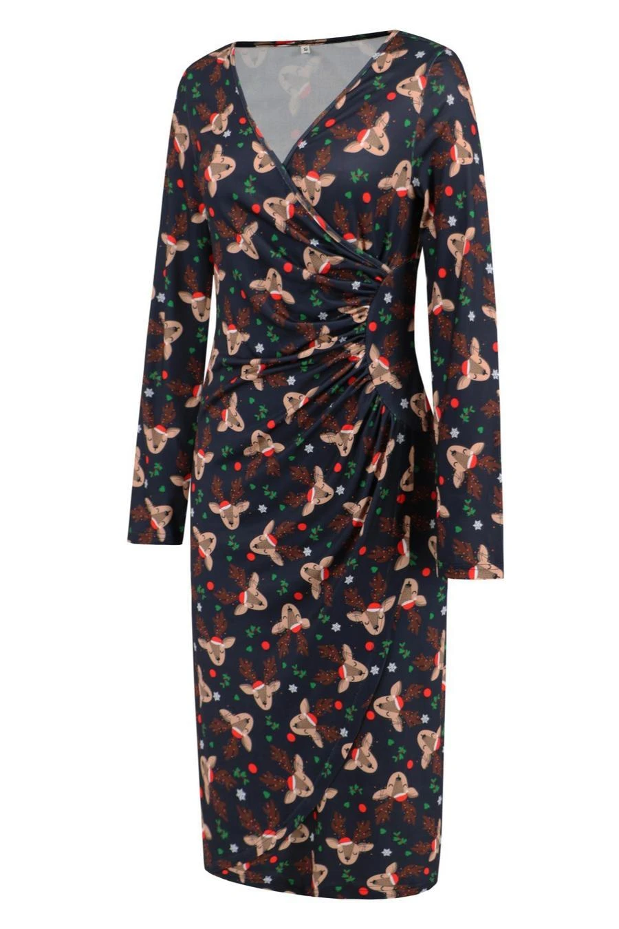 Christmas stylish plus size slight stretch deer batch print v-neck midi dress