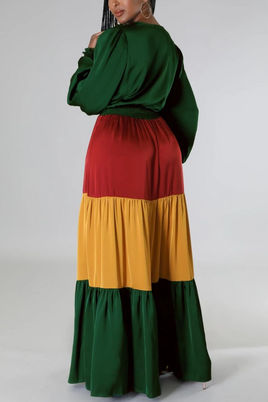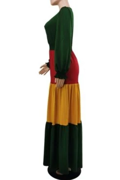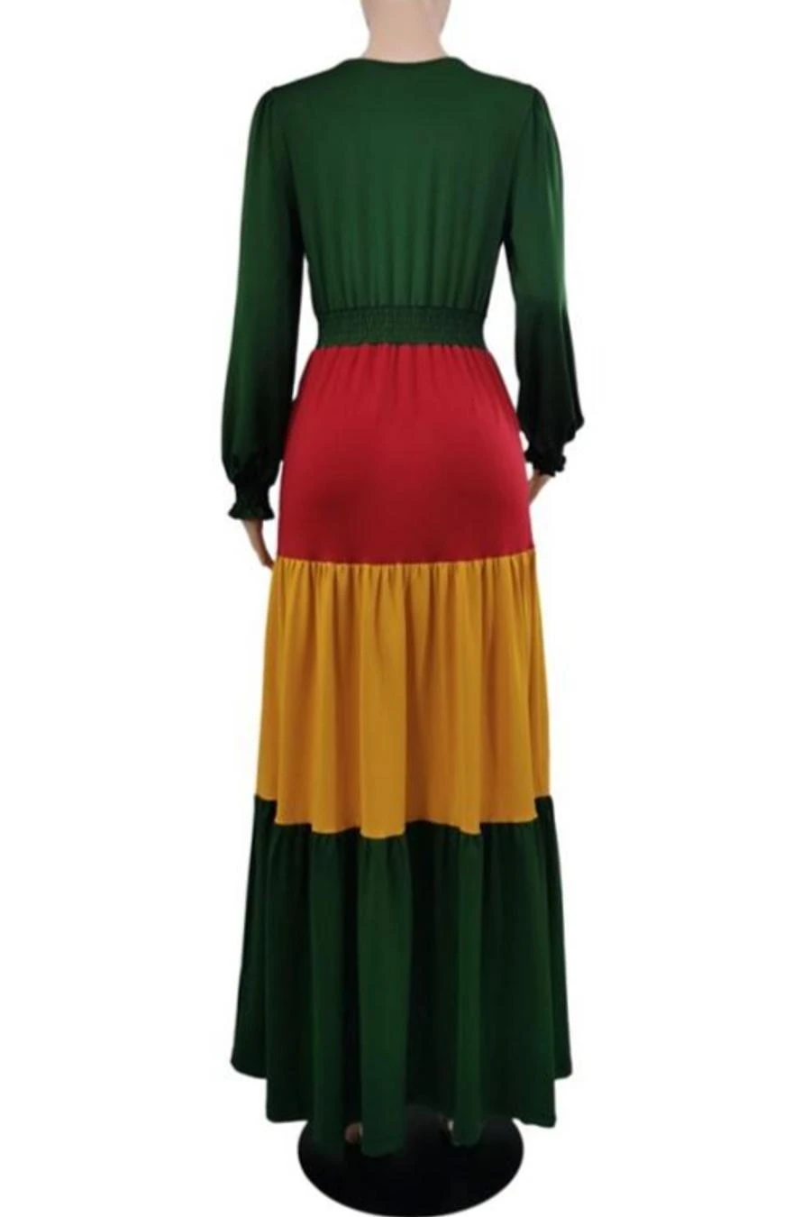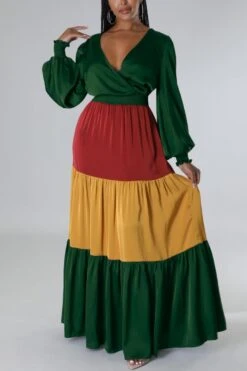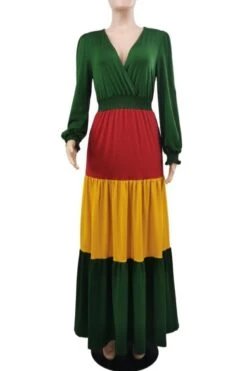 Contrast stitching stretch v-neck long sleeve stylish casual maxi dress
