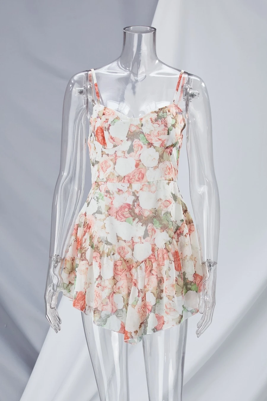 Custom xs-l summer new floral printing inelastic backless adjustable straps ruffle hem panties lining spliced sexy mini dress