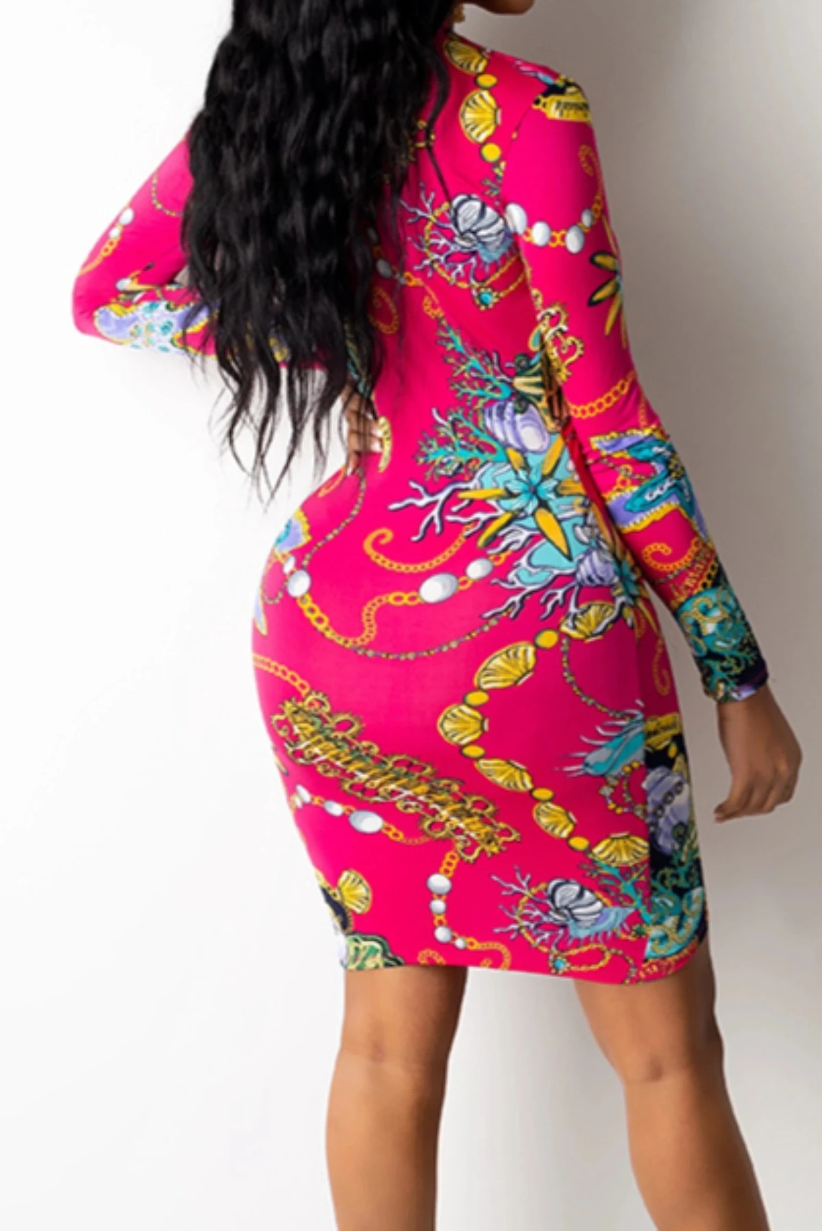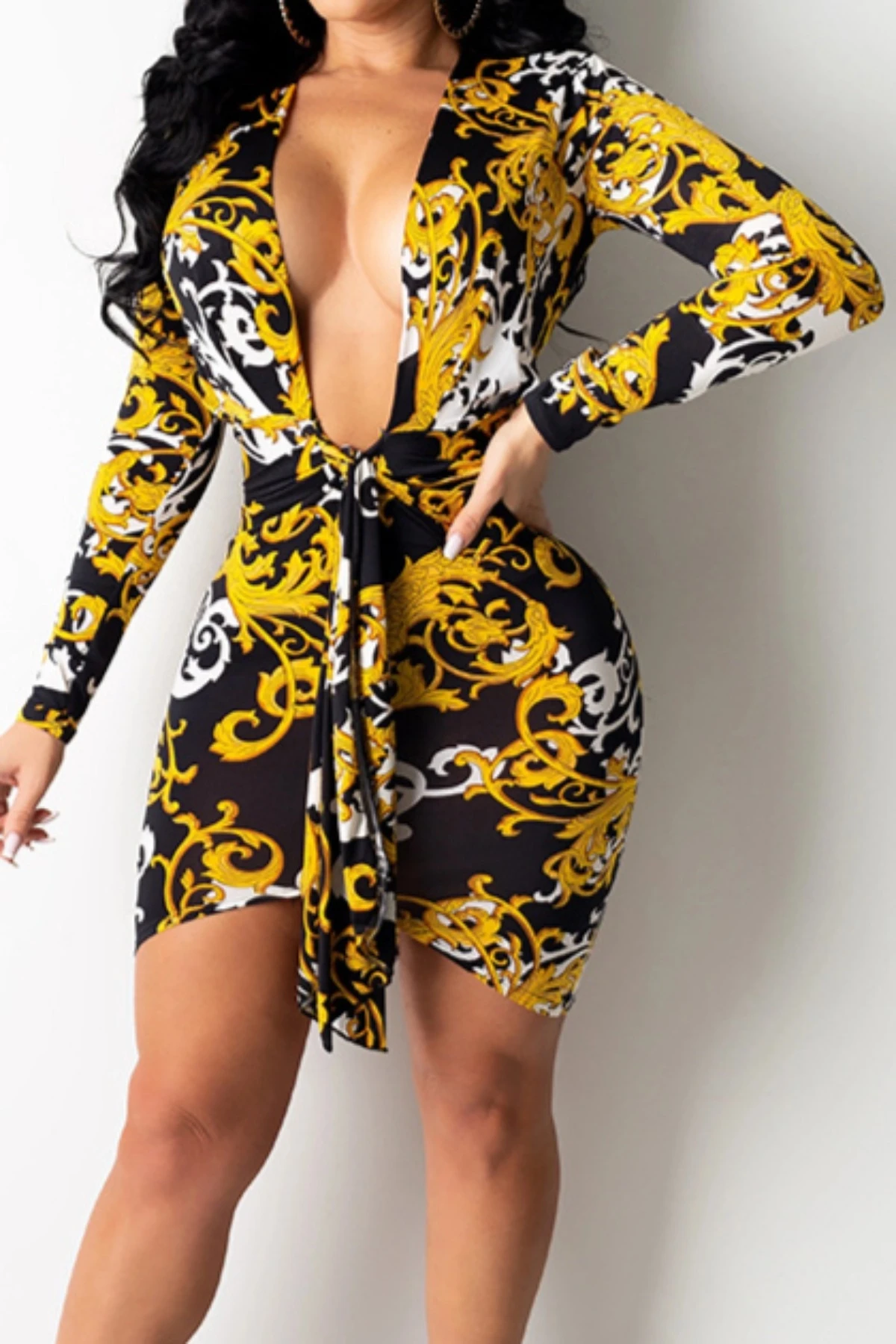 Digital batch printing plus size autumn deep v-neck stretch tight slim mini dress