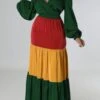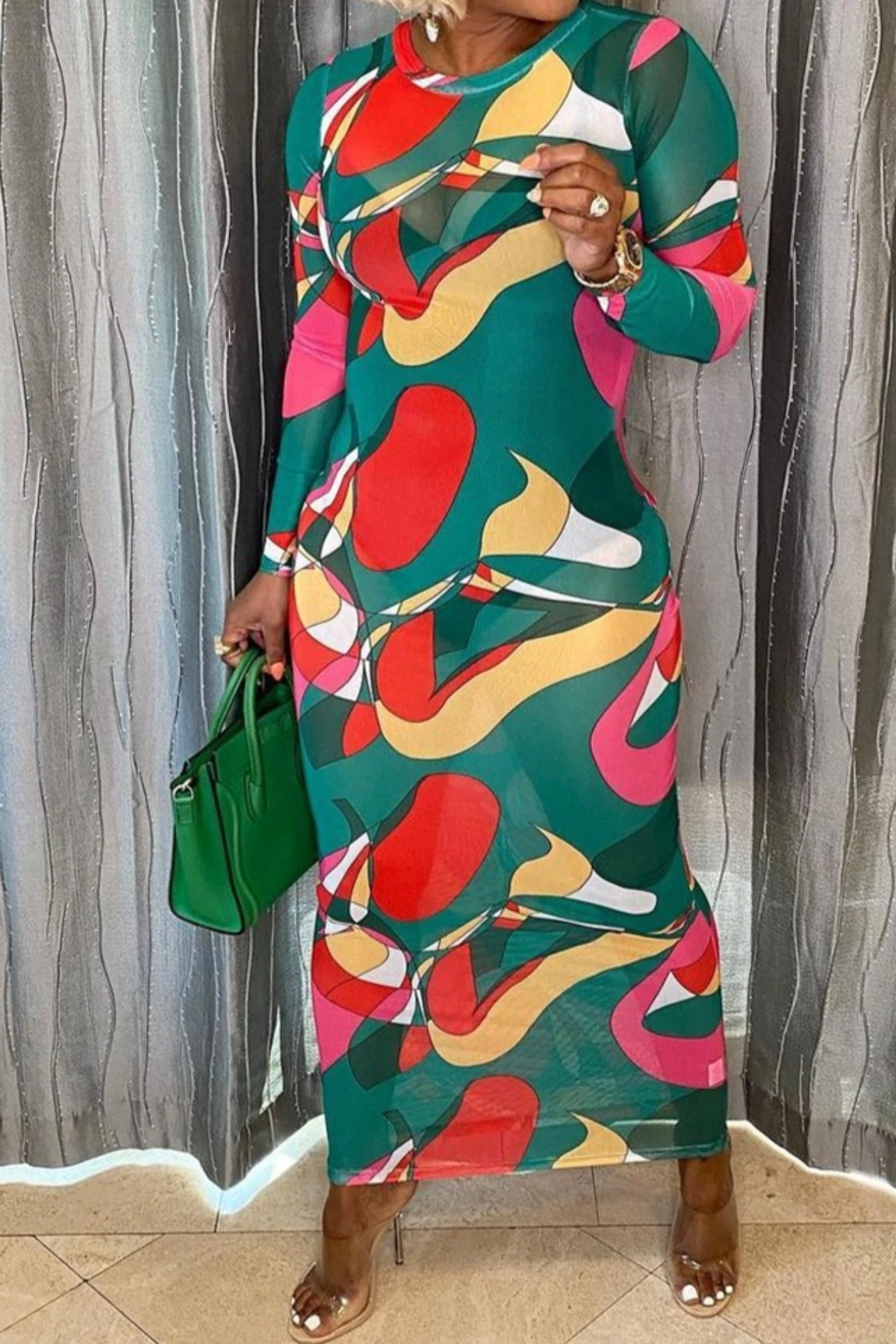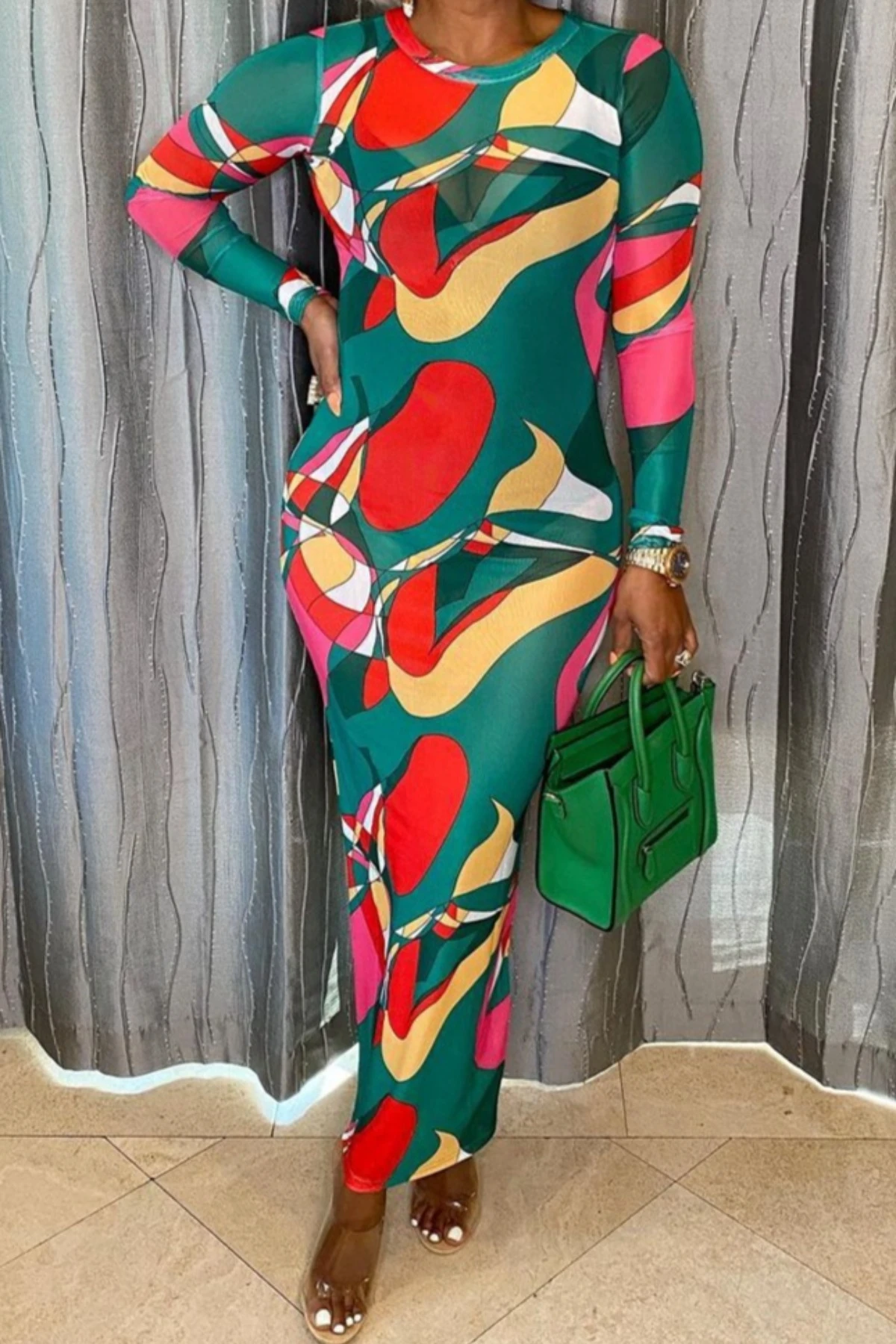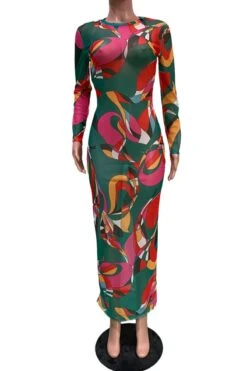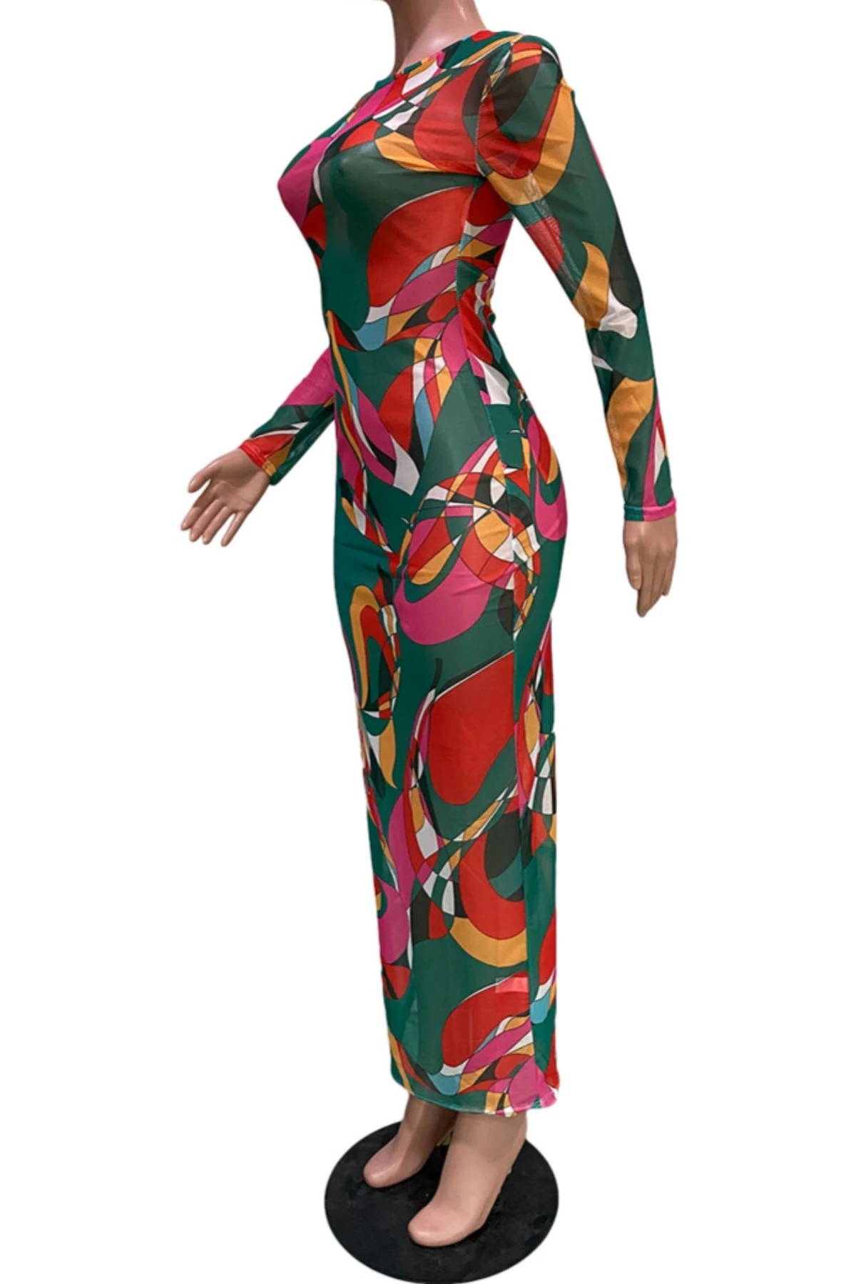 Early autumn new multicolor batch printing micro see through mesh fabric stretch sexy maxi dress