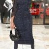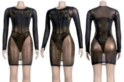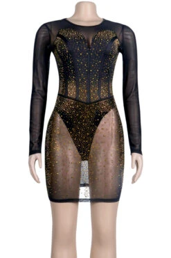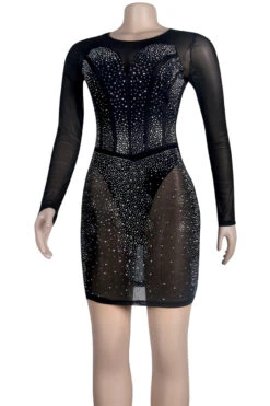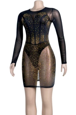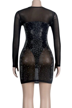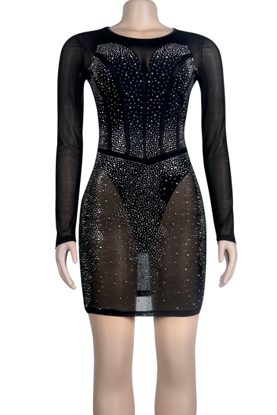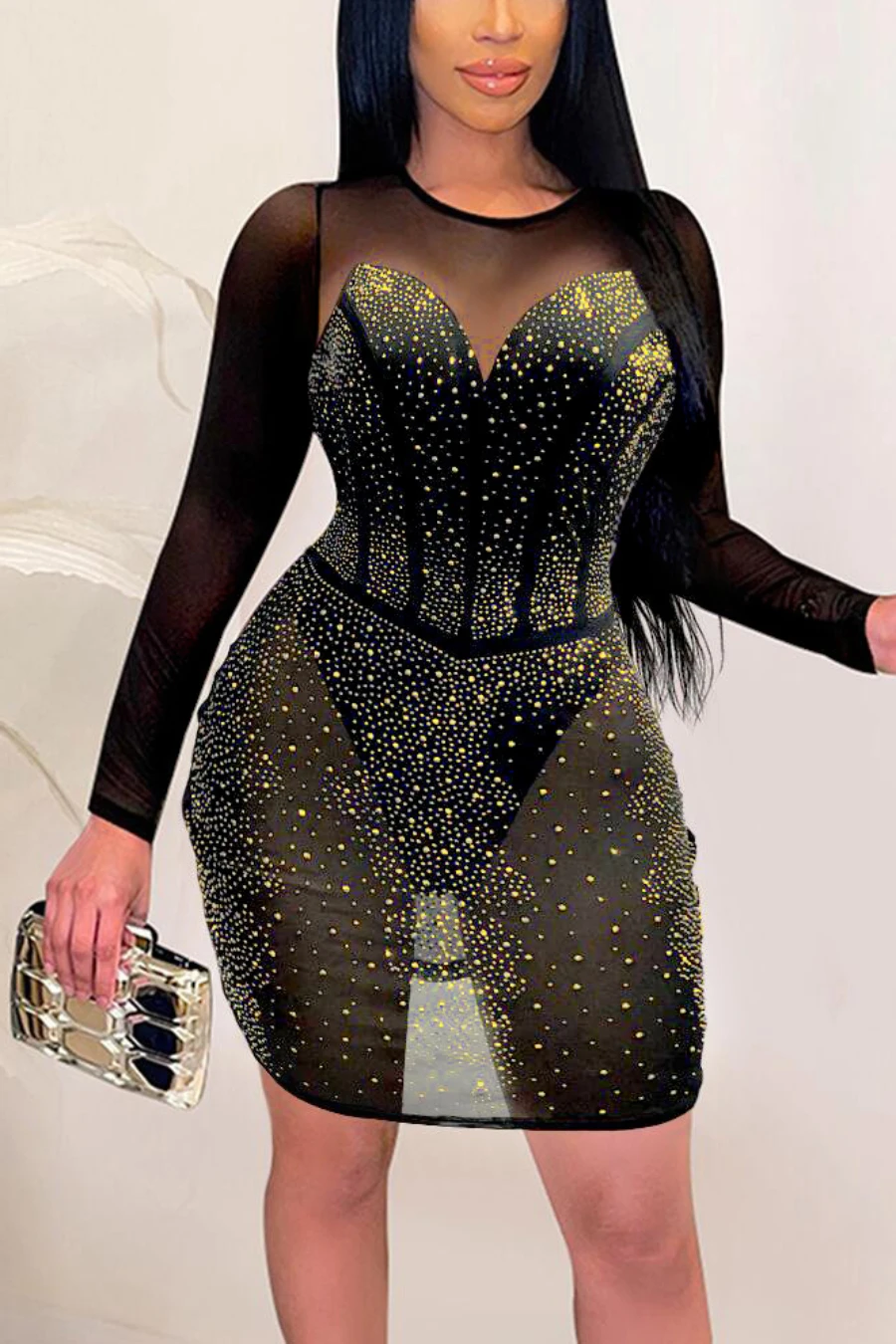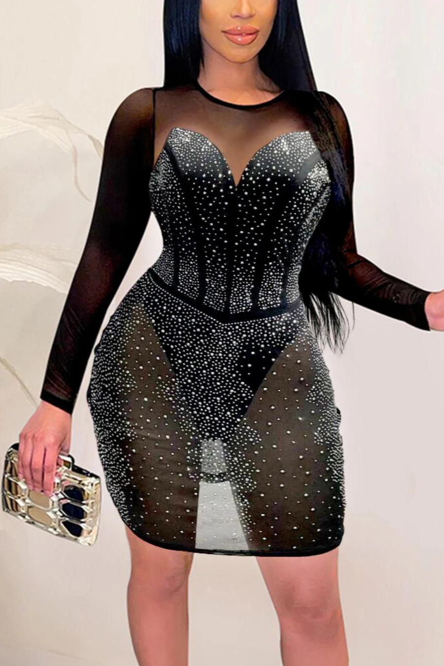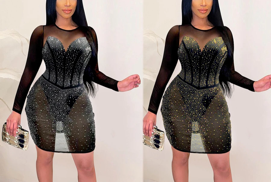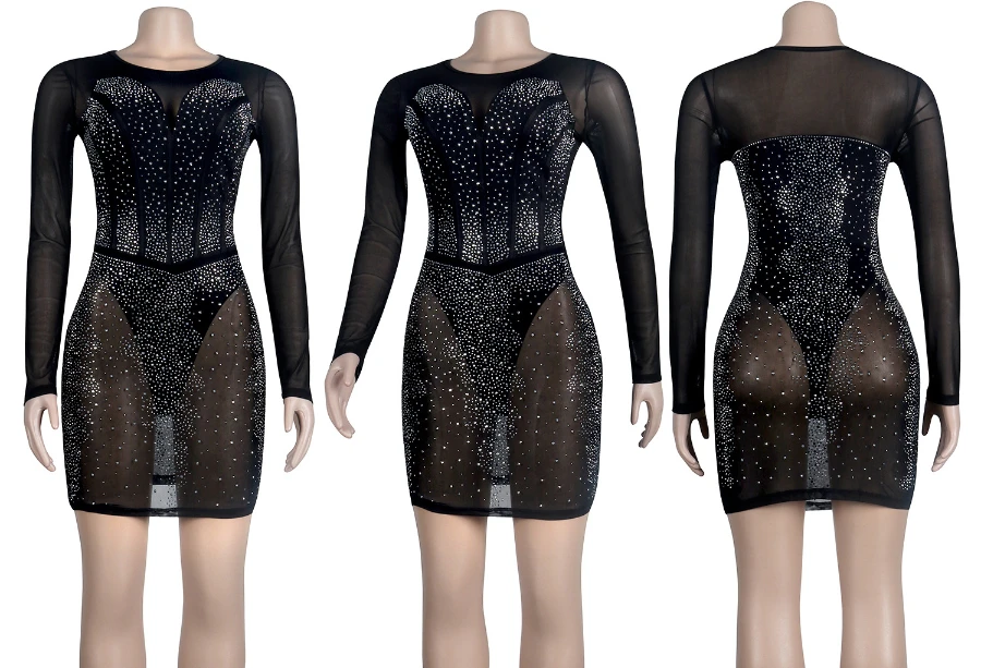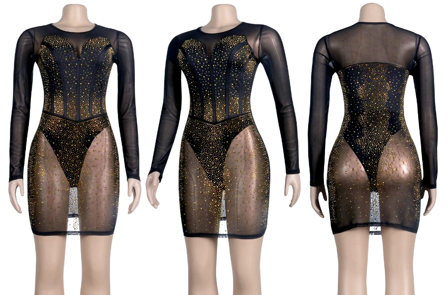 Early autumn new stylish plus size stretch patchwork mesh see-through rhinestone sexy mini dress(with lining)