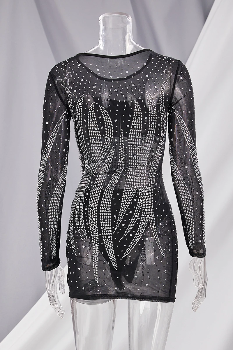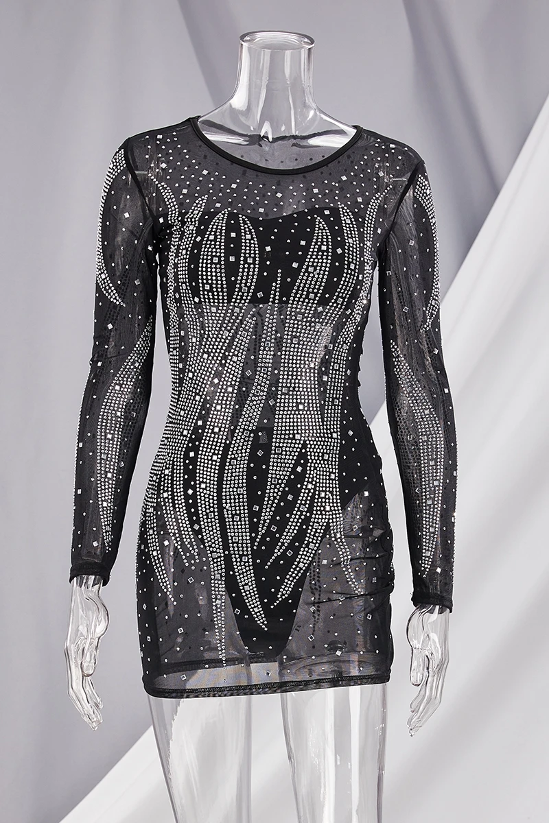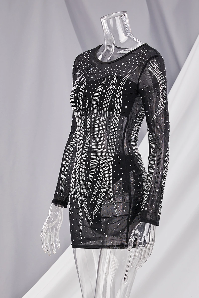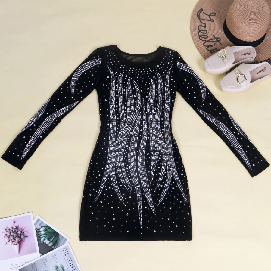 Early autumn new stylish plus size stretch rhinestone slim mesh see-through sexy mini dress