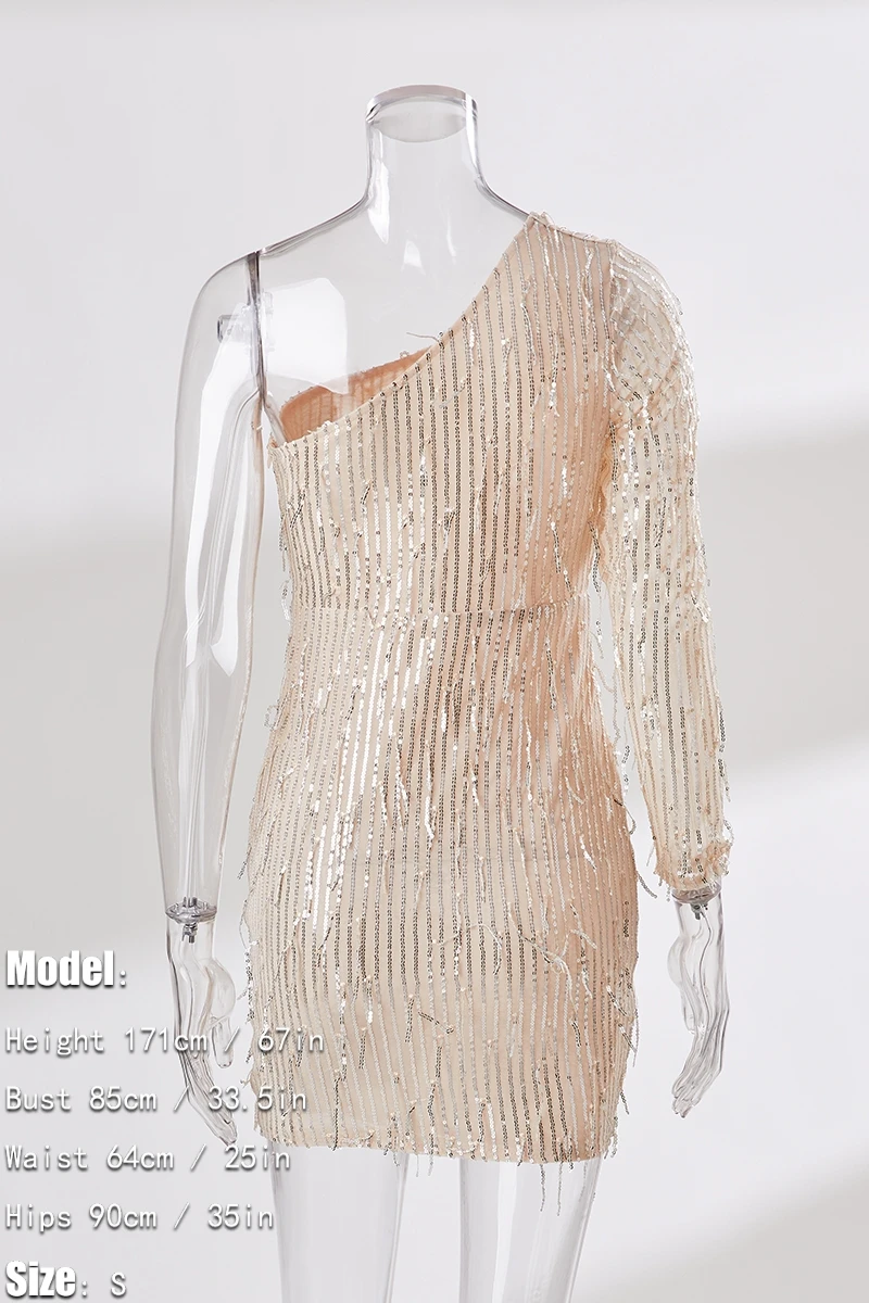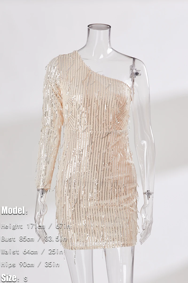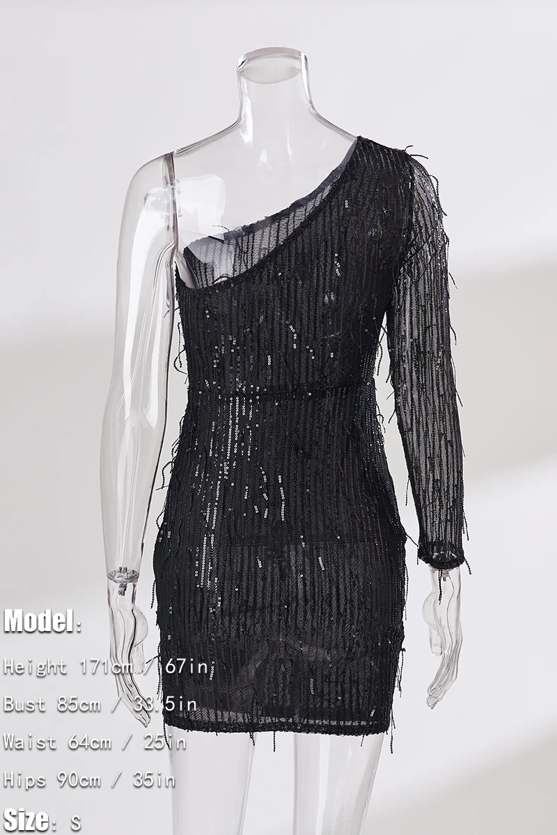 Early autumn new stylish sequins tassel zip-up one shoulder slight stretch plus size high quality sexy mini dress