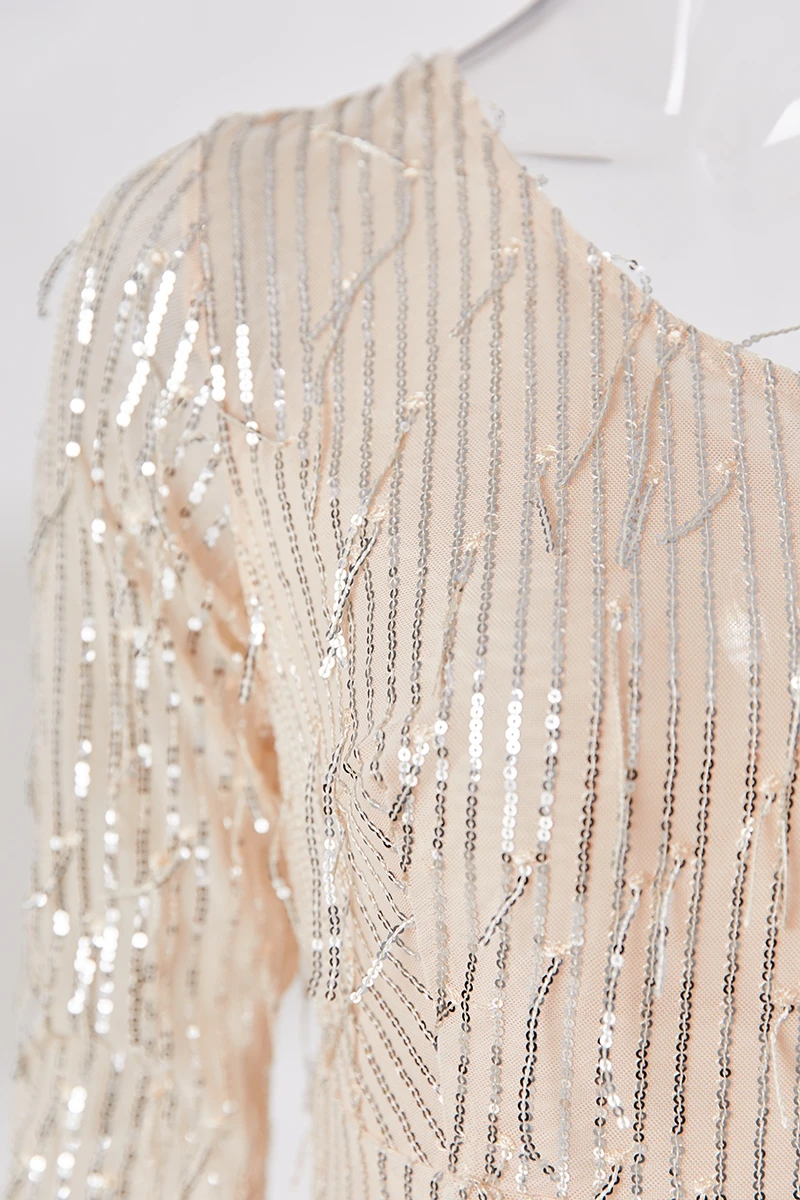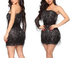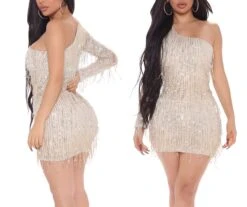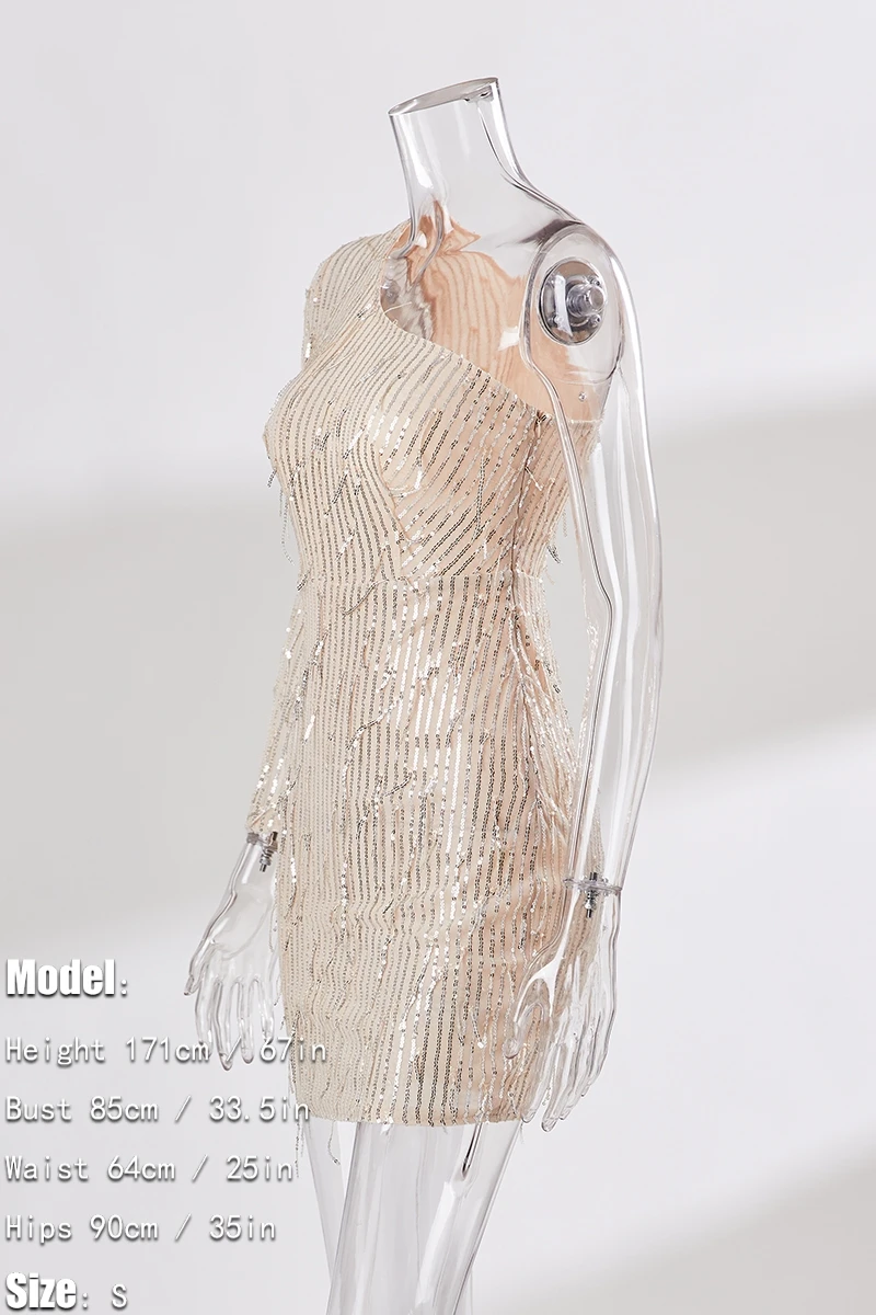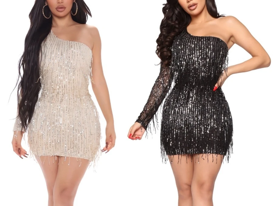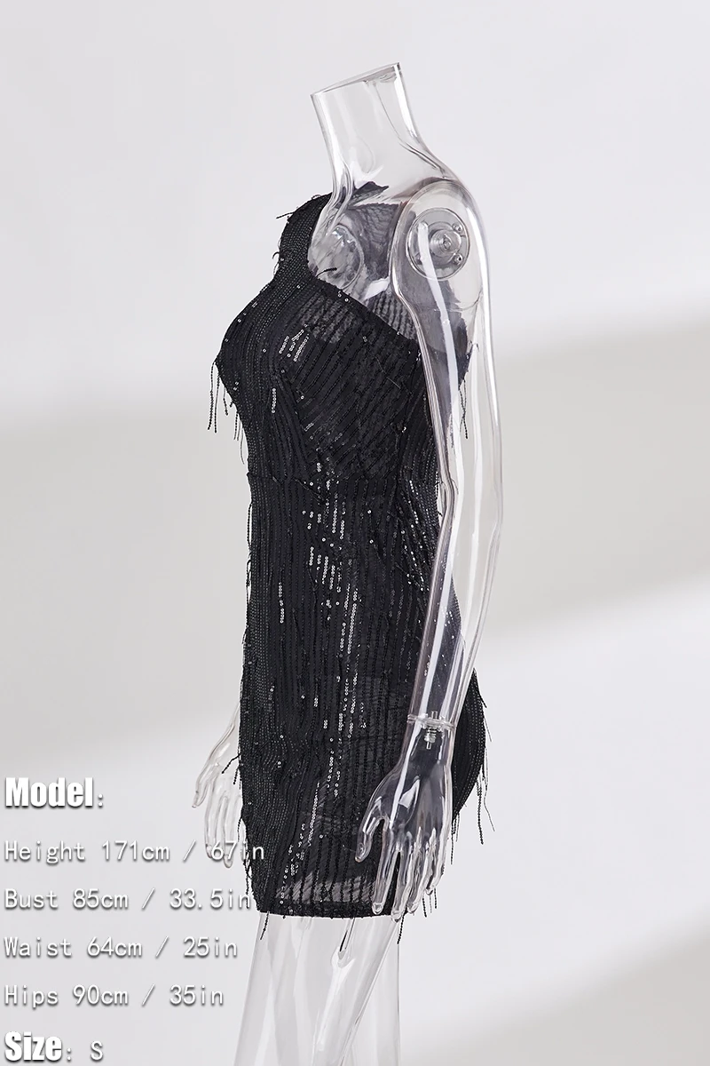 Early autumn new stylish sequins tassel zip-up one shoulder slight stretch plus size high quality sexy mini dress
