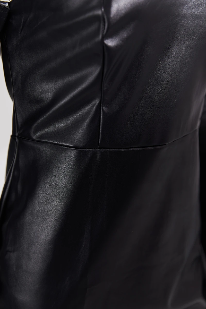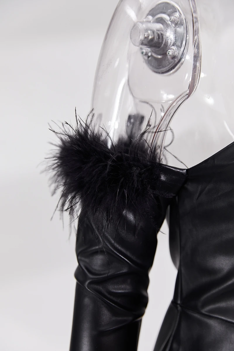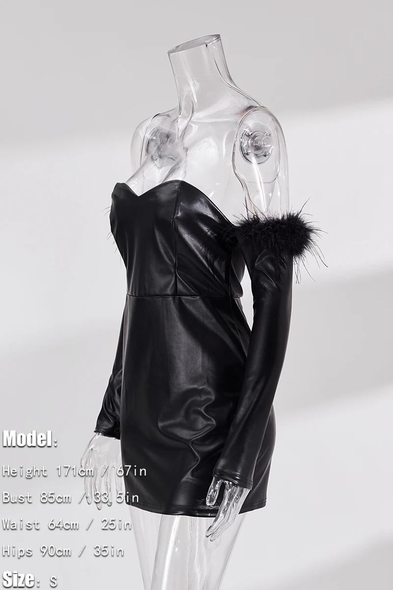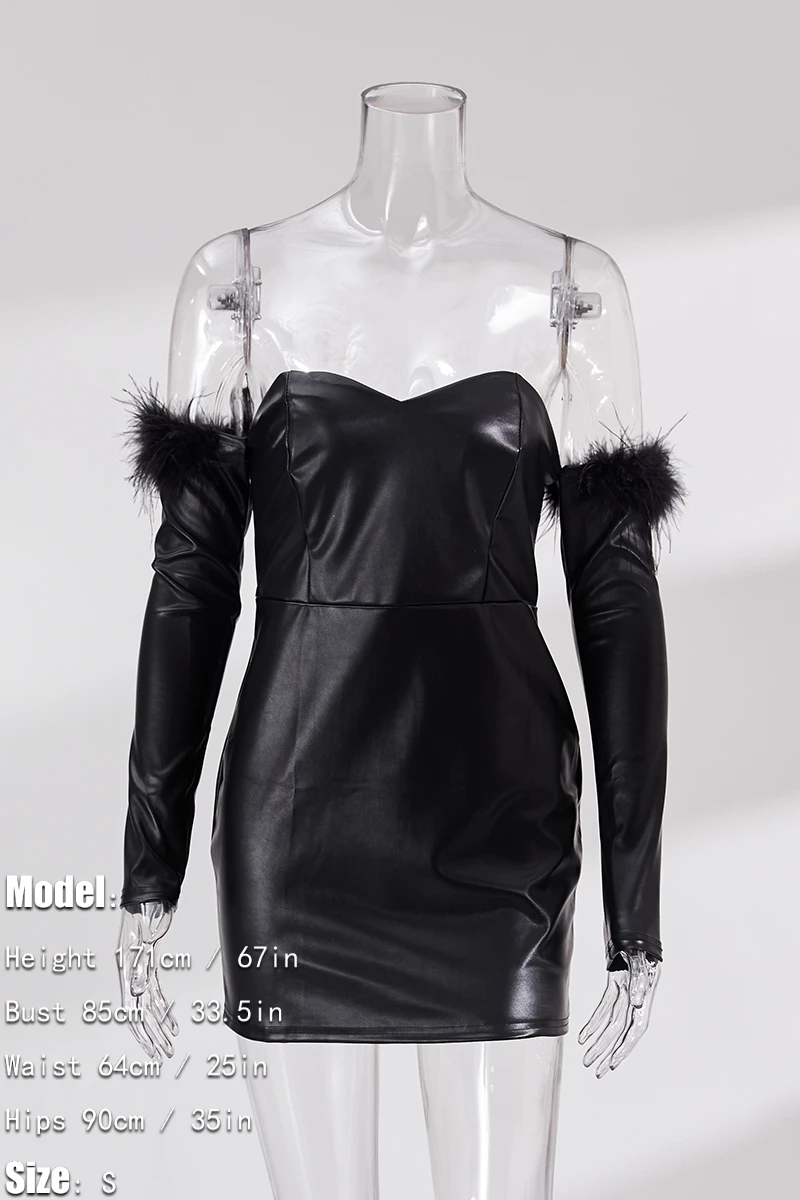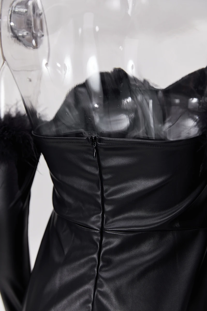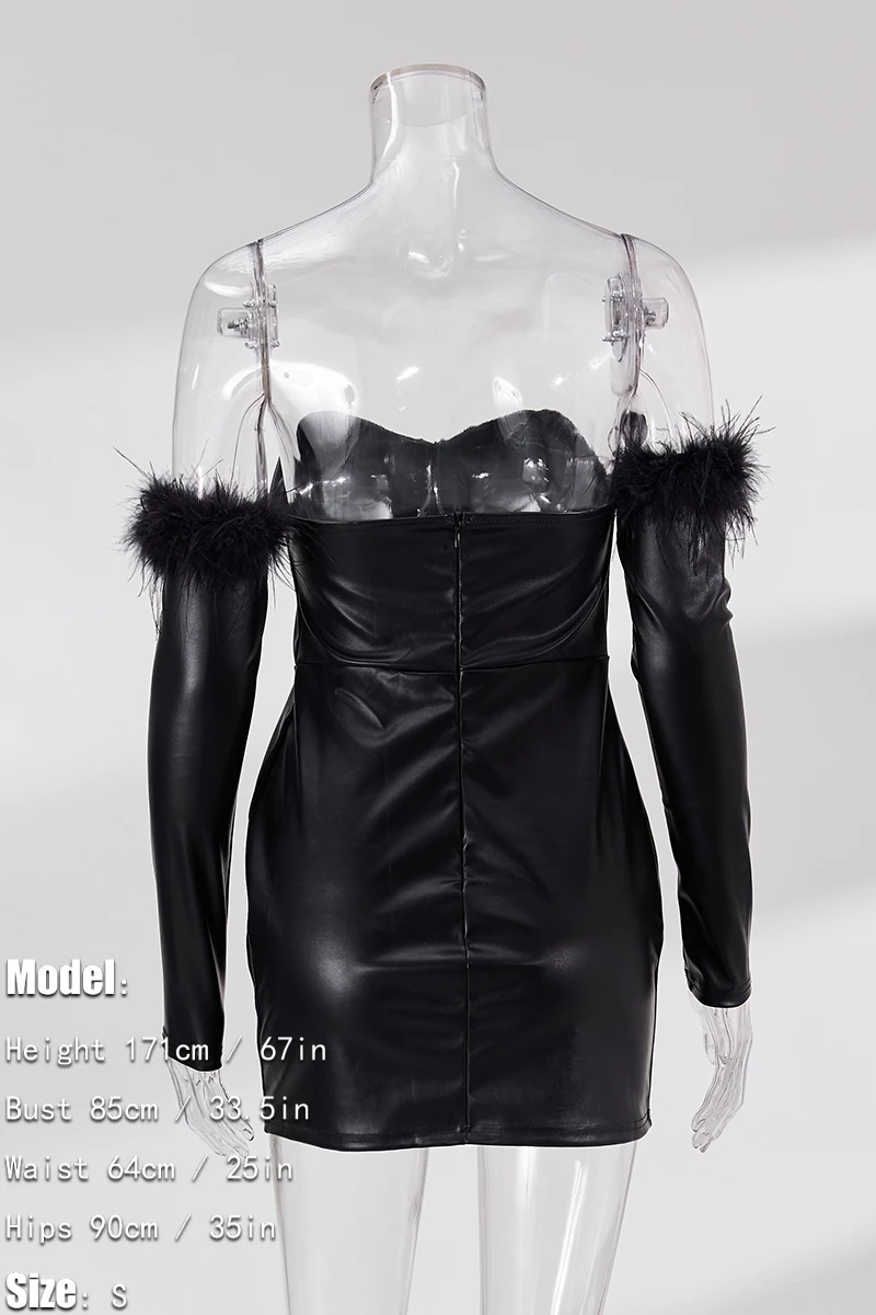 Early autumn new stylish solid color pu feather zip-up strapless backless slight stretch slim sexy mini dress