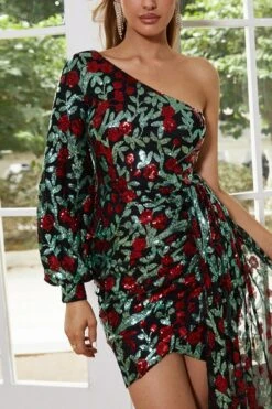 Elegant non-stretch sequins one shoulder slim mini evening dress