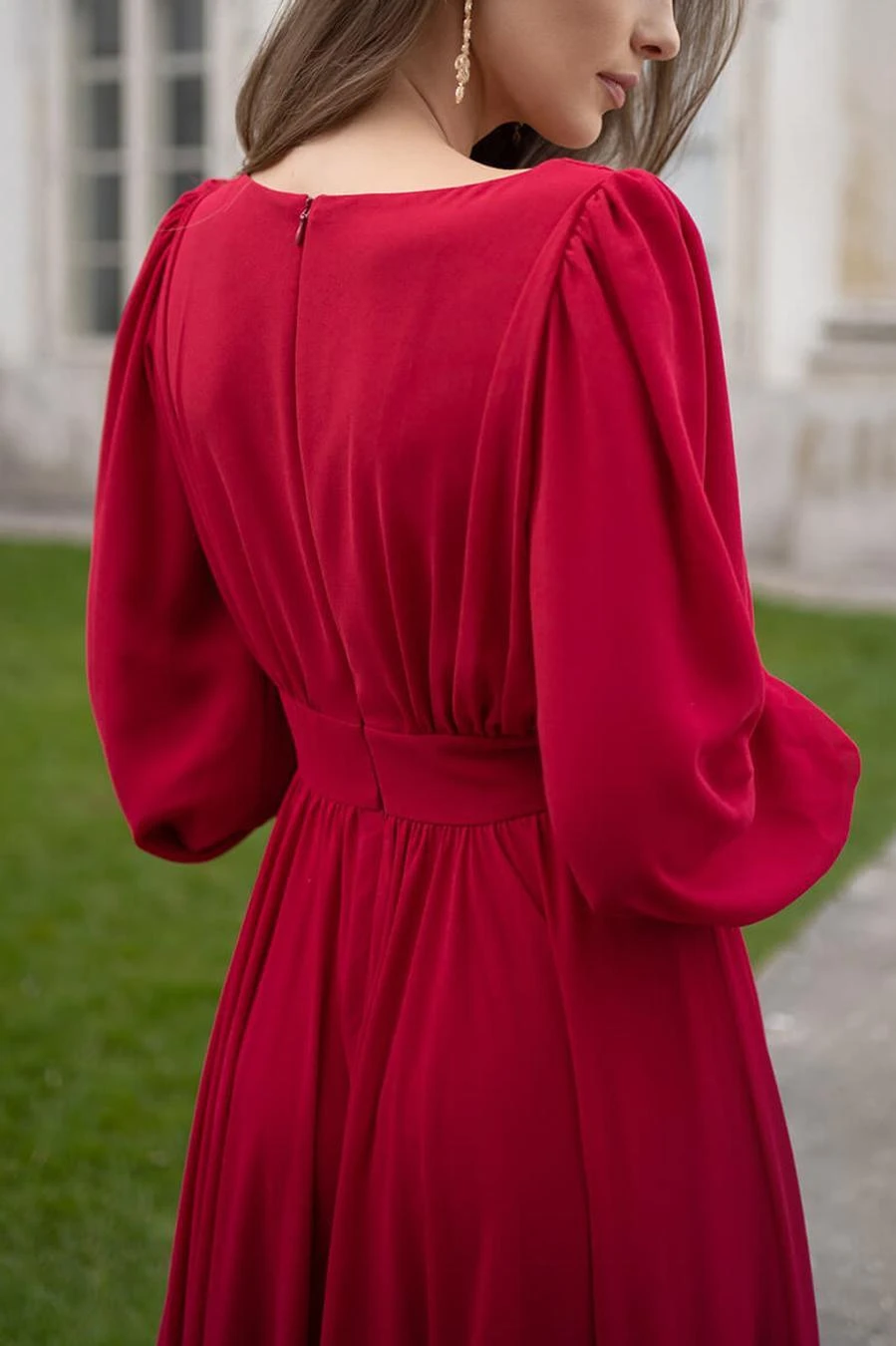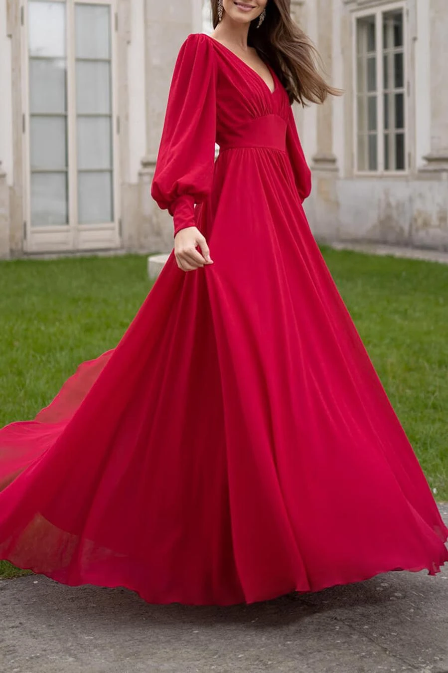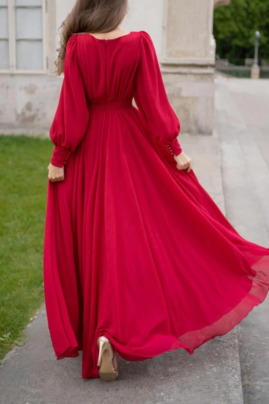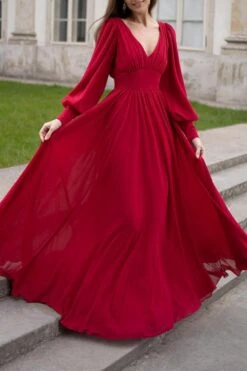 Elegant non-stretch solid color chiffon v-neck zip-up maxi dress