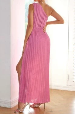 Elegant non-stretch solid color high slit one shoulder pleated maxi dress