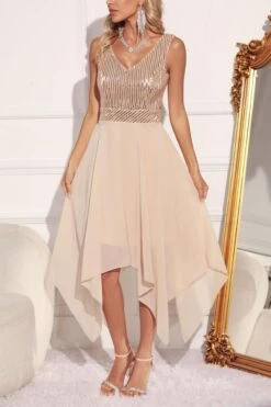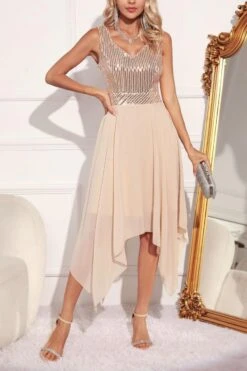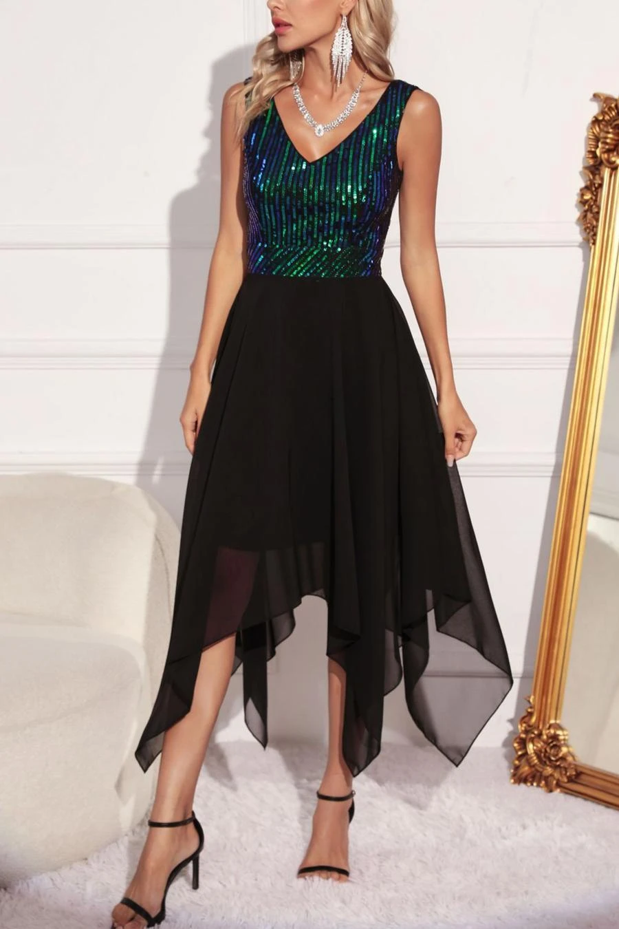 Elegant non-stretch v neck sequin zip-up midi irregular evening dress
