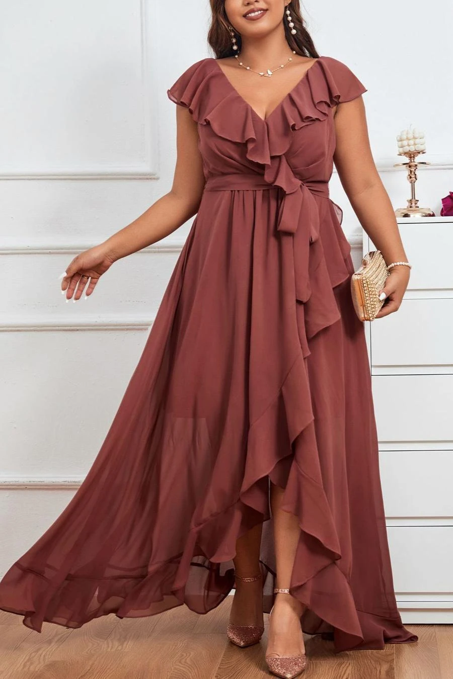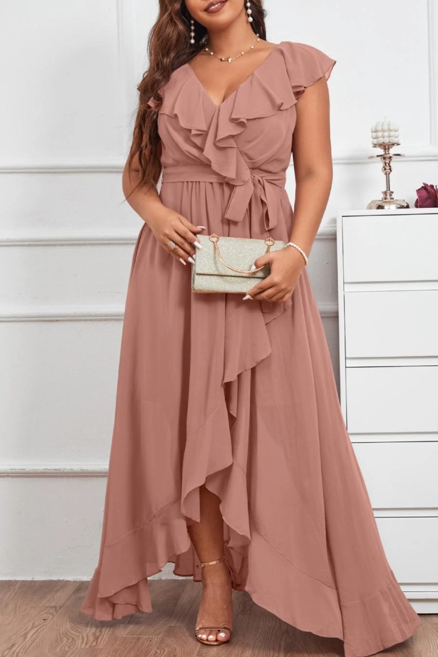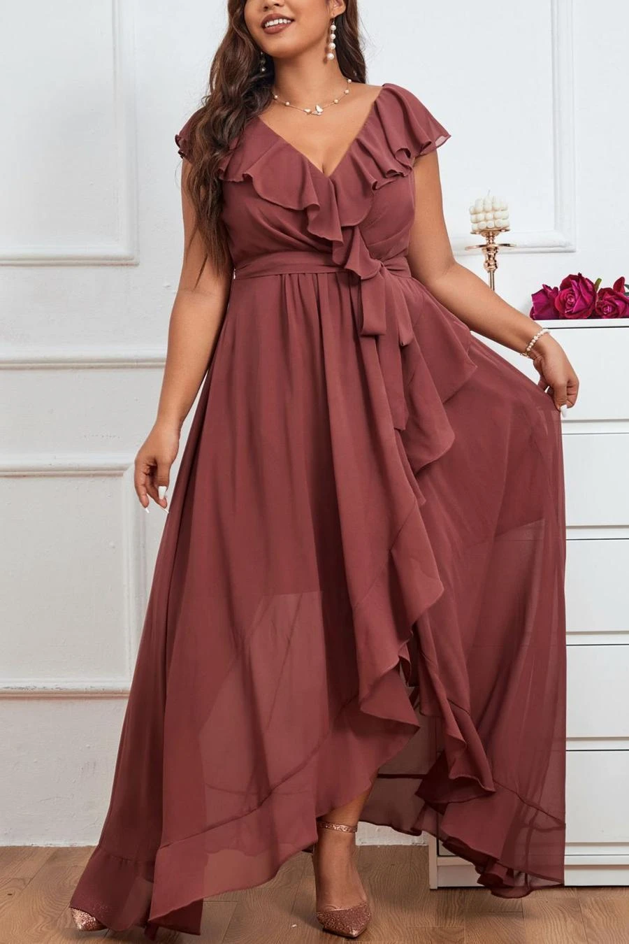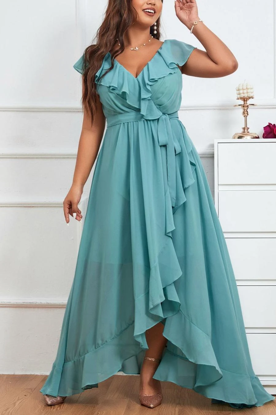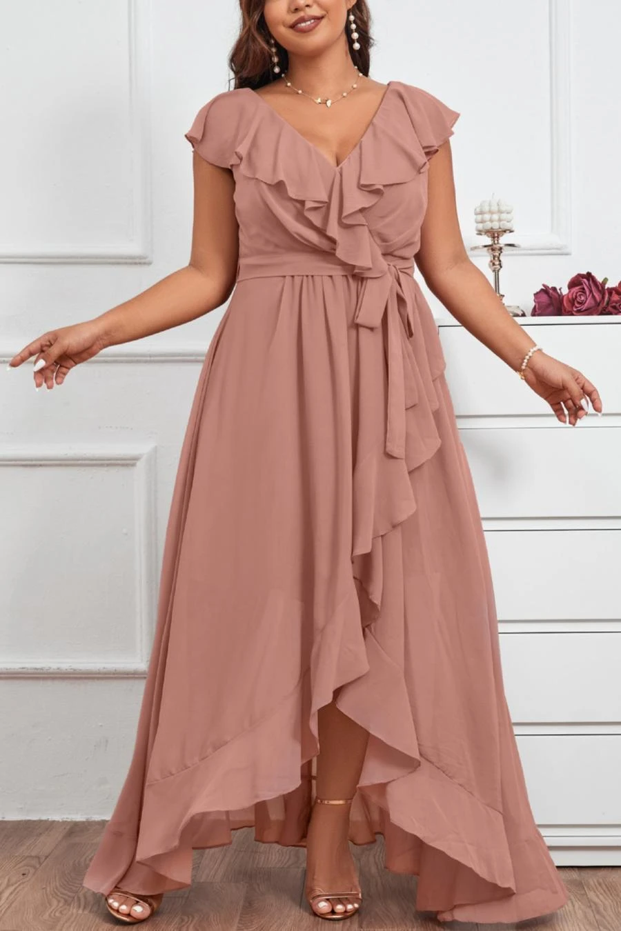 Elegant plus size non-stretch chiffon v-neck sling slit maxi dress