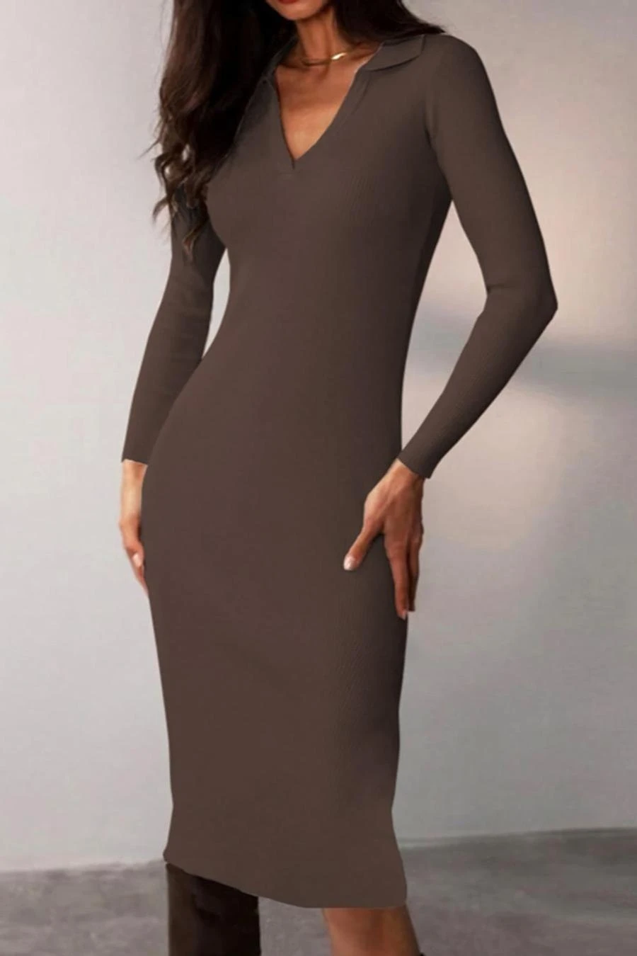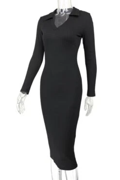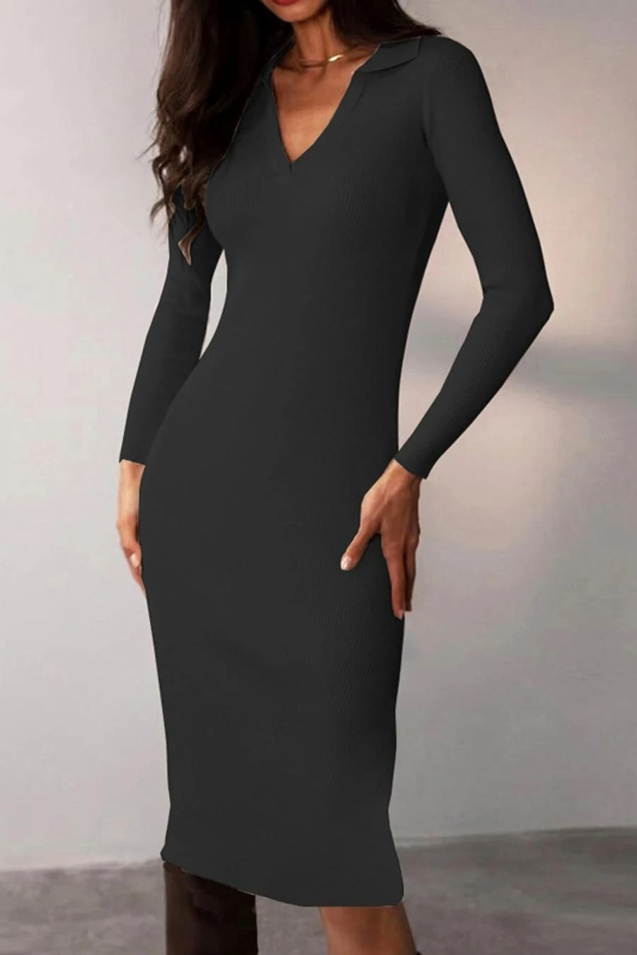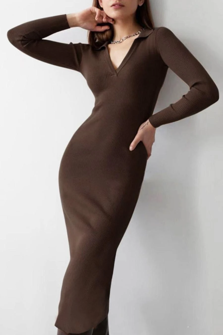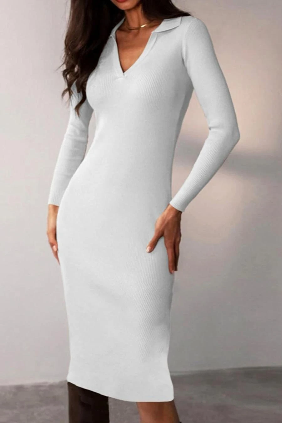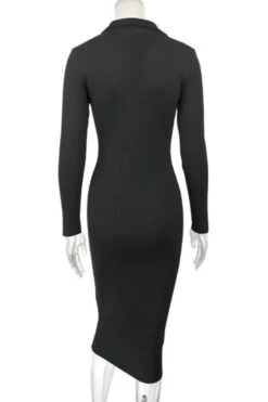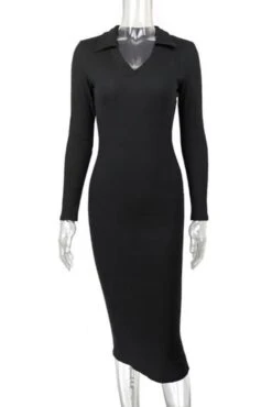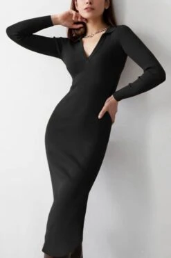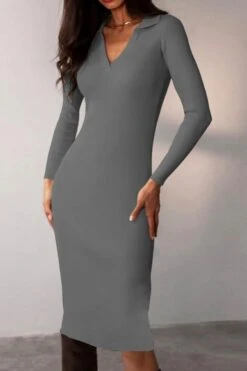 Four colors ribbed knitted stretch long sleeve slim stylish midi dress