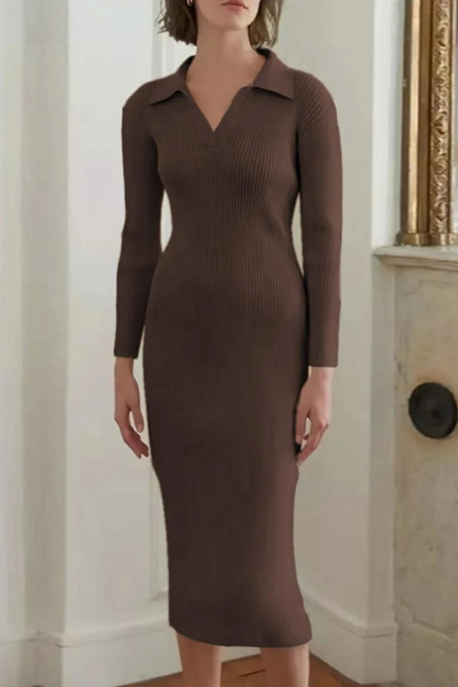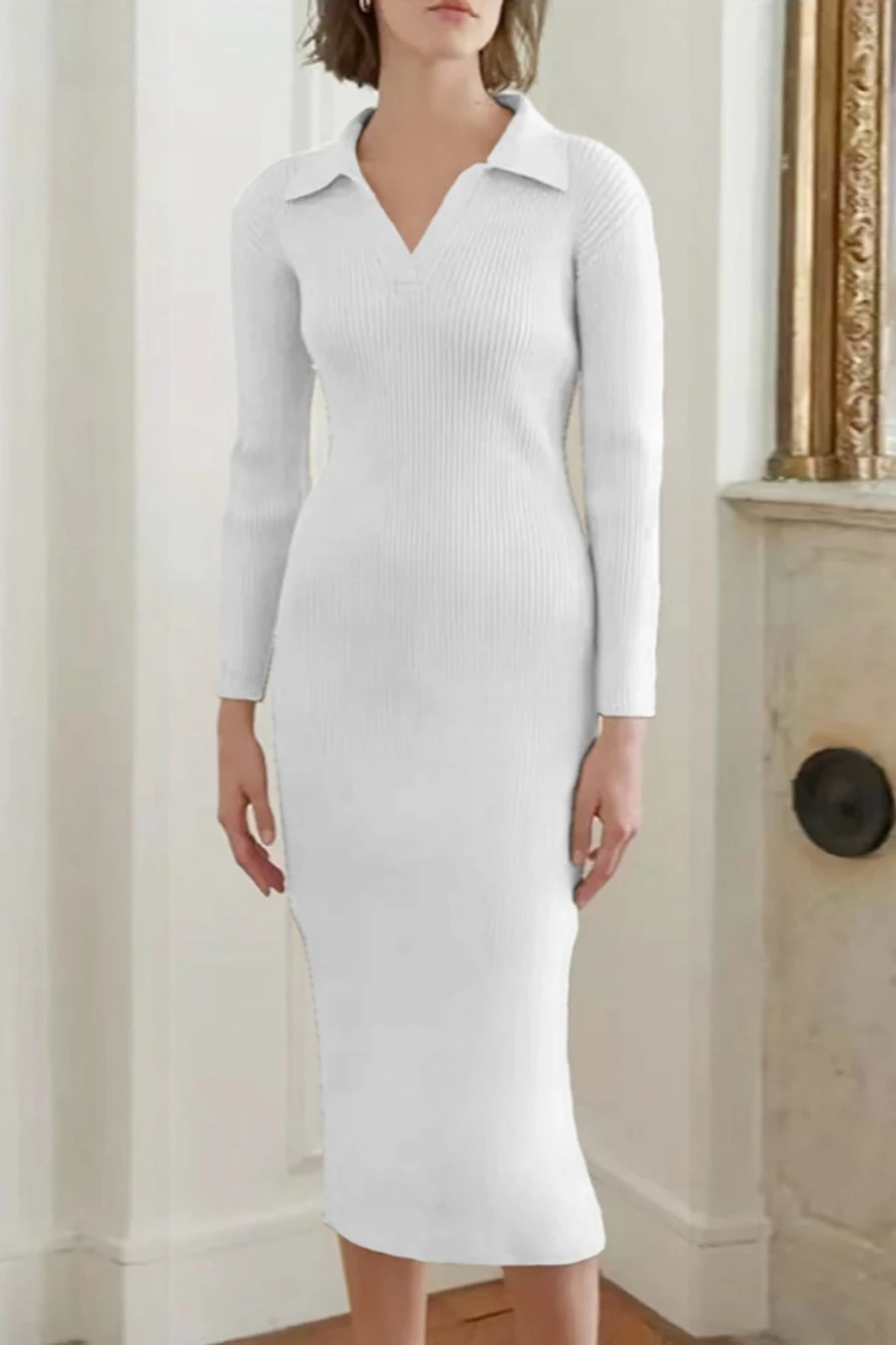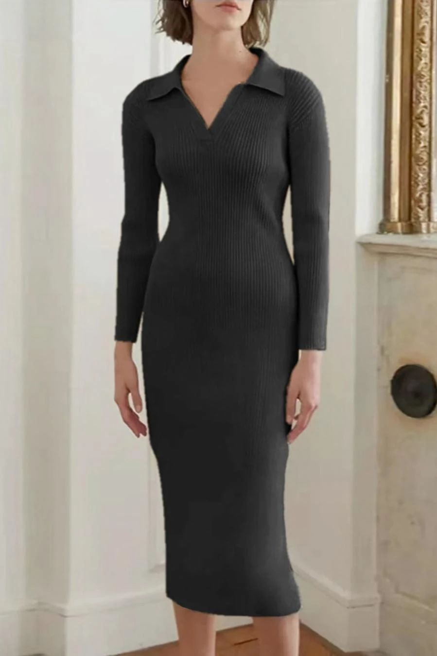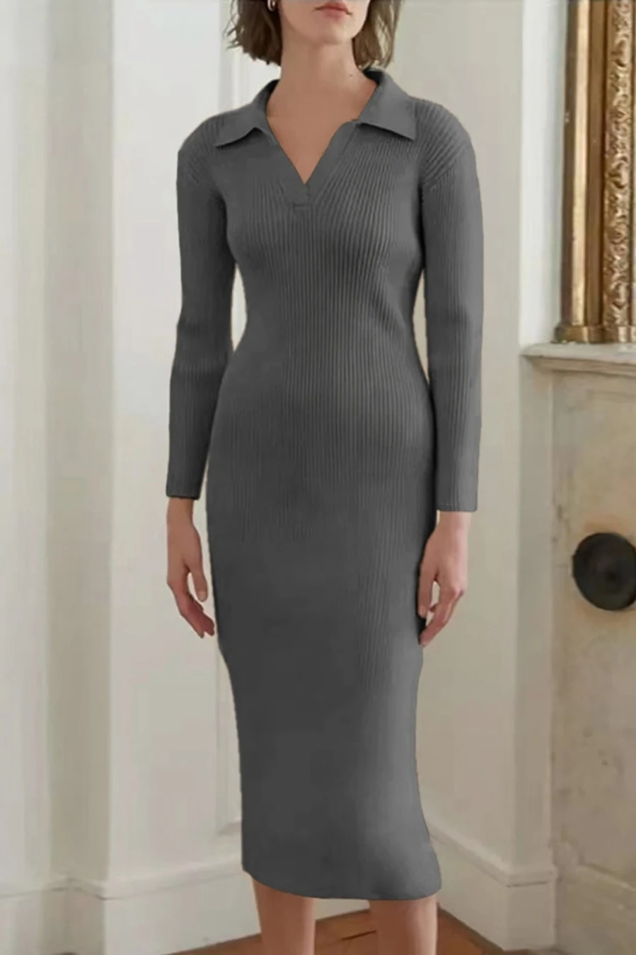 Four colors ribbed knitted stretch long sleeve slim stylish midi dress