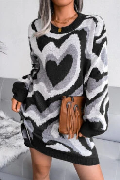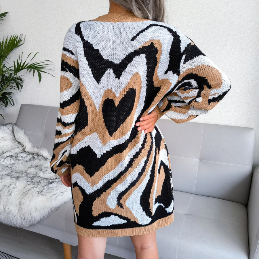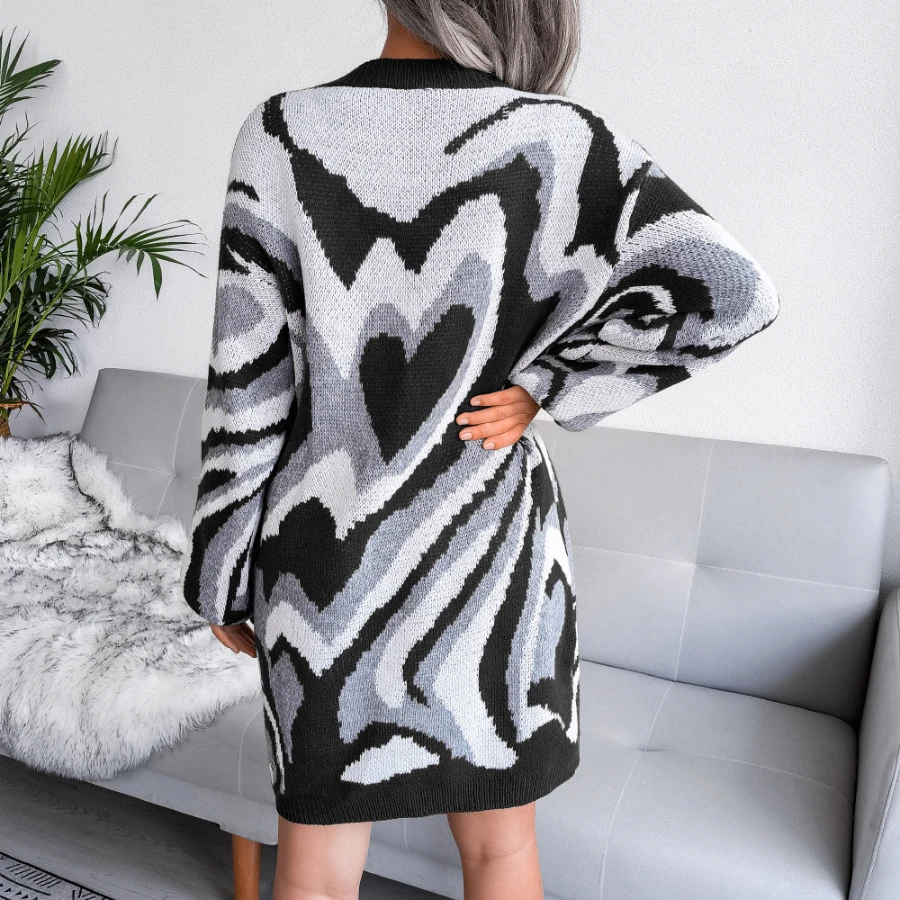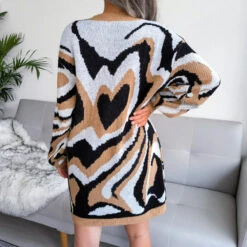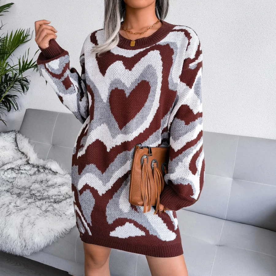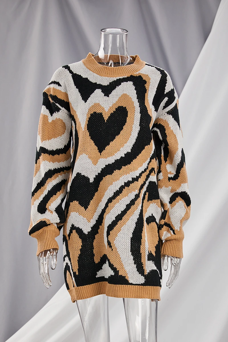 Heart contrast color new stylish 3 colors round neck autumn loose knitting casual mini dress (without belt)