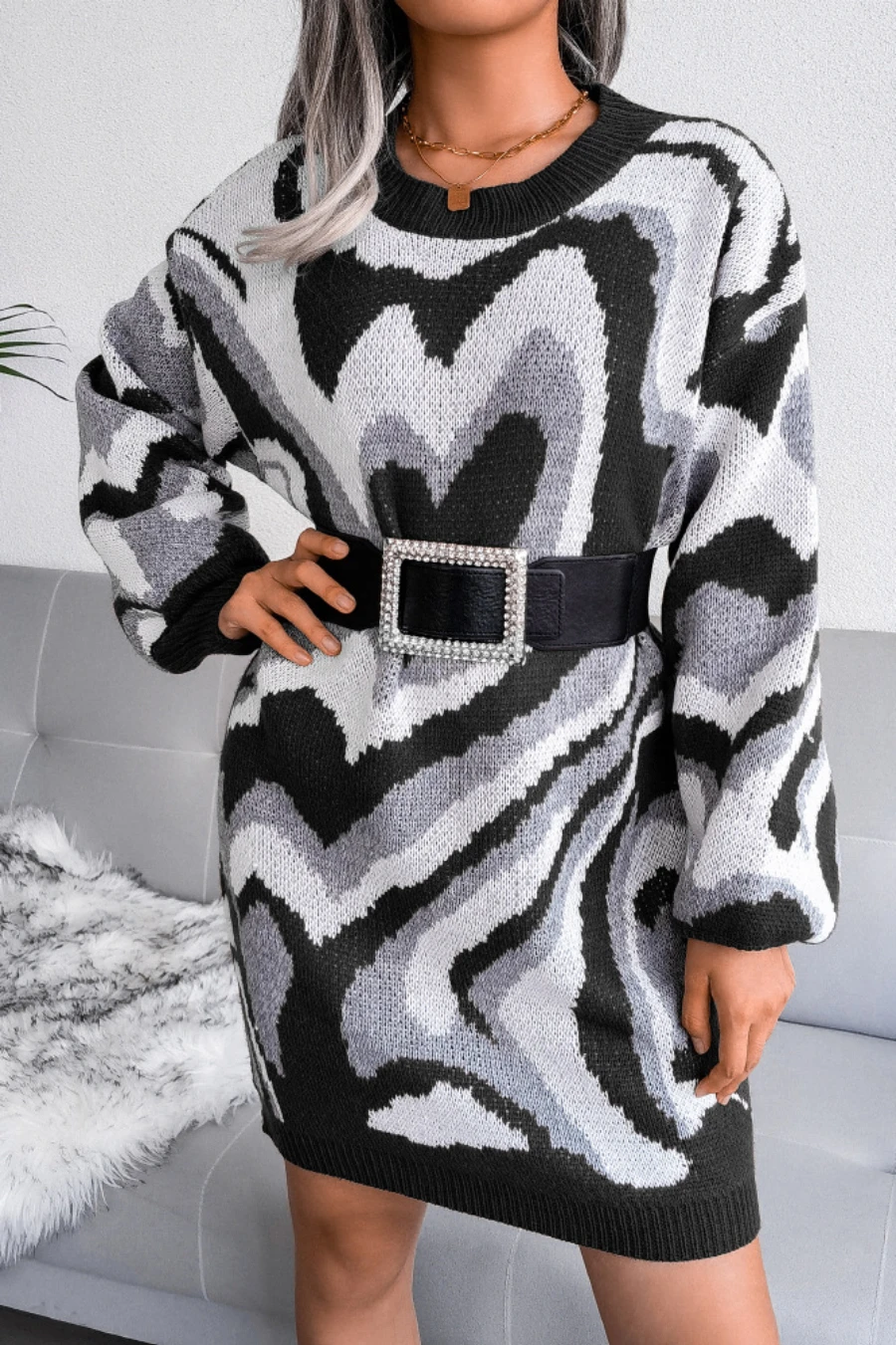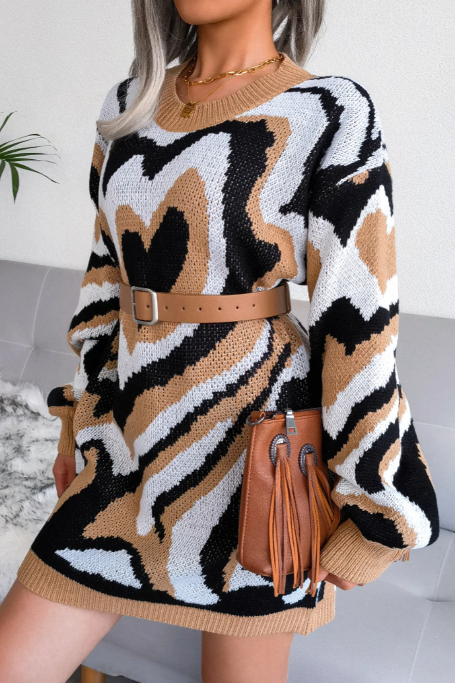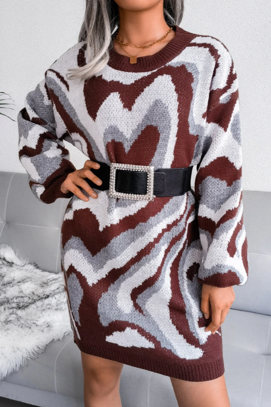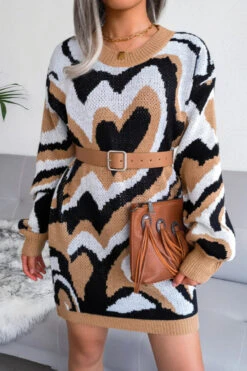 Heart contrast color new stylish 3 colors round neck autumn loose knitting casual mini dress (without belt)