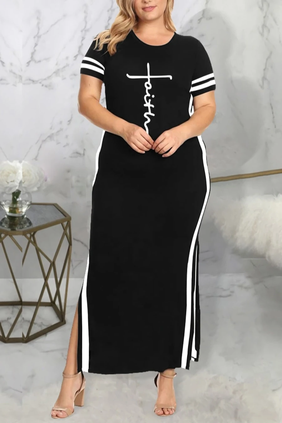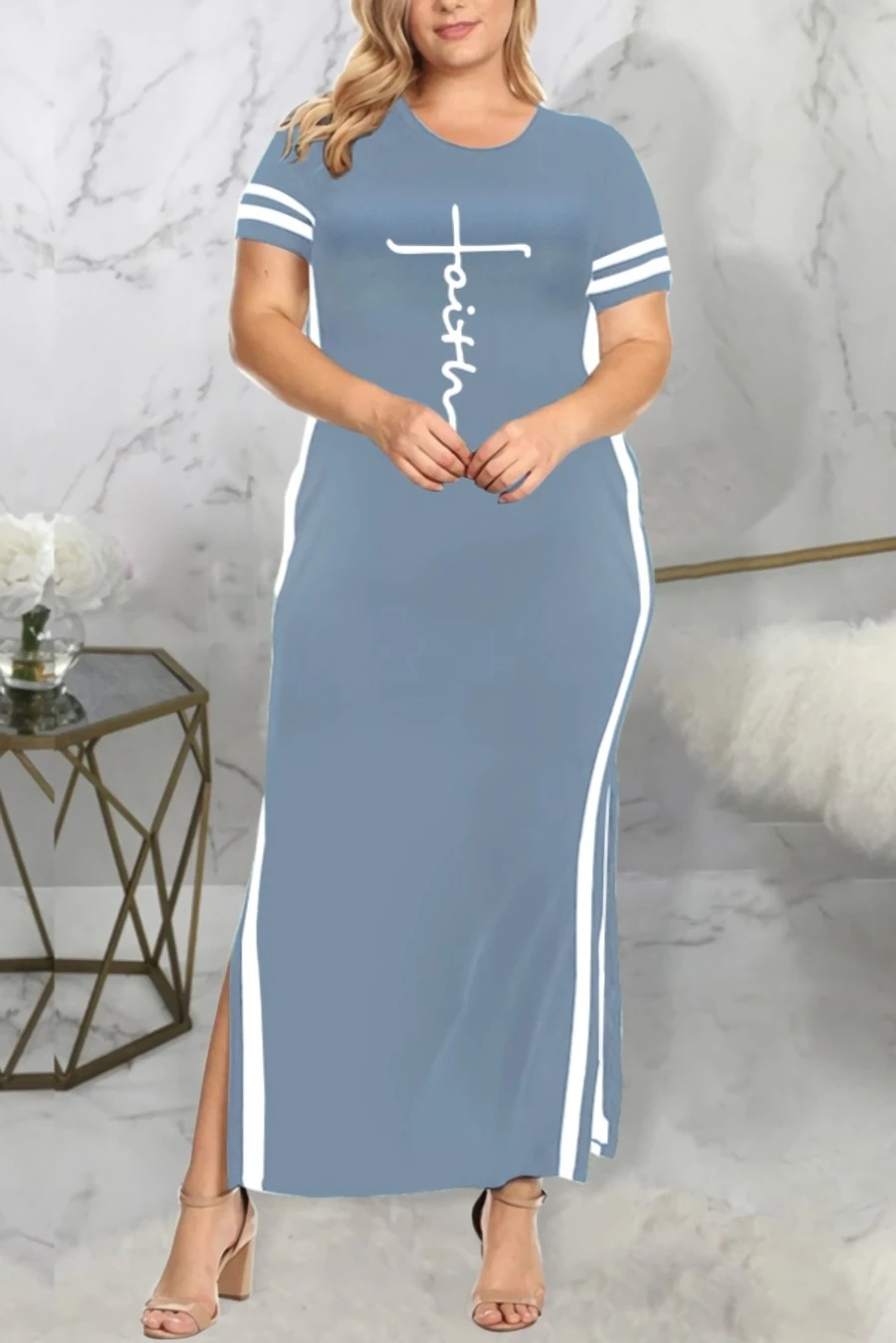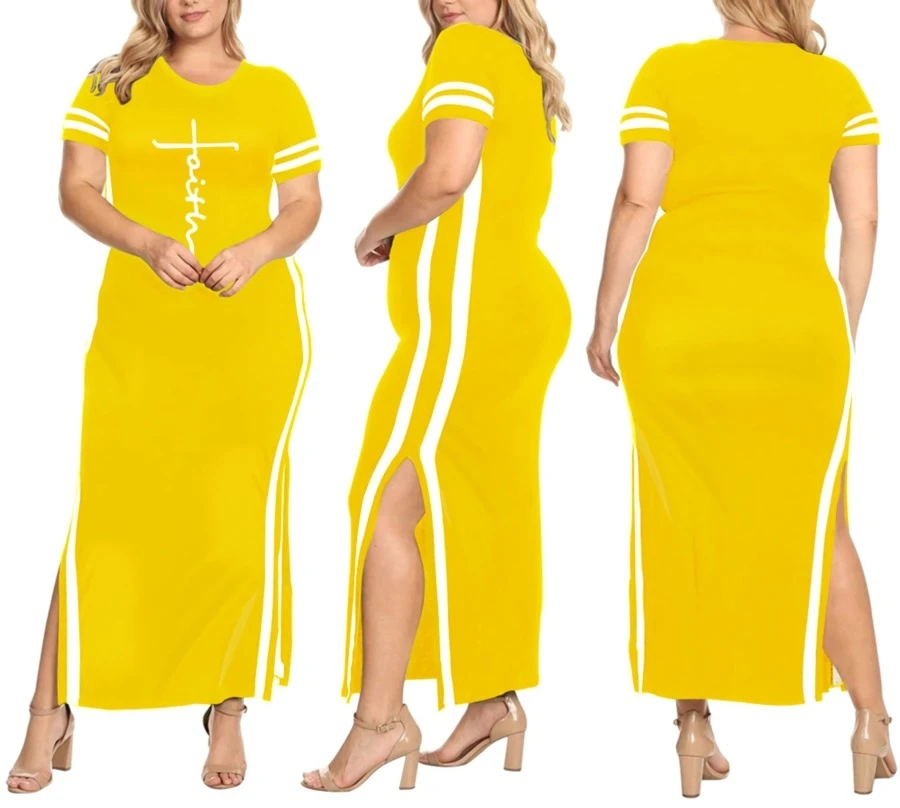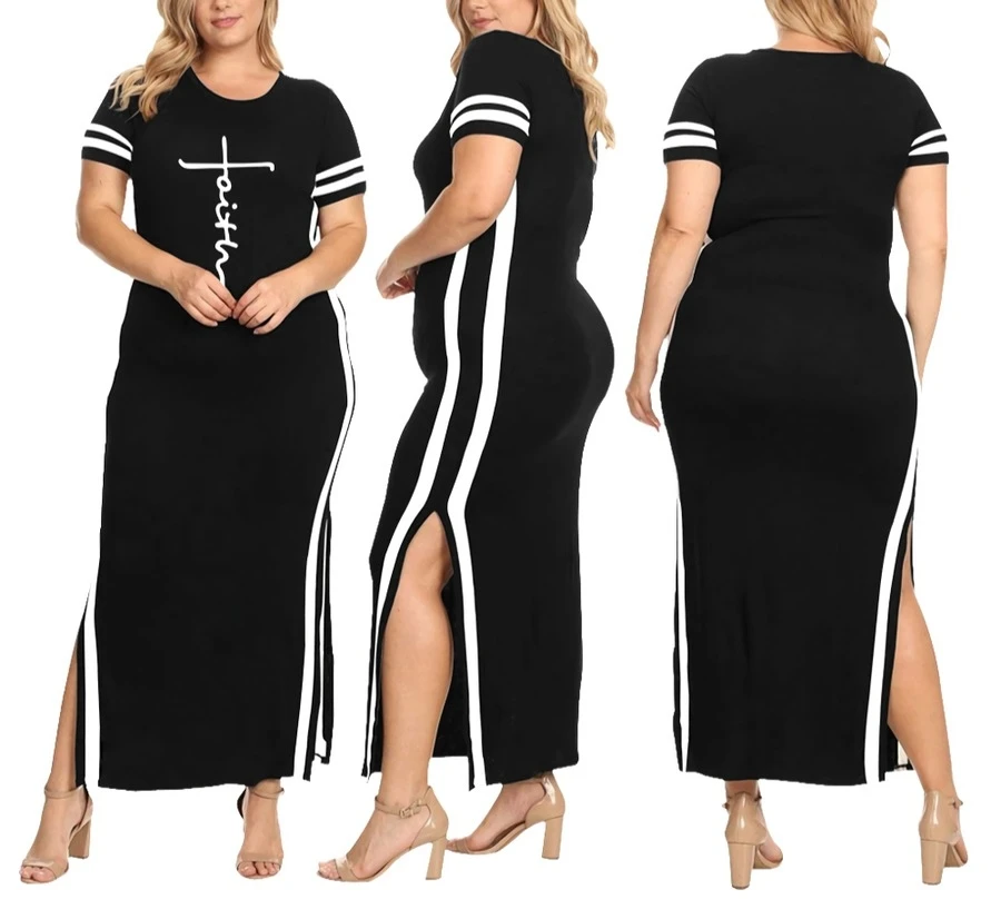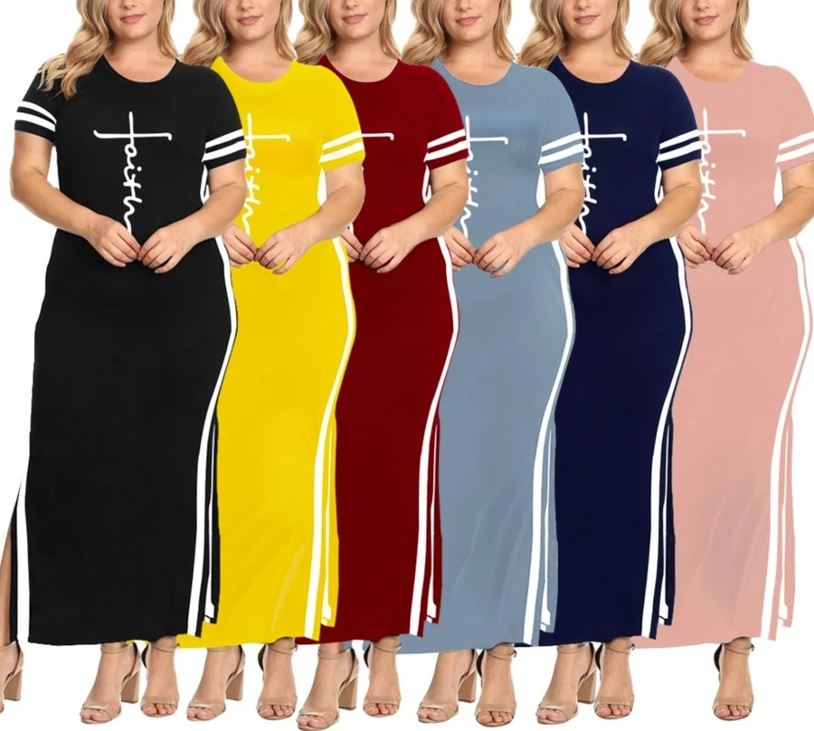 L-5XL plus size summer new stylish simple letter printing loose 6 colors contrast color slit casual maxi dress