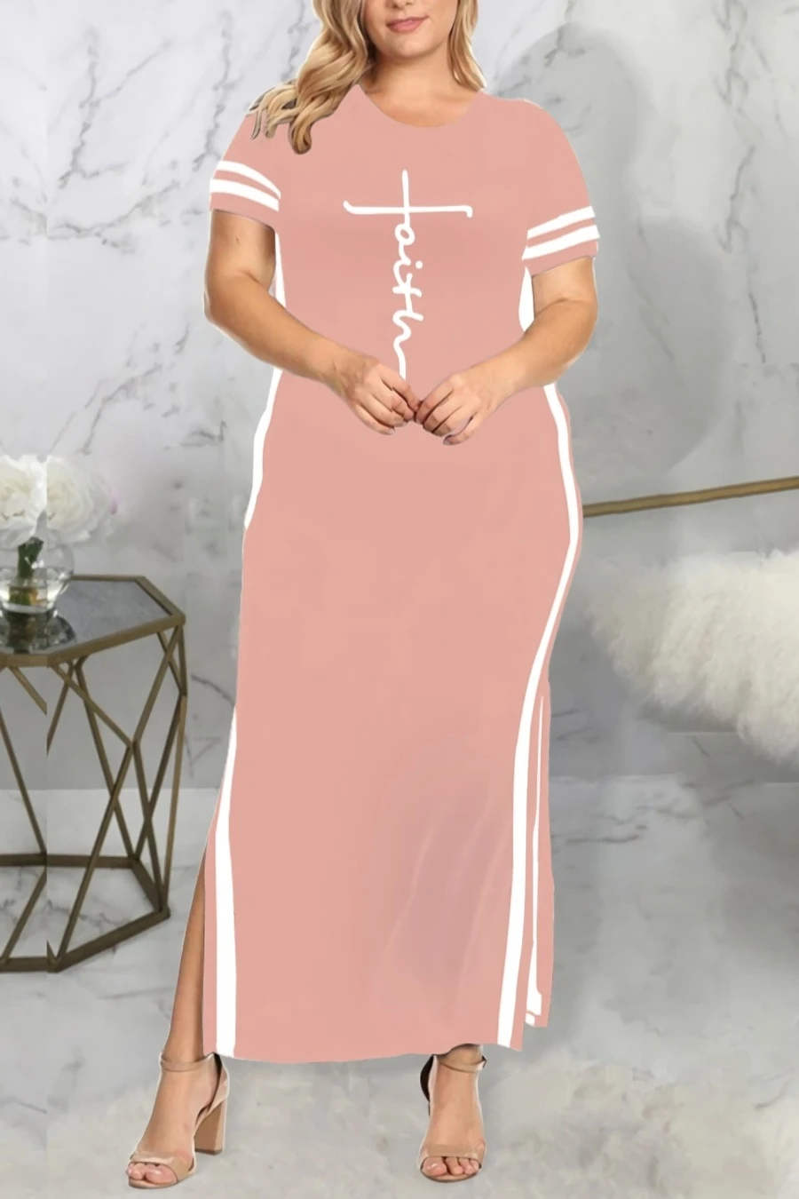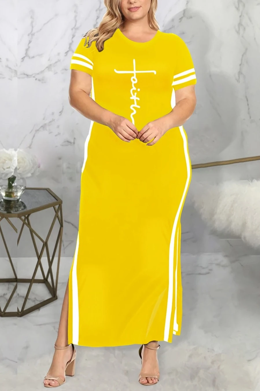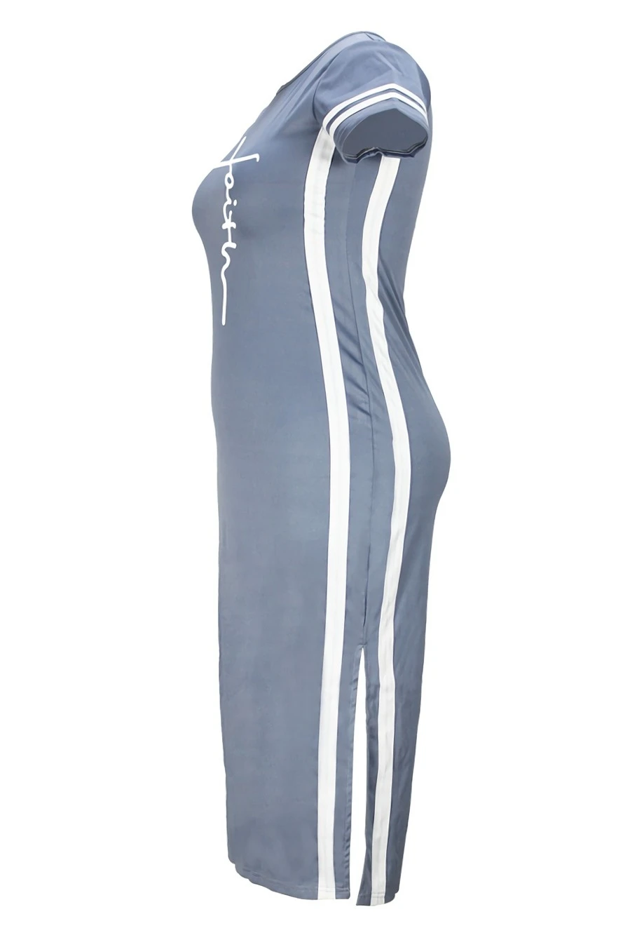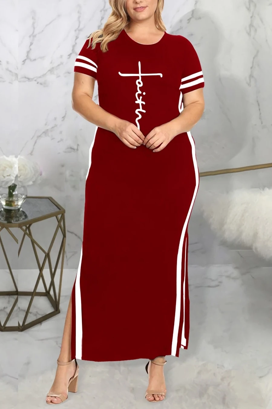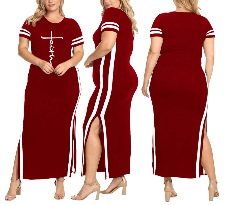 L-5XL plus size summer new stylish simple letter printing loose 6 colors contrast color slit casual maxi dress