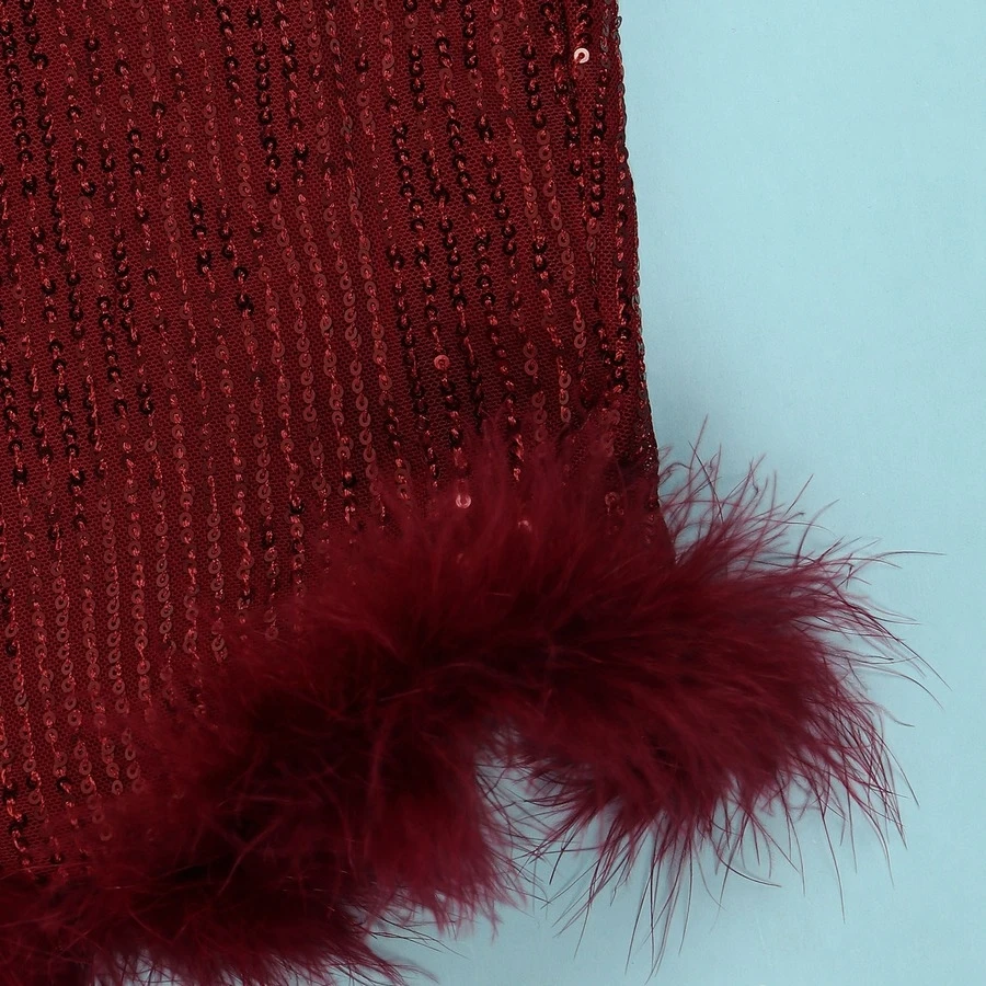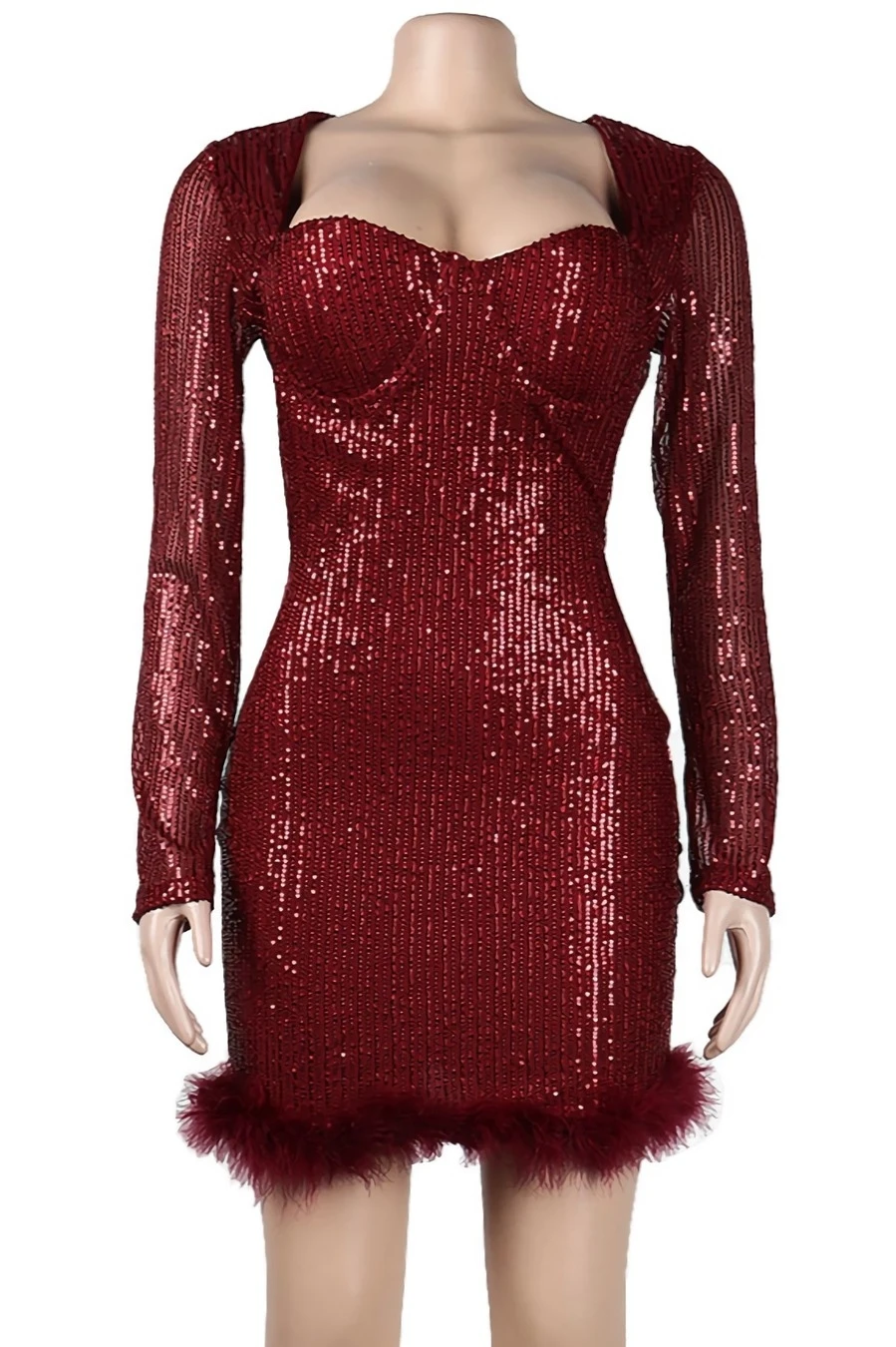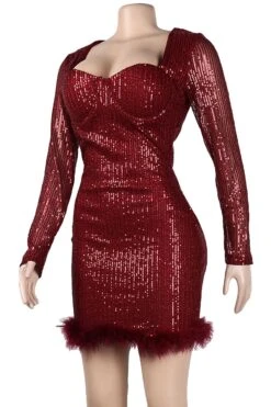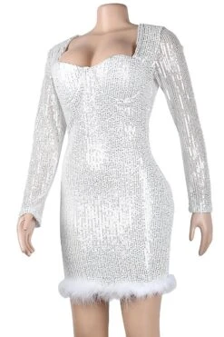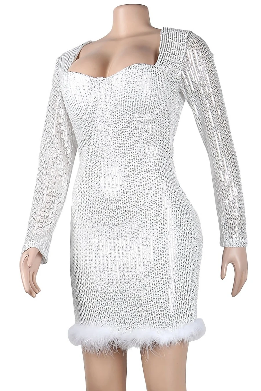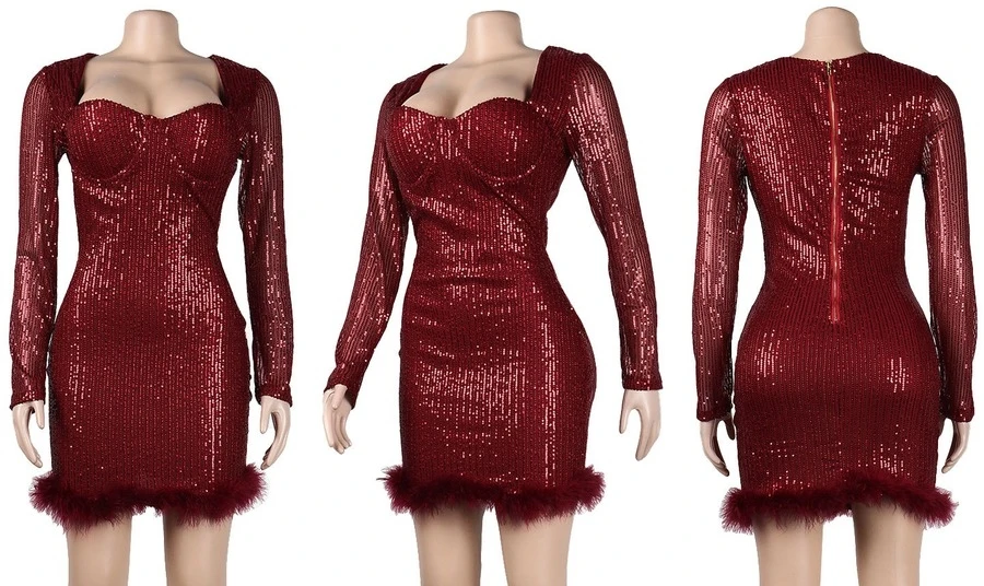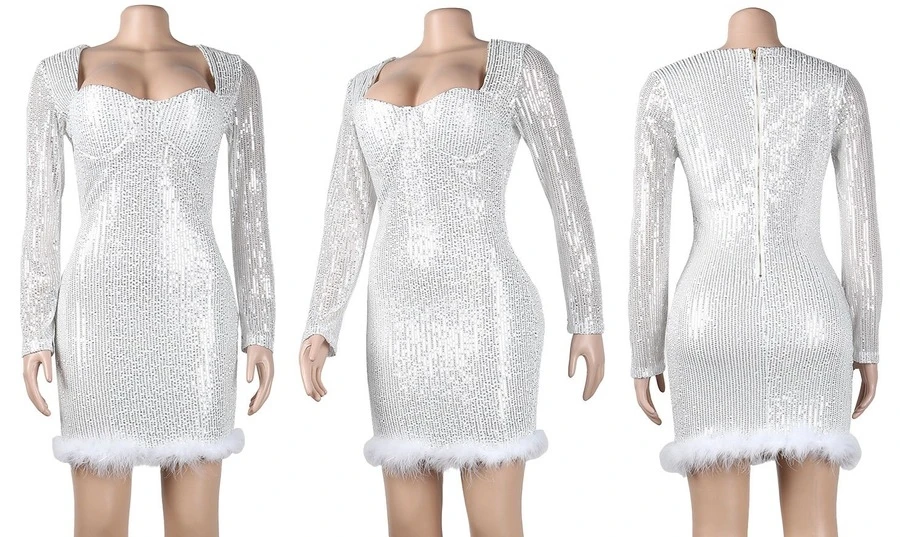 M-2XL plus size sequin fuzzy decor square neck slight stretch sexy mini dress