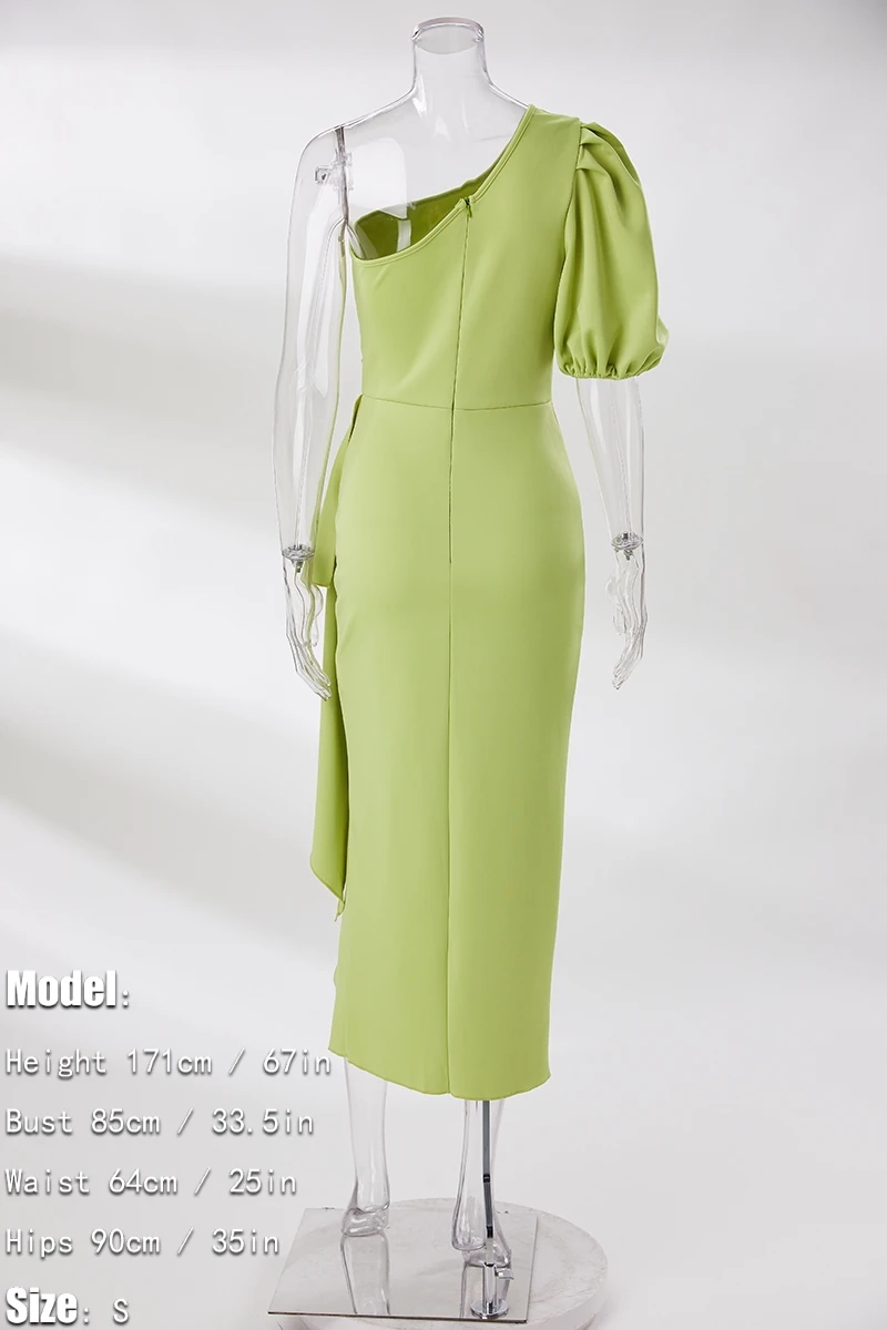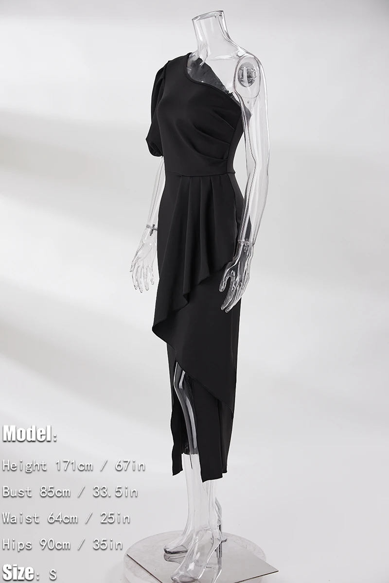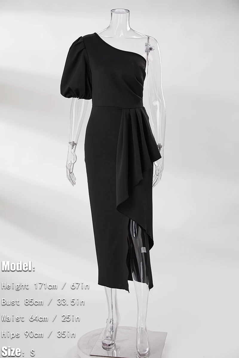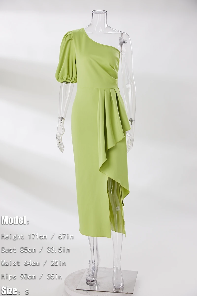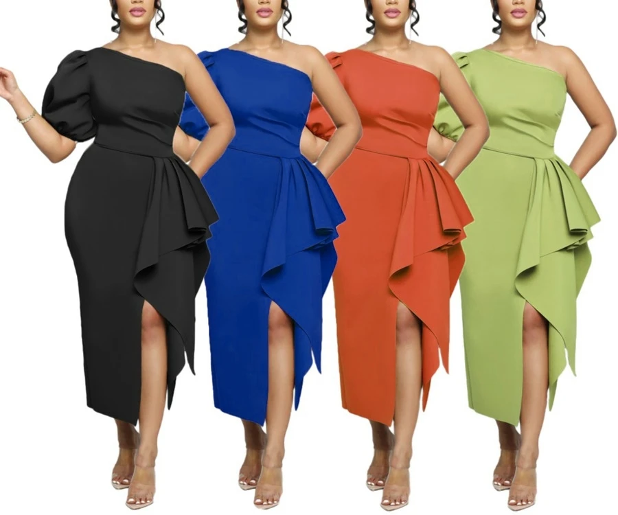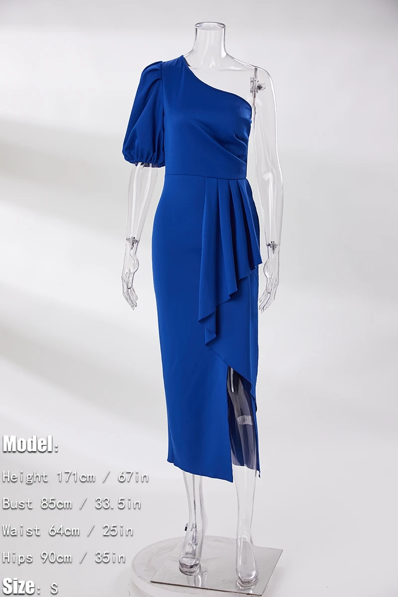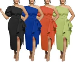 New 4 colors stretch one shoulder ruffle back zip-up split stylish midi dress