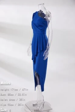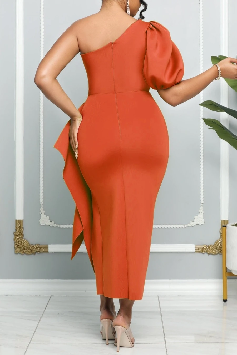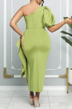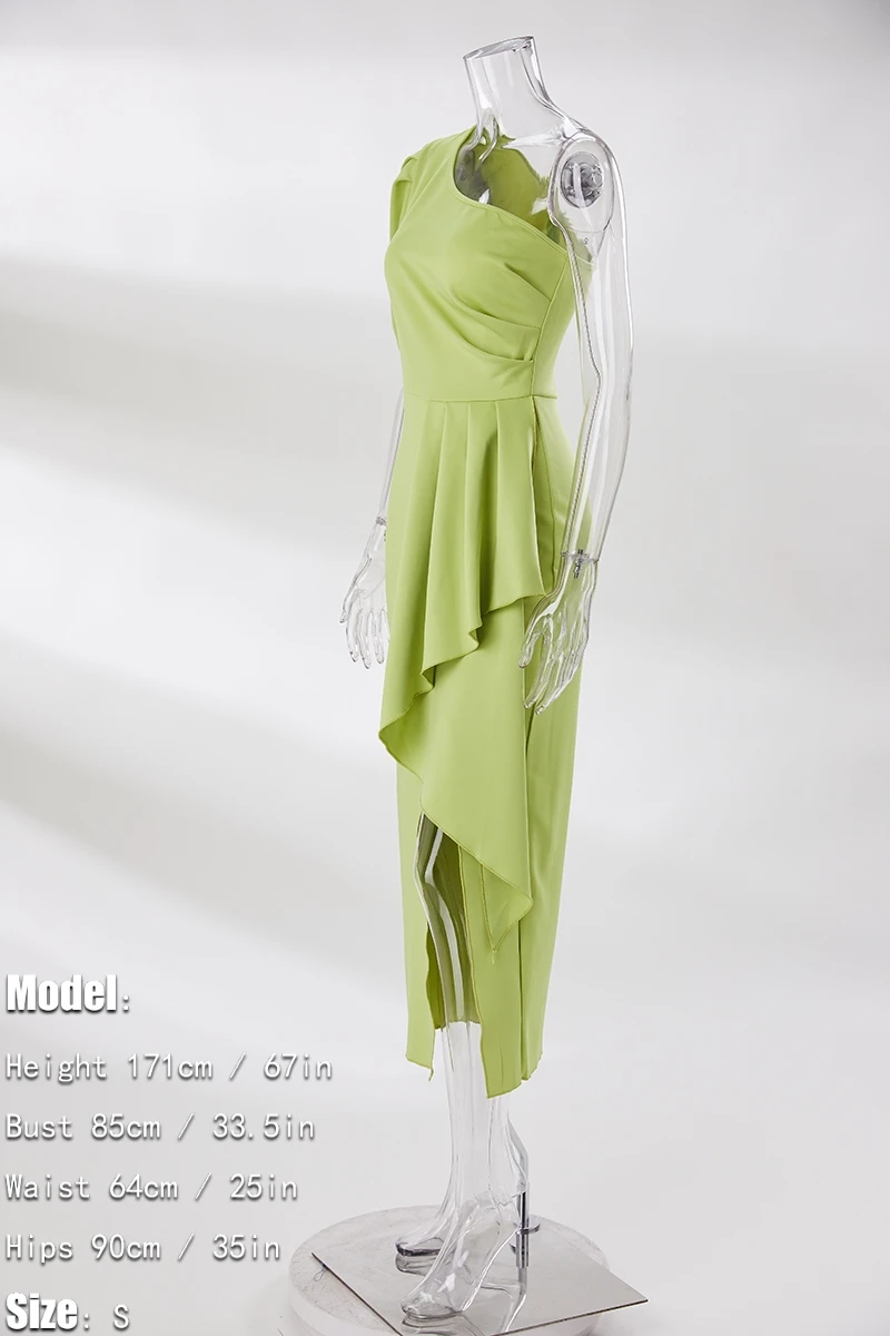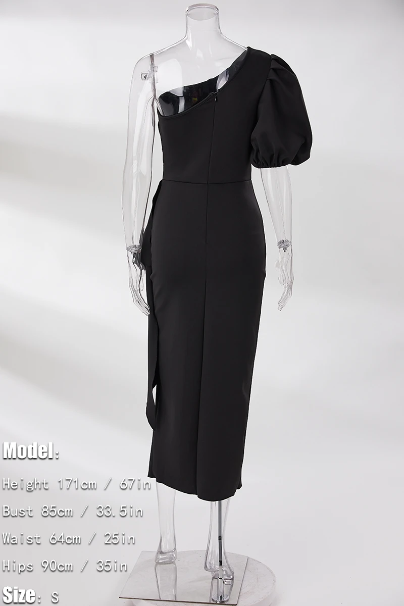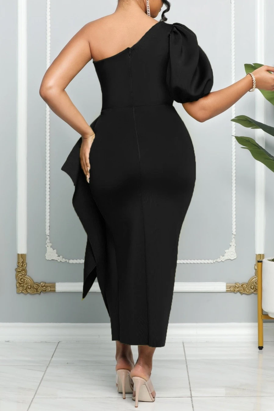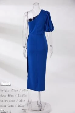 New 4 colors stretch one shoulder ruffle back zip-up split stylish midi dress